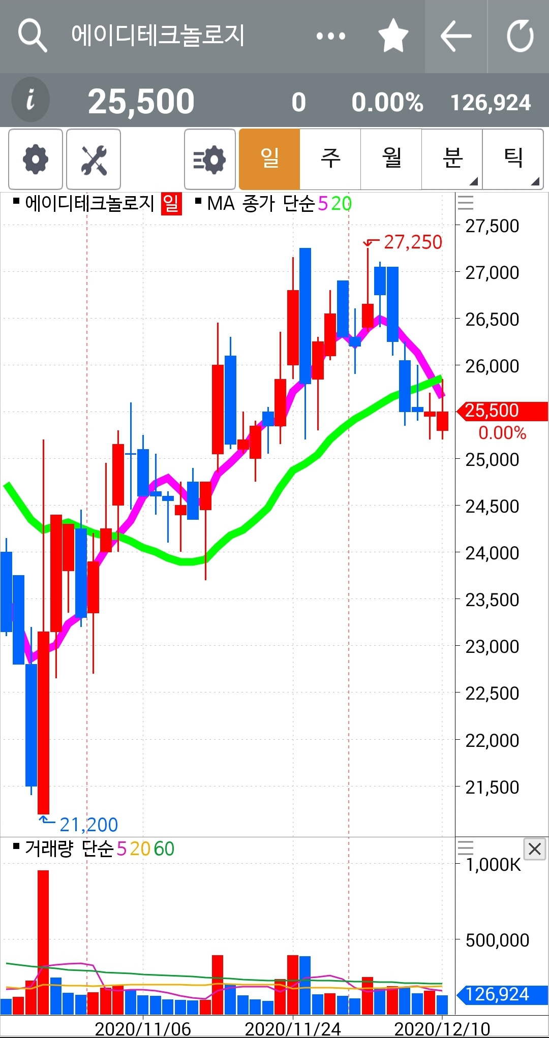 에이디테크놀로지. 빨리 올라가라! 경고한다! 경고 경고. 내 그렇게 빨리 올라가야 한다고 다그쳤건만 막무가내로 빌빌대더니 드디어 오늘 5일선이 20일선 아래로 삐죽 내려왔다. 빨강선이 초록선 아래로 내려서는 순간 나의 손가락은 자동 빵!으로 날아간다. 탈락! 그렇게 에이디테크놀로지는 나의 관심 밖으로 밀려났다. 잘 가거라~ 안녕.