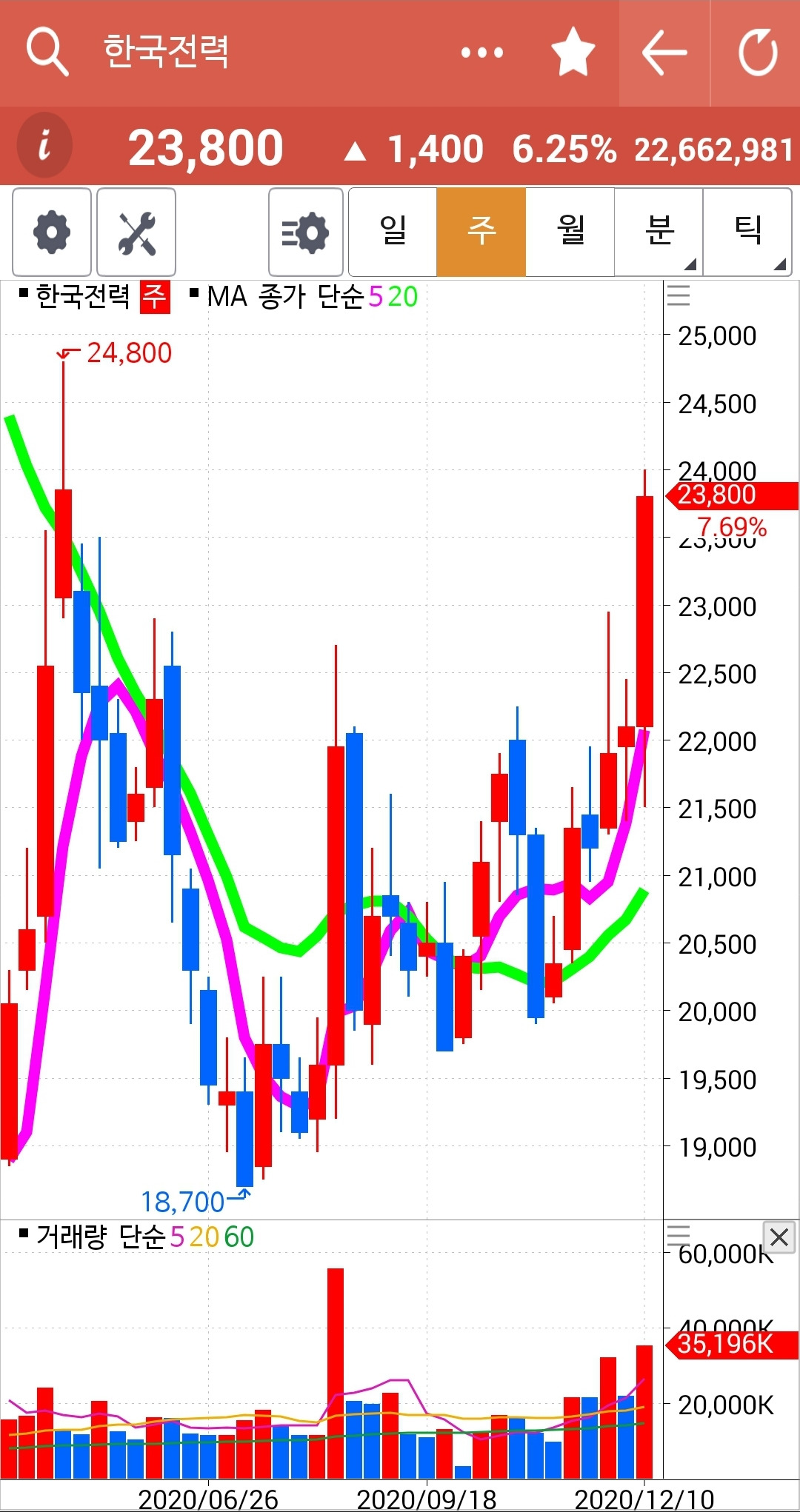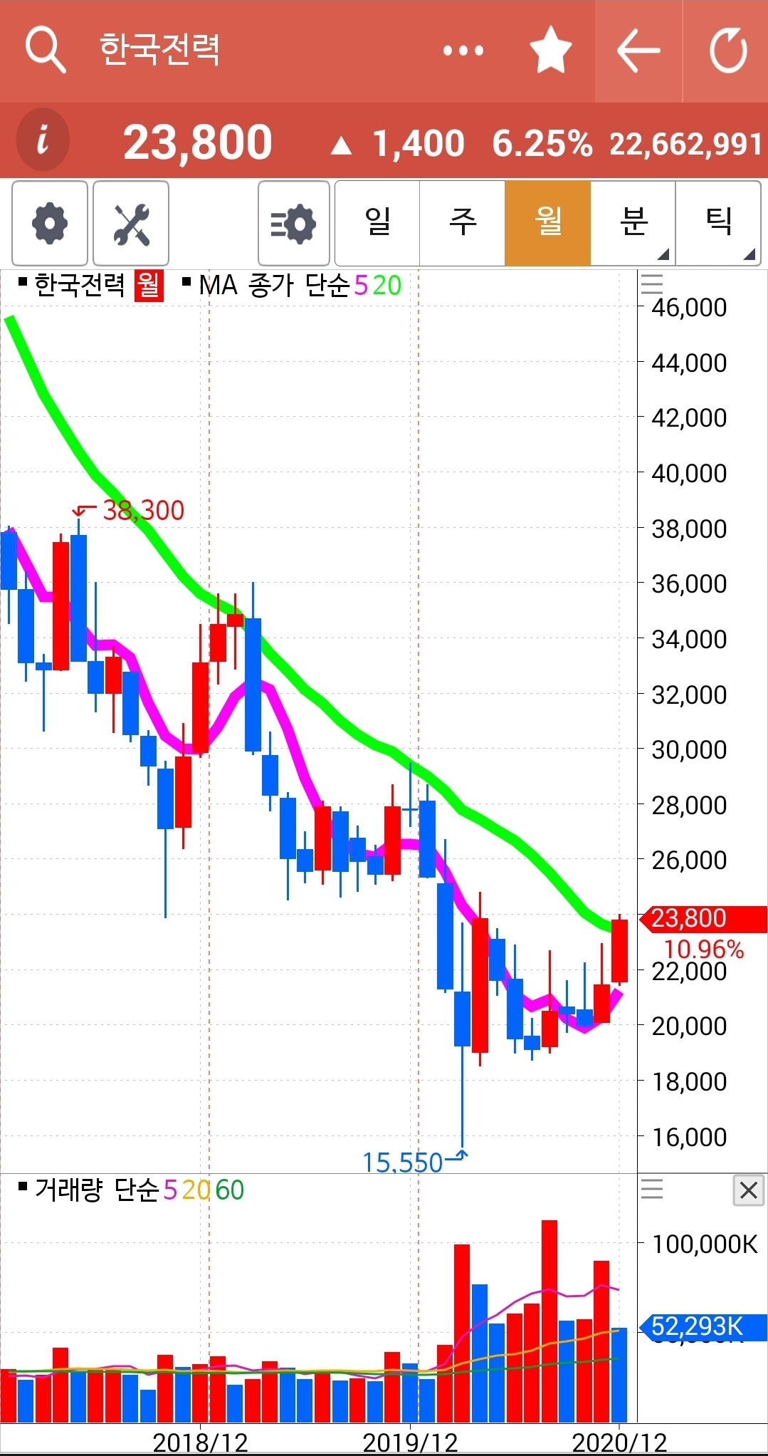 한국전력. 어제 빵! 오르더니 오늘도 빵빵! 더 크게 올랐다. 전고점을 아주 가볍게 눌러버렸다. 기세가 만만치 않다. 거래량도 빵! 늘었다. 정말 멋진 모습이다. 파이팅. 주봉도 잘 올라가고 있고 월봉은 드디어 길고도 긴 하락 20개월선을 주가가 위로 돌파하고 있다. 5개월선은 이미 위로 방향을 틀었다. 오예! 하하 파이팅! 응원합니다~