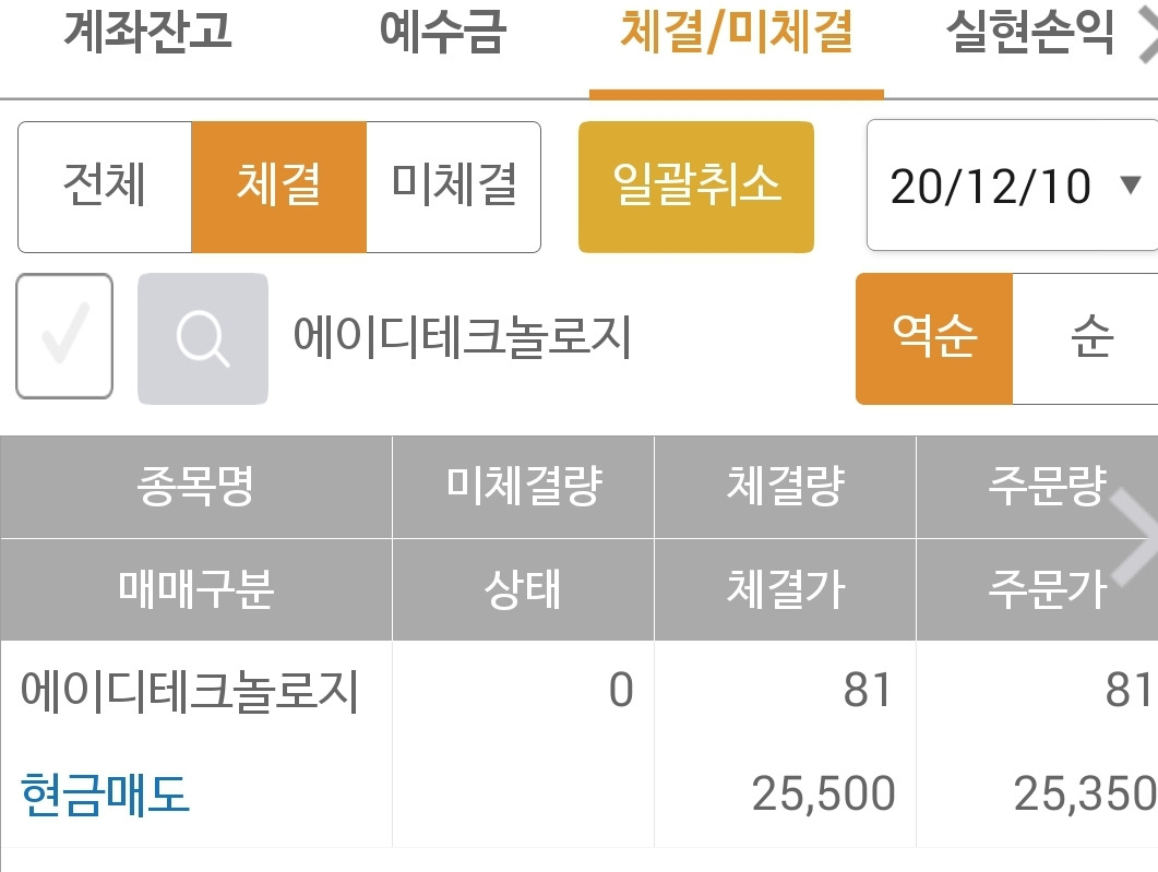 사진 2. 체결내역. 에이디테크놀로지가 나의 경고에도 불구하고 밍그적 안 올라가더니 급기야 5일선이 20일선을 뚫고 내려와 가차 없이 탈락당한 모습이다.