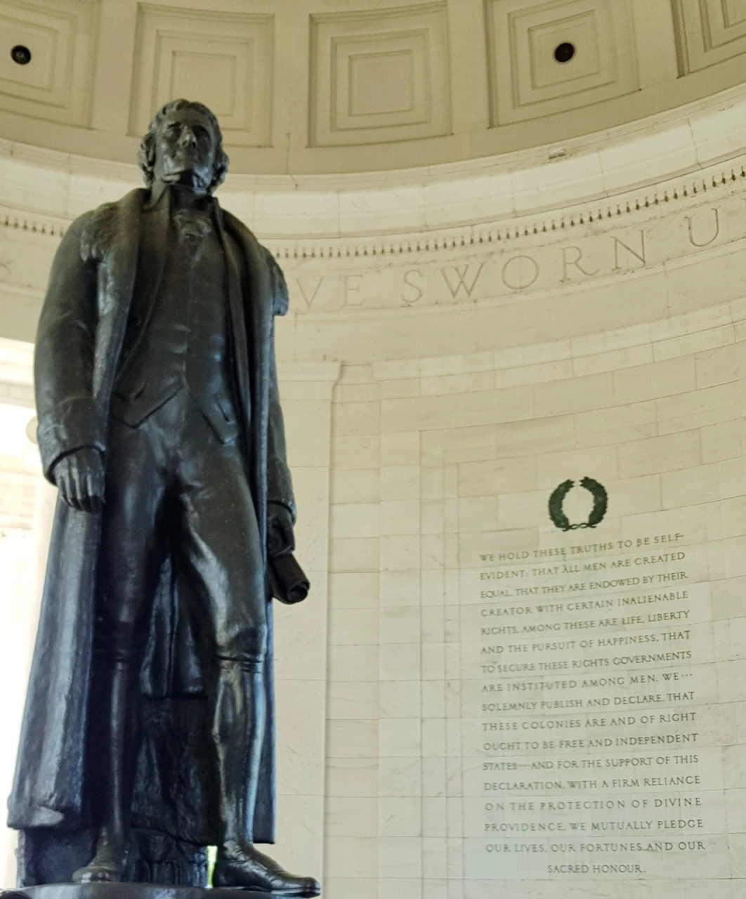 오마 낫. 저 ~ 뒤로 오벨리스크. 우리가 막 보고 온 워싱턴 기념탑. 그렇다!!! 저 워싱턴 기념탑의 특징은 시내 어디서고 볼 수 있다는 것이다. 링컨 기념관 앞에서 봤듯이 이곳 제퍼슨 기념관 앞에서도 또렷이 아주 잘 보인다. 사방이 뚫려서일까? 바람이 바람이 어떻게 할 수 없게 세게 분다. 모자도 날리고 머리카락도 날리고 정신이 하나도 없다. 엣 헴. 까짓 바람에 질쏘냐. 전진~ 앞으로 전진~ 강한 바람에 우리들 머리는 산발이 되고~ 그래도 전진에 전진을 거듭한 결과 드디어 보이기 시작하는 토마스 제퍼슨 대통령