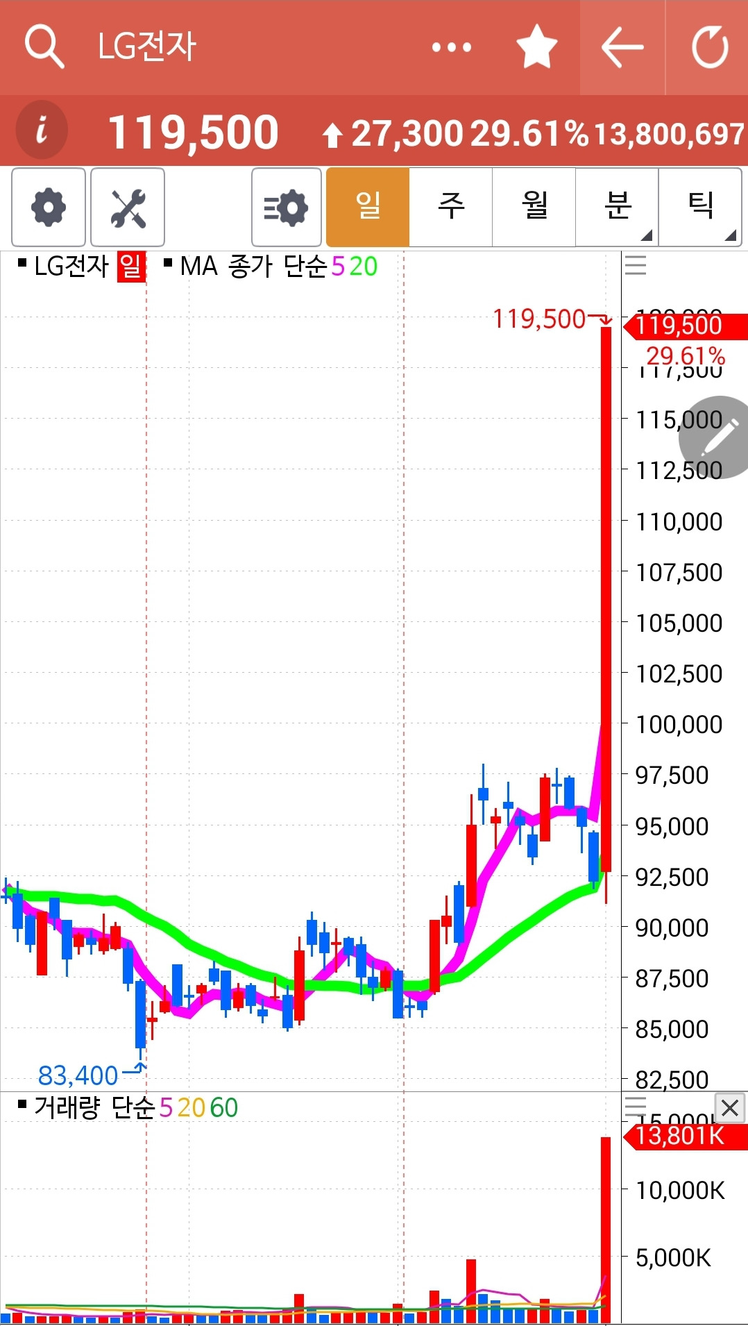 사진 3. 오늘 빵 튀어 오를 때 LG전자에 편승한 현장.