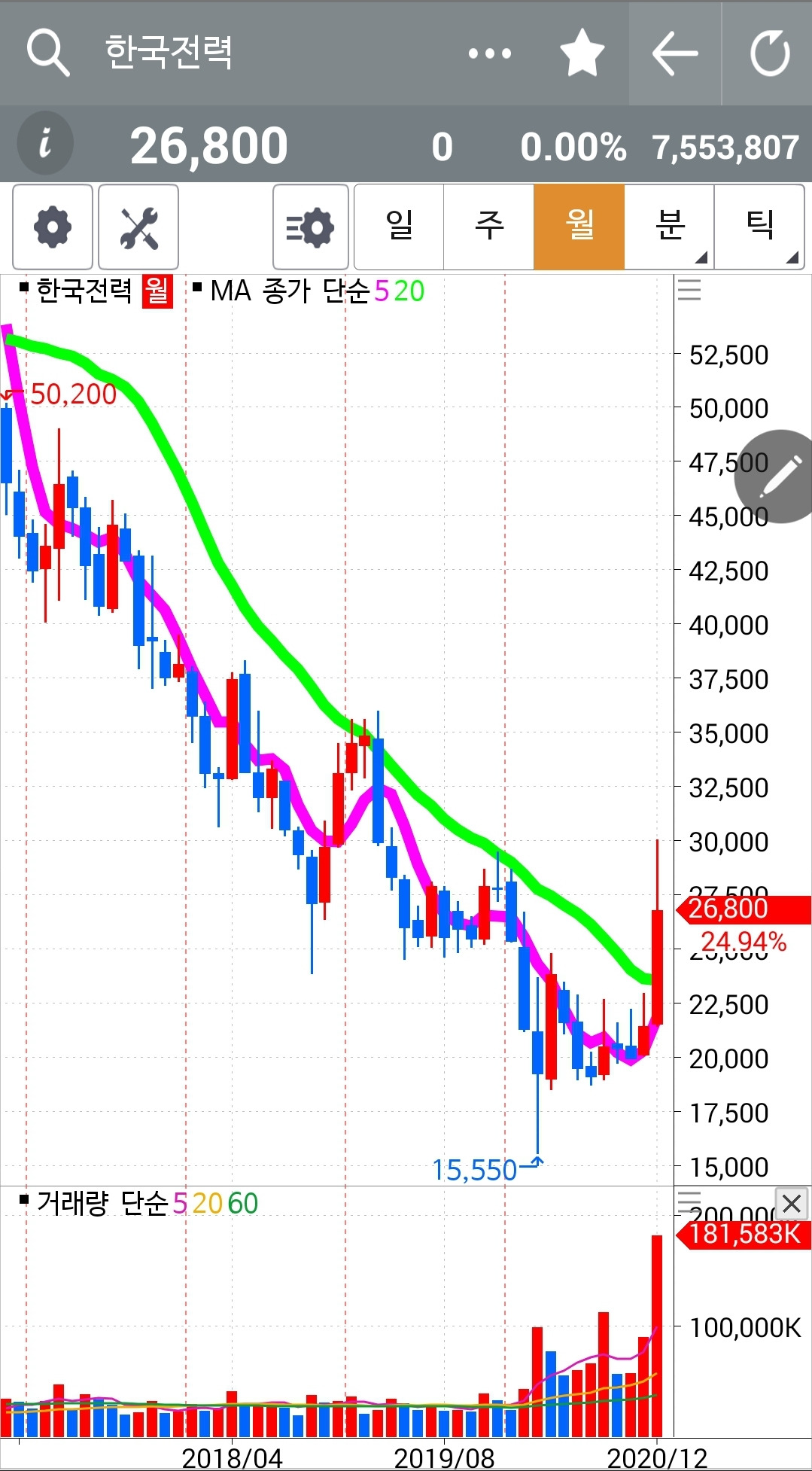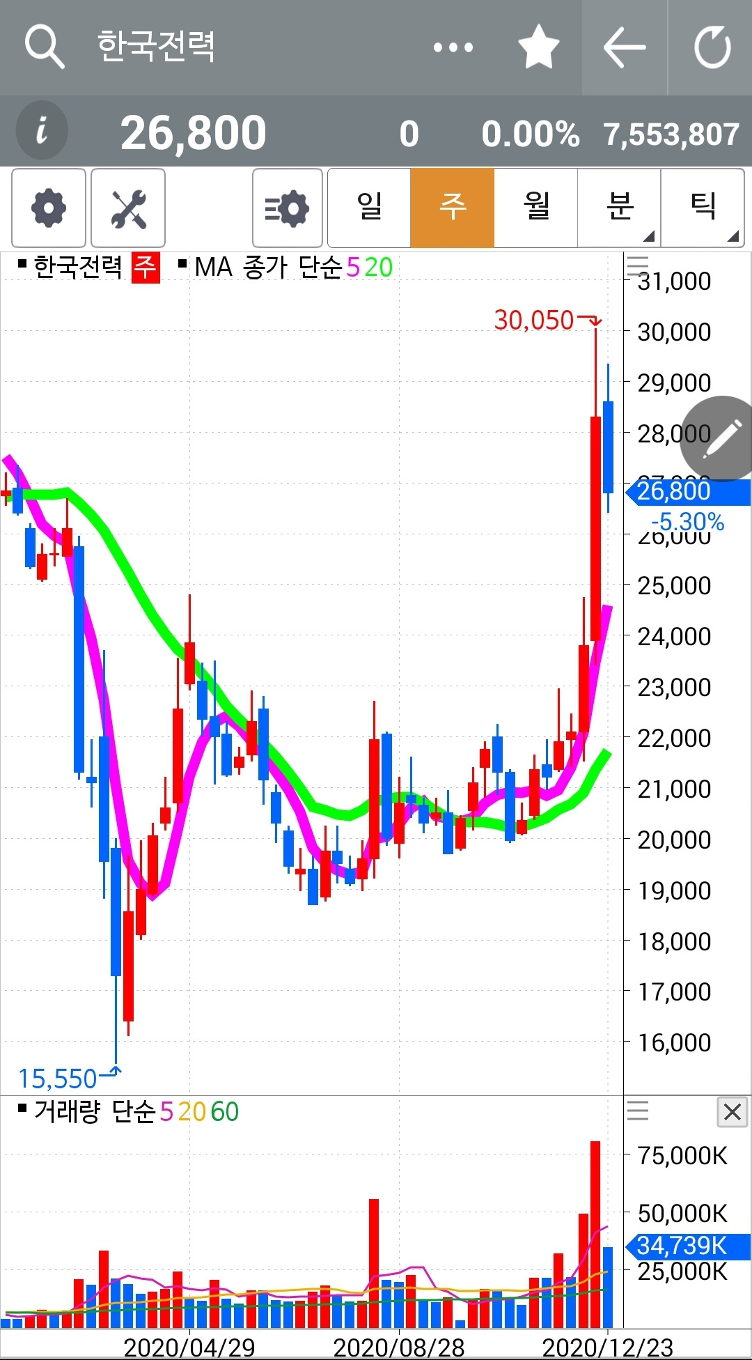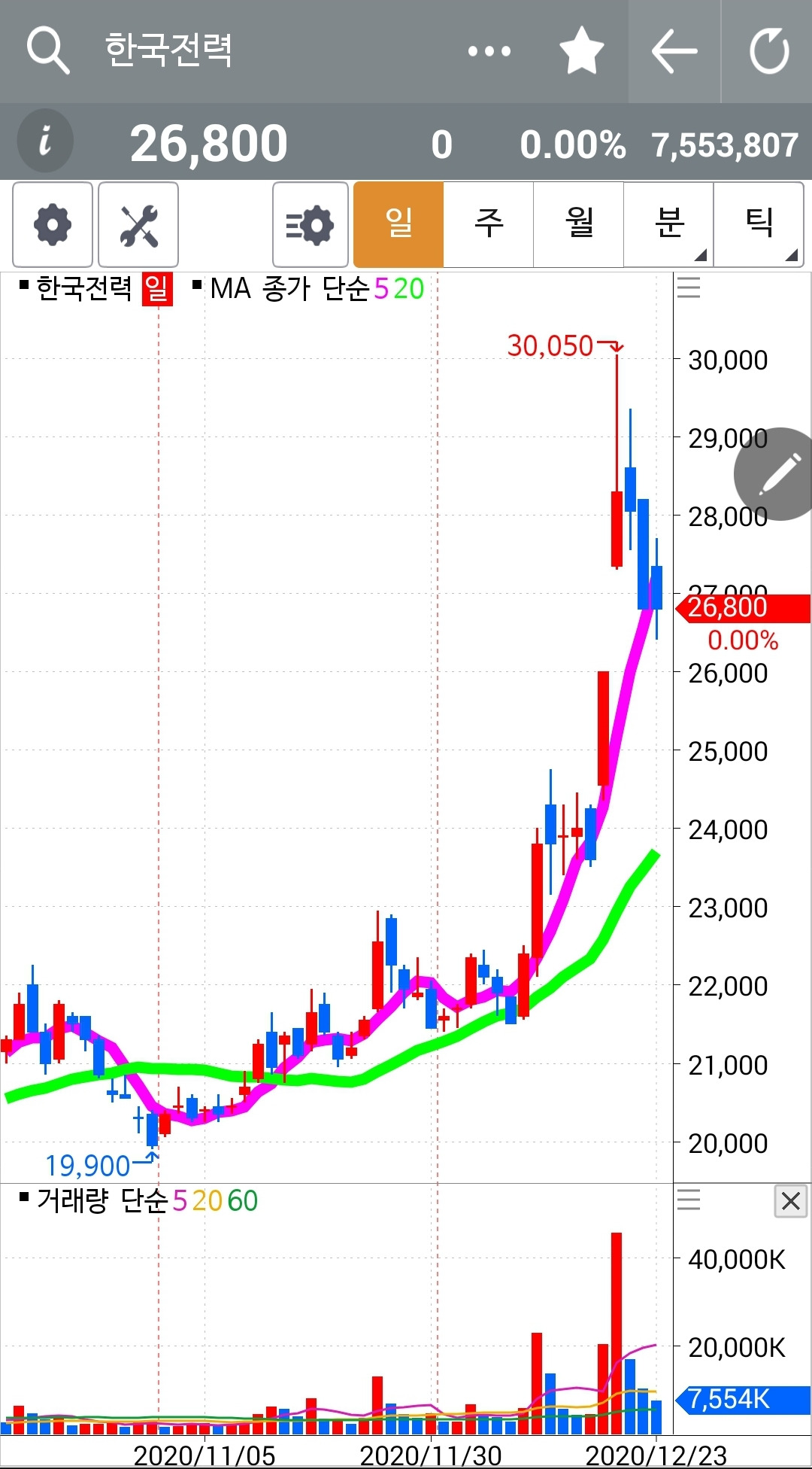 5일선이 20일선 위에 있으므로 계속 보유 중인 한국전력이다. 그래. 현물 주식에서라도 꼭 지키리라. 바로 요거. 난 아무것도 몰라요 5일선이 20일선 위면 매수 유지일 뿐야요~ 푸하하하