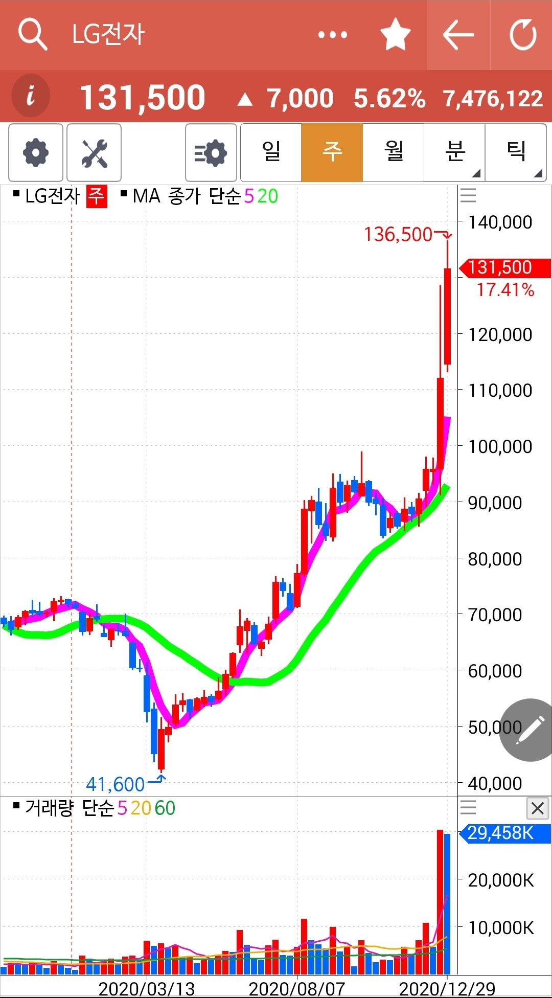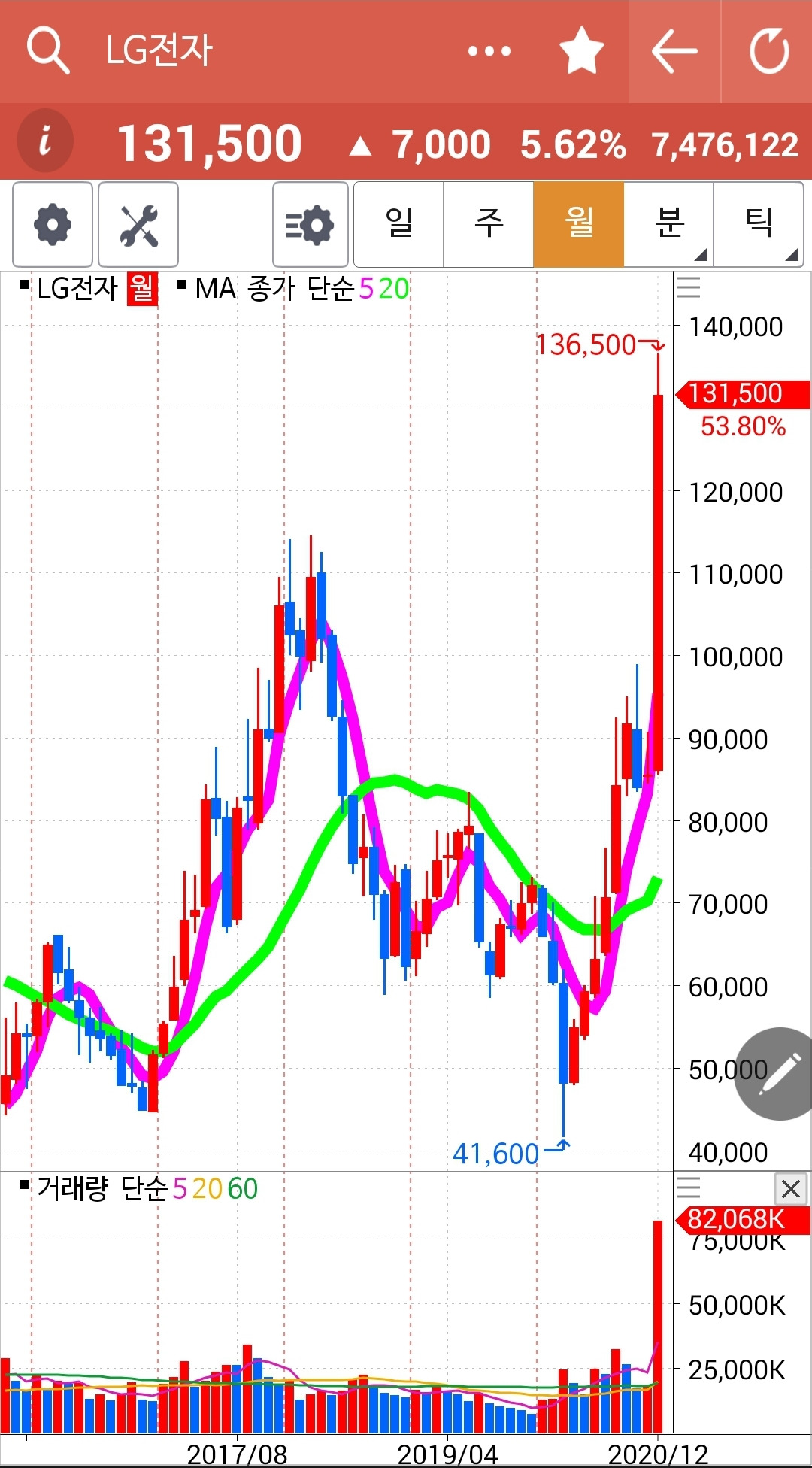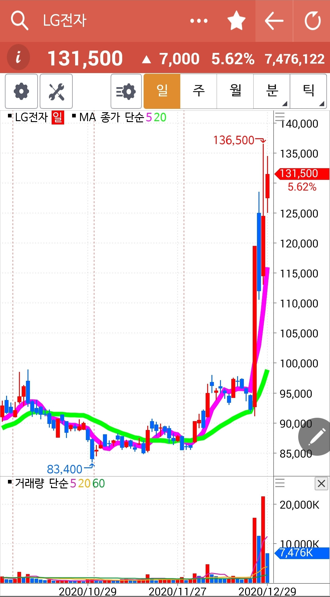 LG전자. 쭉쭉 빵빵 올라가는 이걸 건드릴 필요 하나 없다. 가는 데 까지 함께 가는 거다. 선물은 리스크가 커서 배짱 있게 그렇게 못한 것이 많이 아쉽다. 그래도 할 수 없다. 이익을 챙긴 거니까 너무 아쉬워말자. 다만 현물 주식은 끝까지 가보자. 난 아무것도 몰라요 5일선이 20일선 위에 있으면 매수 유지일 뿐야요~ 그래. 파이팅!