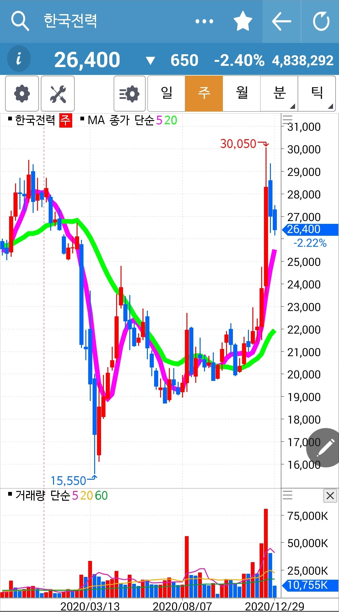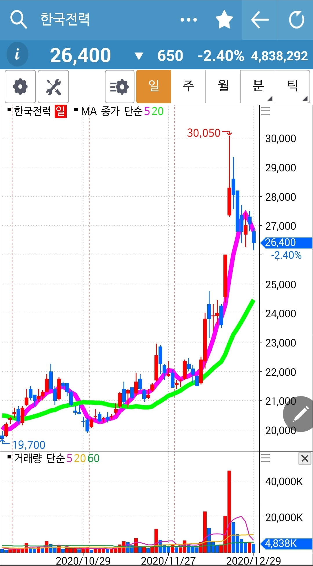 한국전력. 5일선이 20일선 위에 있으므로 나의 할 일은 아무것도 없음. 난 아무것도 몰라요 5일선이 20일선 위에 있으면 매수 유지일 뿐야요~