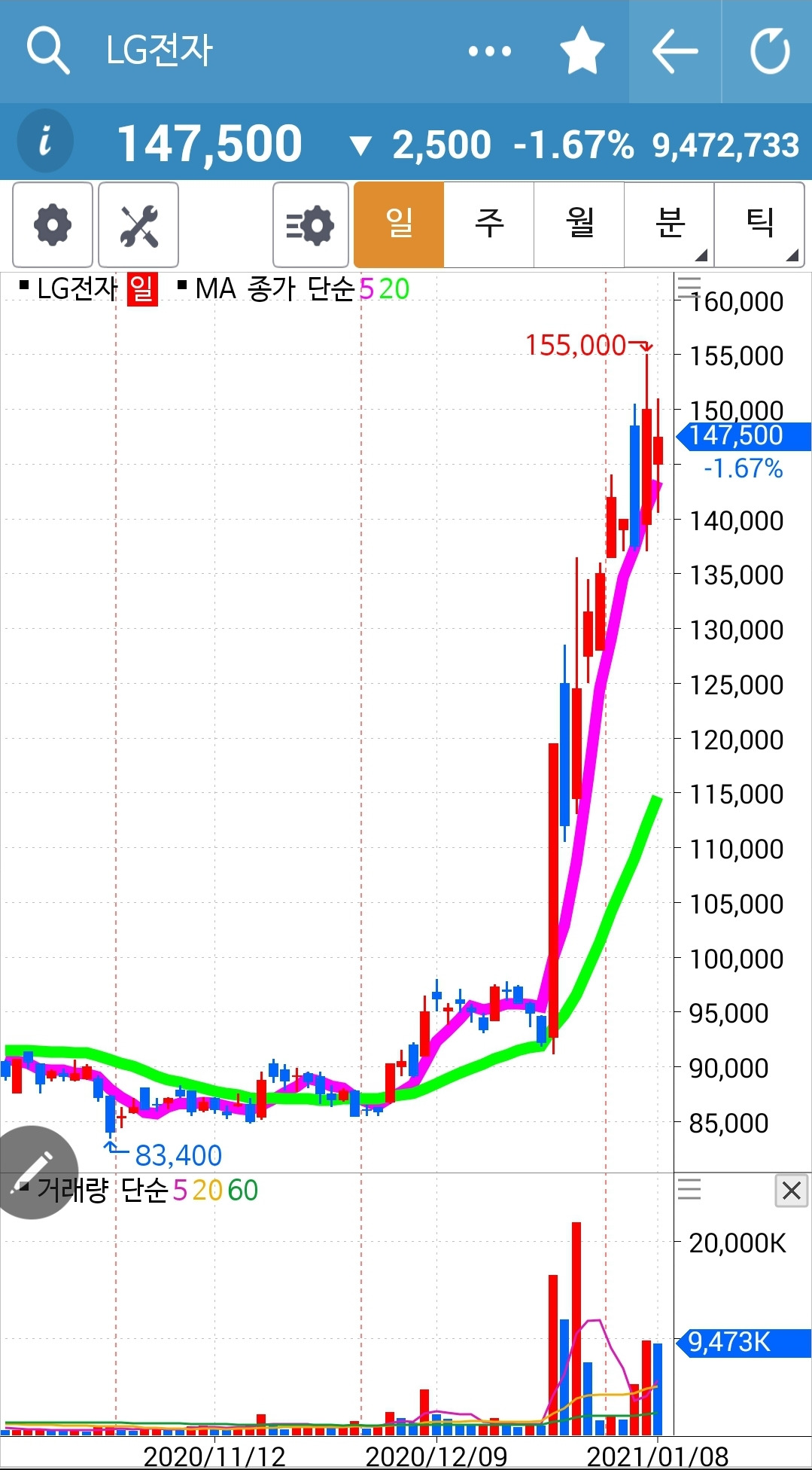가파르다는 느낌일 뿐 그 어디도 매도신호는 없다. 난 아무것도 몰라요 5일선이 20일선 위면 매수 유지일 뿐 야요~ 그래. 매도신호 나올 때까지 가는 거다. 파이팅!