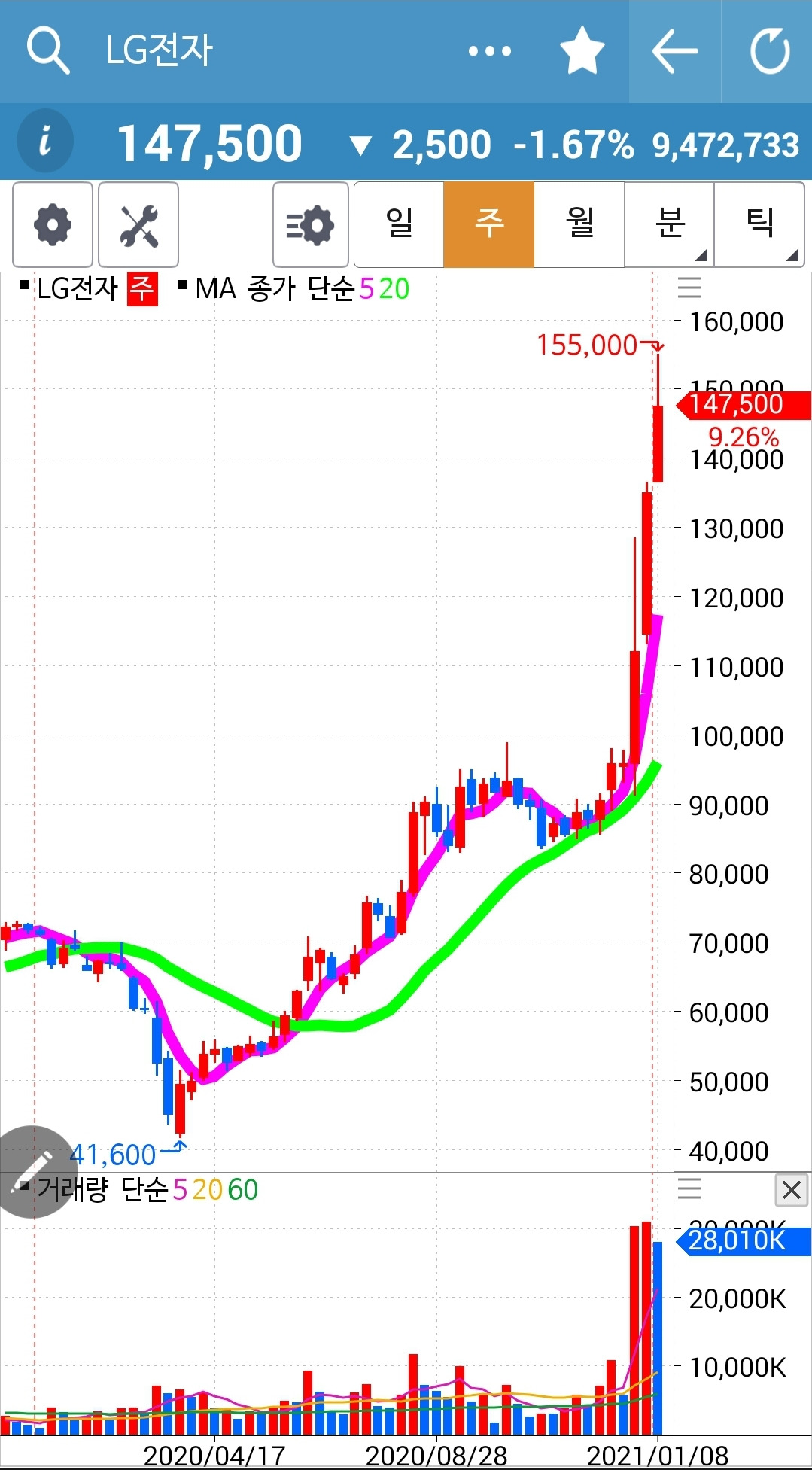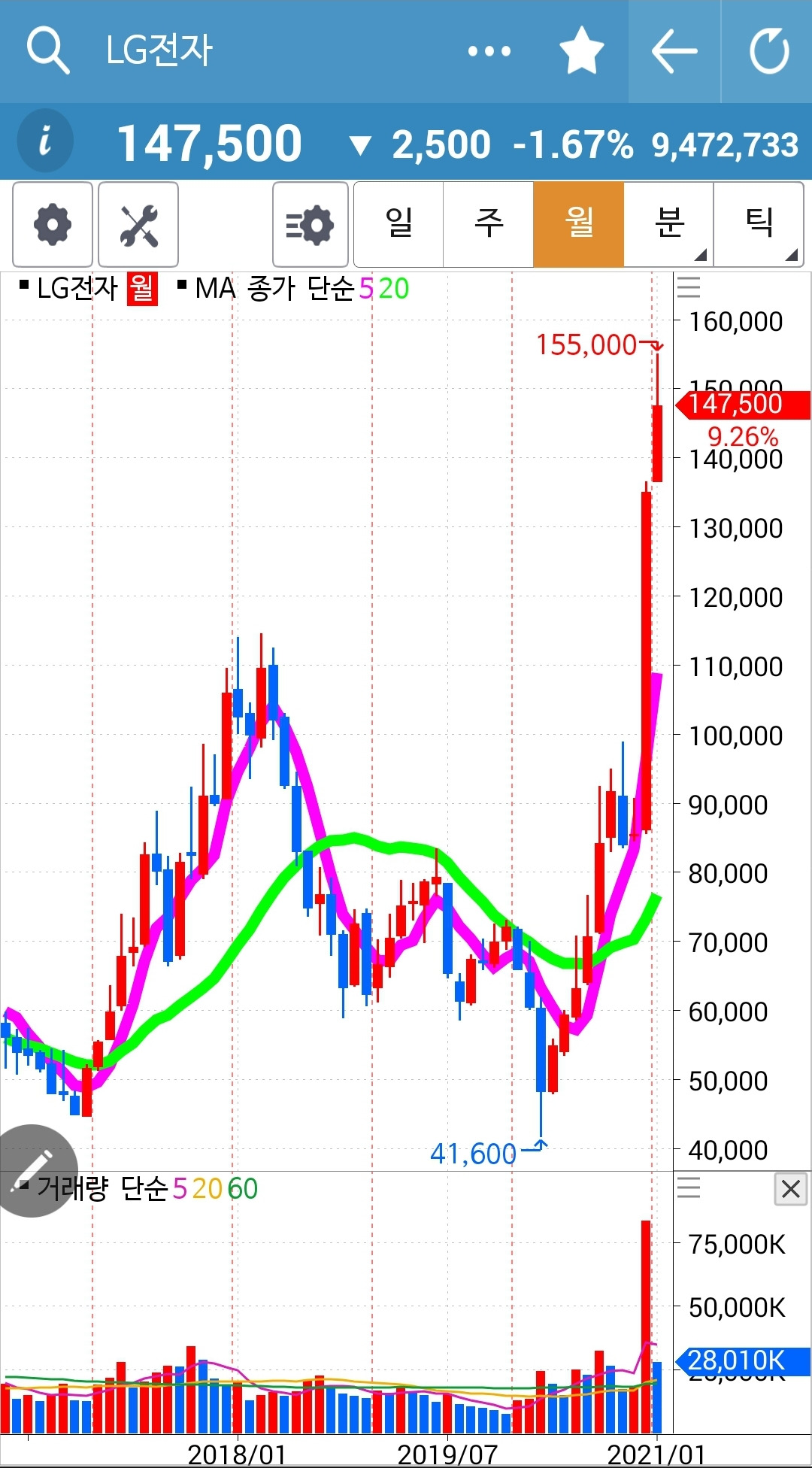 오홋 드디어 월봉이 힘차게 20일선을 뚫고 올라갔다. 5개월선도 20개월선을 조만간 뻥! 뚫으리라. 그래. 아직 아무 매도신호 없다. 고우 고우.