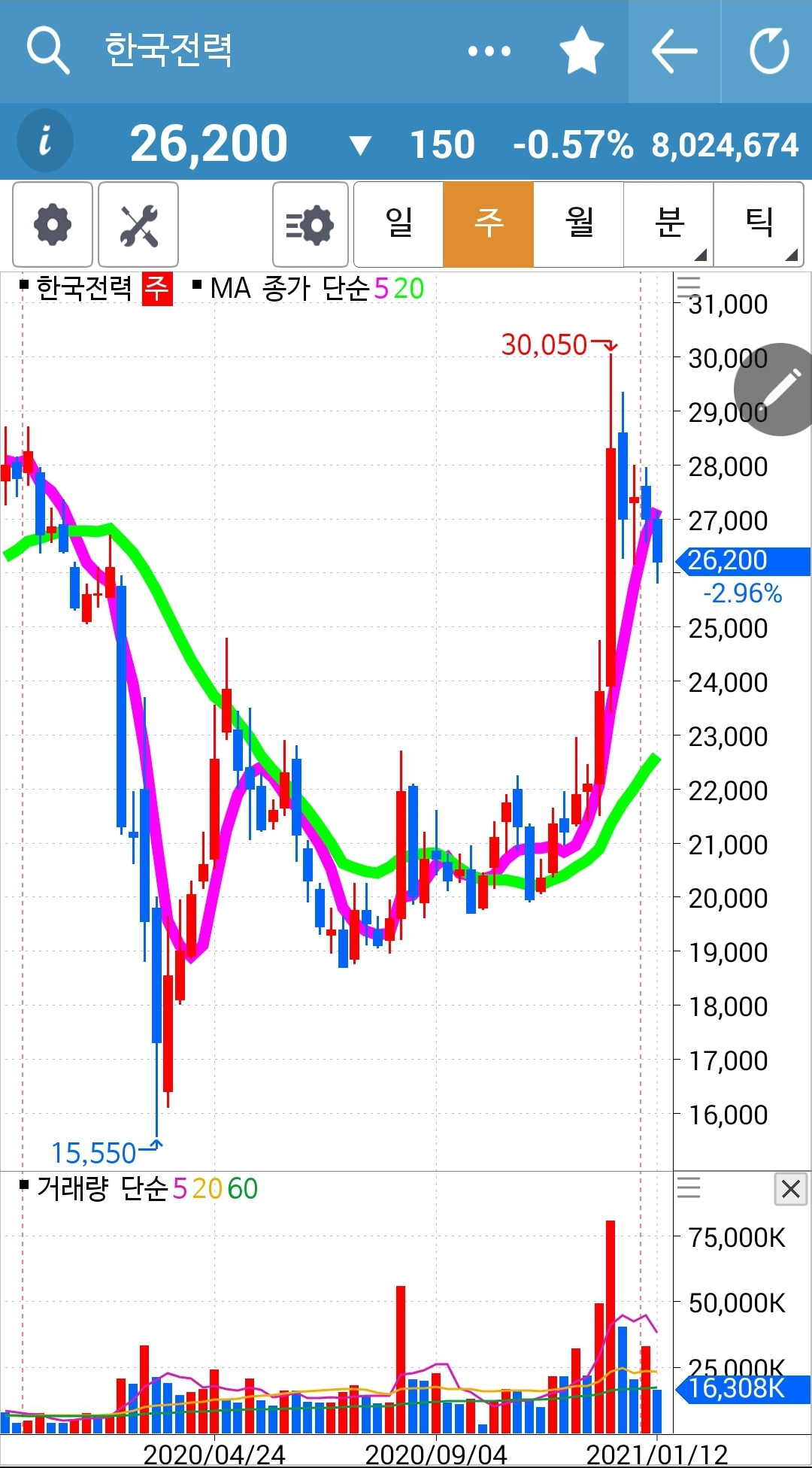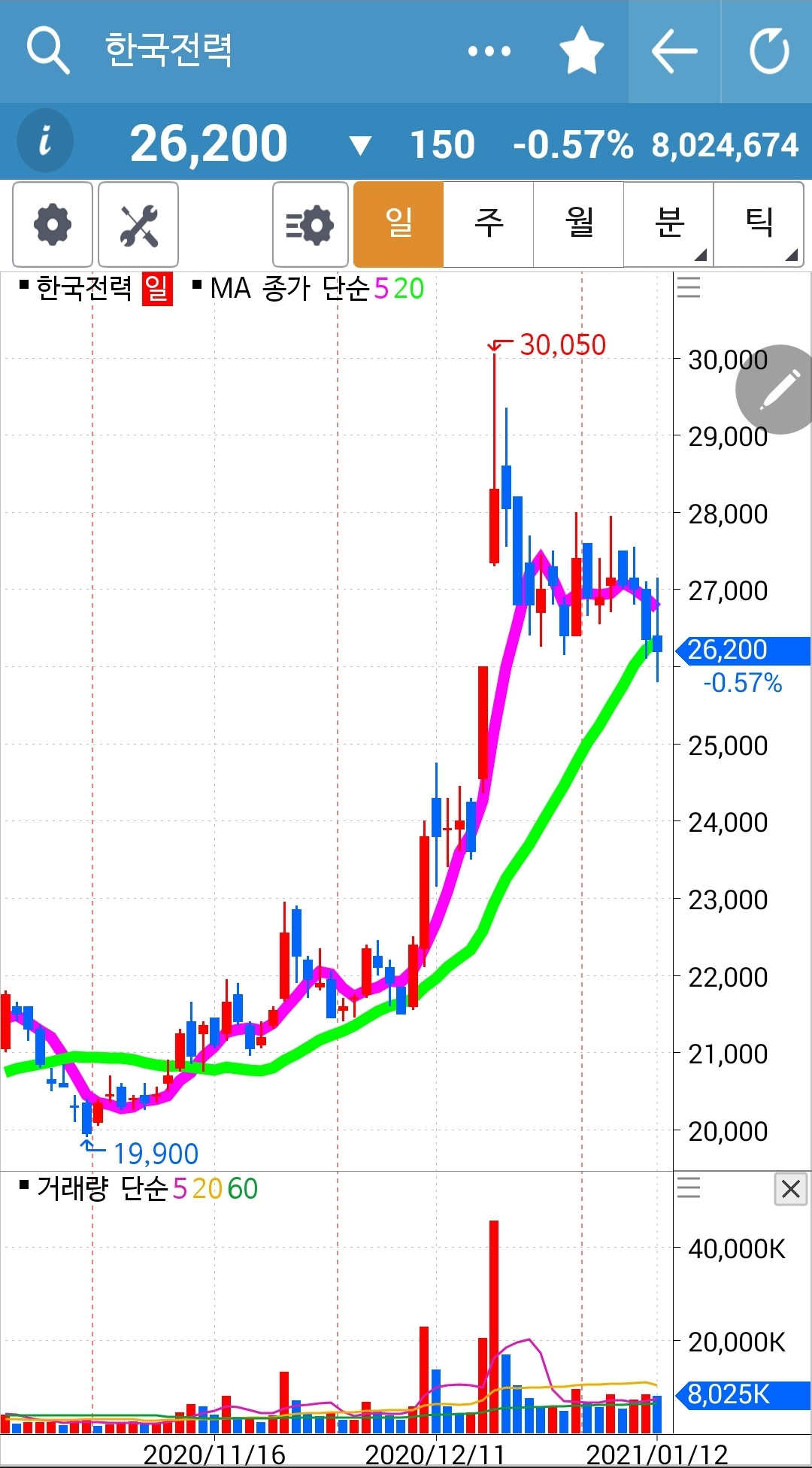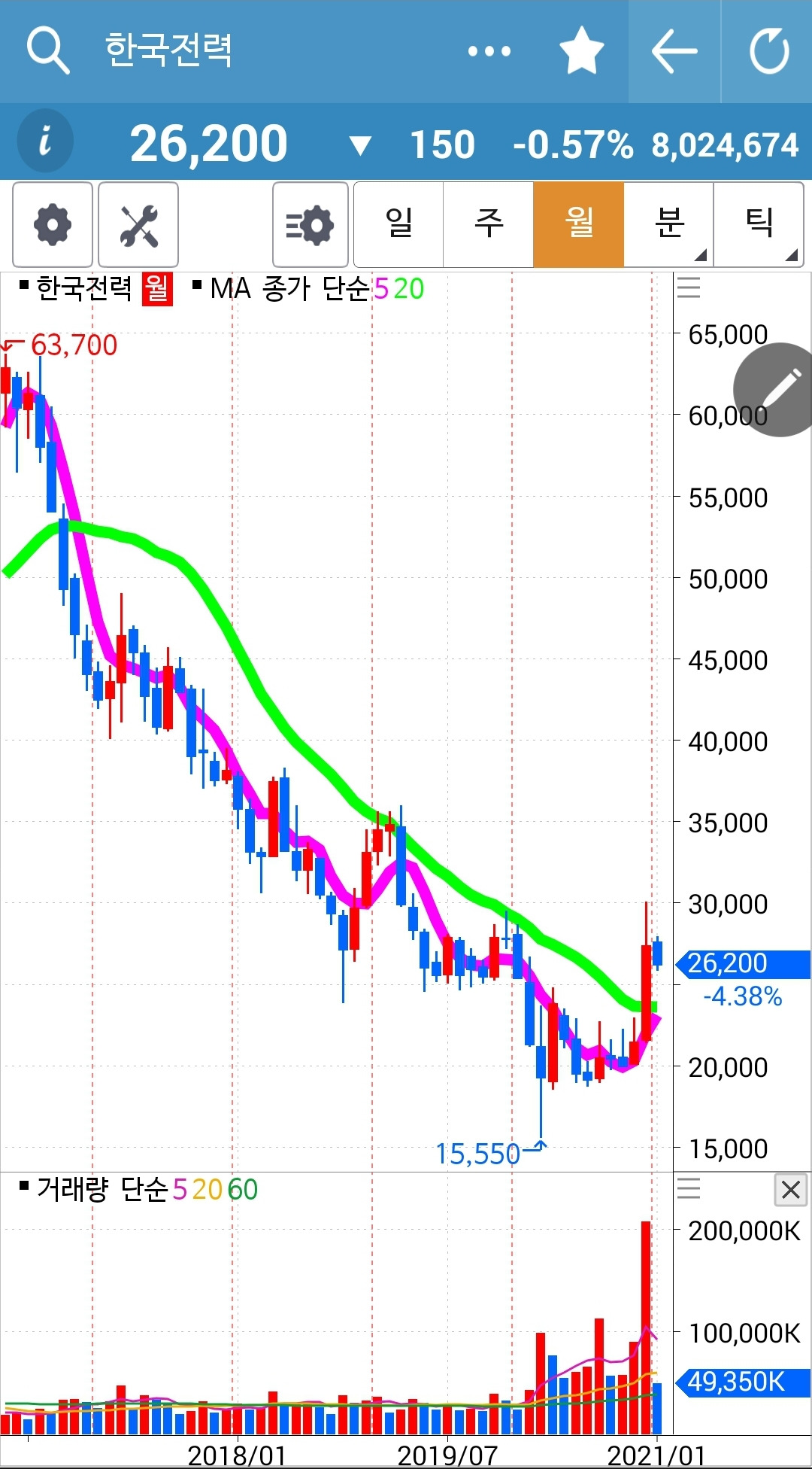 주가가 20일선 아래로 내려와 버렸다. 그러나 아직 5일선은 20일선 위에 있으니까 내가 할 일은 없다. 와이? 난 아무것도 몰라요 5일선이 20일선 아래로 내려가야 매도할 뿐야요~ 니까. 일봉 주봉 월봉 그 차트의 모습을 자꾸 보면서 흐름을 익히리라. 월봉을 보면 아래로 아래로만 가던 주가가 드디어 20개월선을 빵! 뚫고 올라오는 것을 볼 수 있다. 많은 가능성이 있다는 말이다. 파이팅!!!