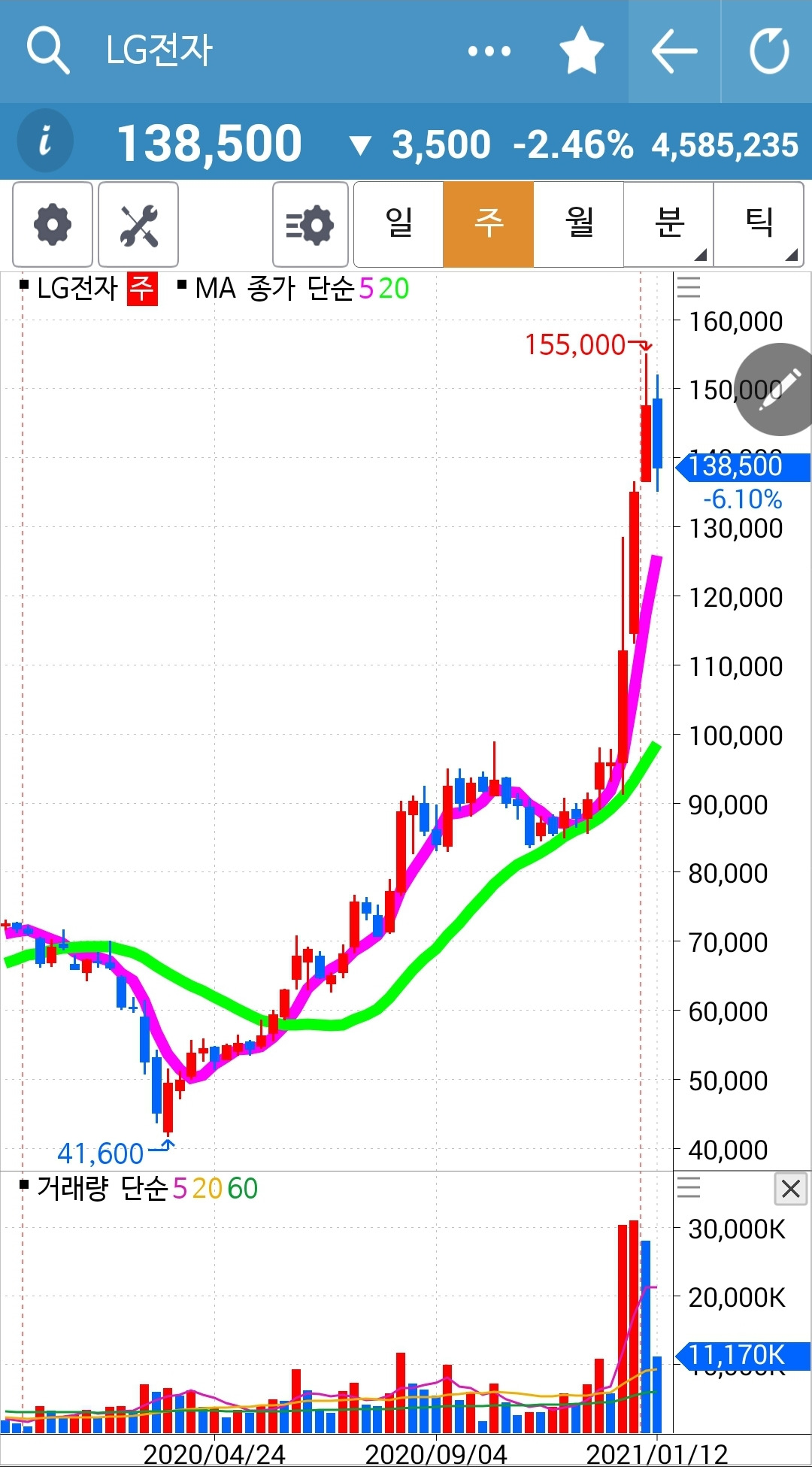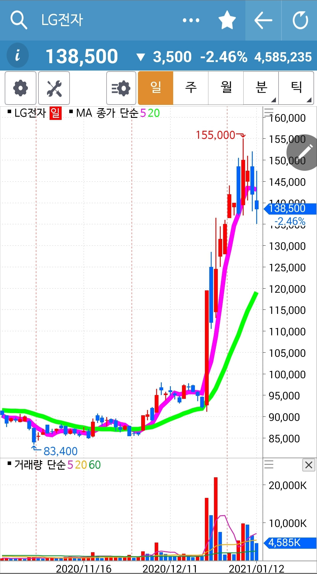 나의 사랑 LG전자. 숨 고르기를 하고 있는데 너무 가파르게 올랐으니 많이 쉬어주지 않을까 싶다. 그래도 아직 난 아무것도 할 수 없다. 와이? 난 아무것도 몰라요 5일선이 20일선 아래로 내려가야 매도할 뿐야요~ 니까. 5일선이 20일선 아래로 꽝! 충돌하며 내려가기 전까진 난 그대로 관망만 해야 한다. 그러나 언제라도 꽝! 부딪는 날엔 가차 없이 뛰어내리리라. 그래. 그것만 할 줄 알면 이 주식시장에서 살아날 수 있어. 살아만 있으면 그 언제라도 대박이 날 수 있지. 그래 오늘 도 파이팅!
