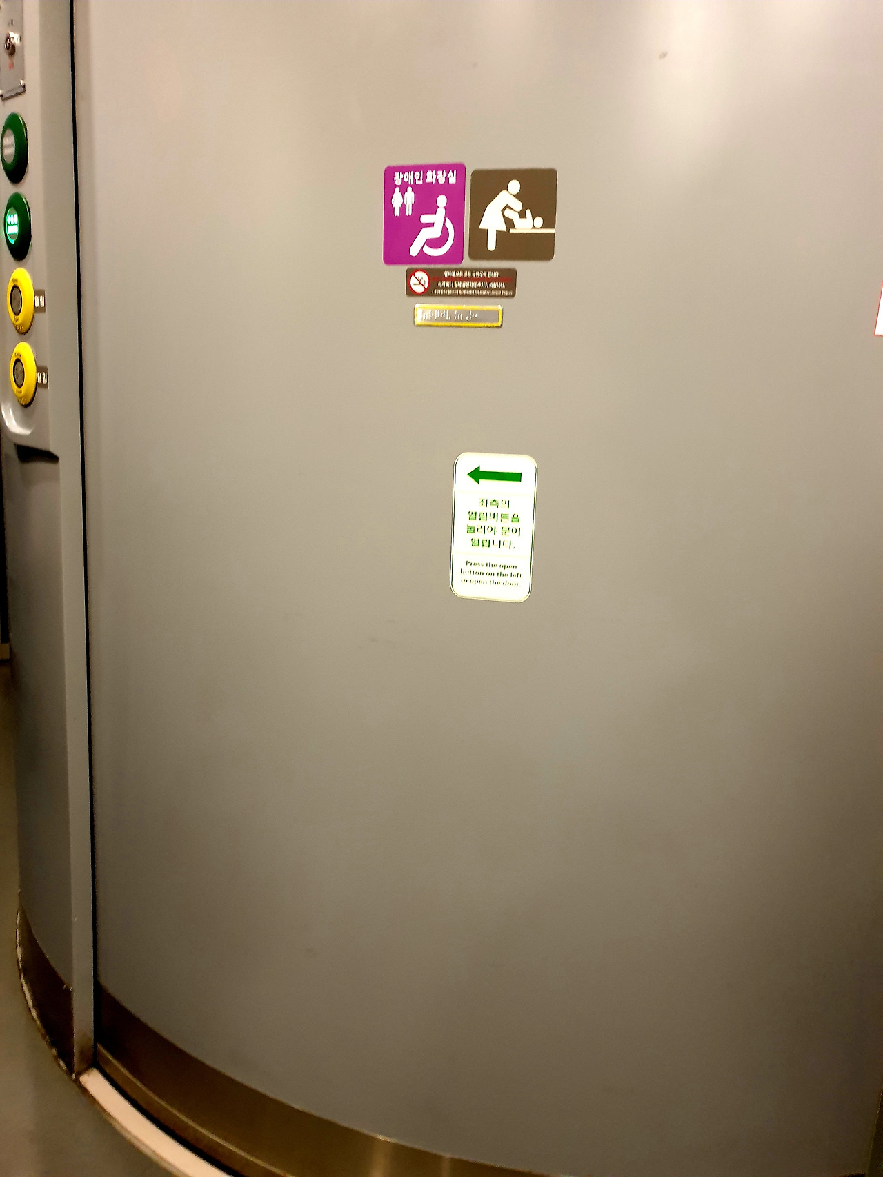 적은 사람들이지만 그래도 단 한 명이 있을 지라도 화장실에 들어가기 위해 노란 열림 버튼을 누르는 순간 드드드드 하며 그 거창한 화장실 문이 쫘악 열리기에 여간 부끄러운 게 아니다. 그 부끄러움을 무릅쓰고 겨우 화장실 안에 들어갔다. 들어가서 닫힘을 누르니 드드드드 거대한 문이 닫힌다. 좀 빨리 닫히면 좋겠건만 어찌나 느린지 에고.
