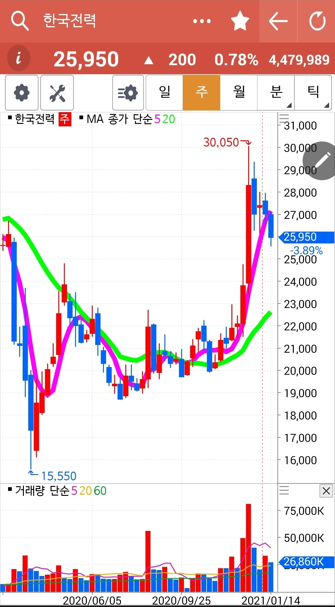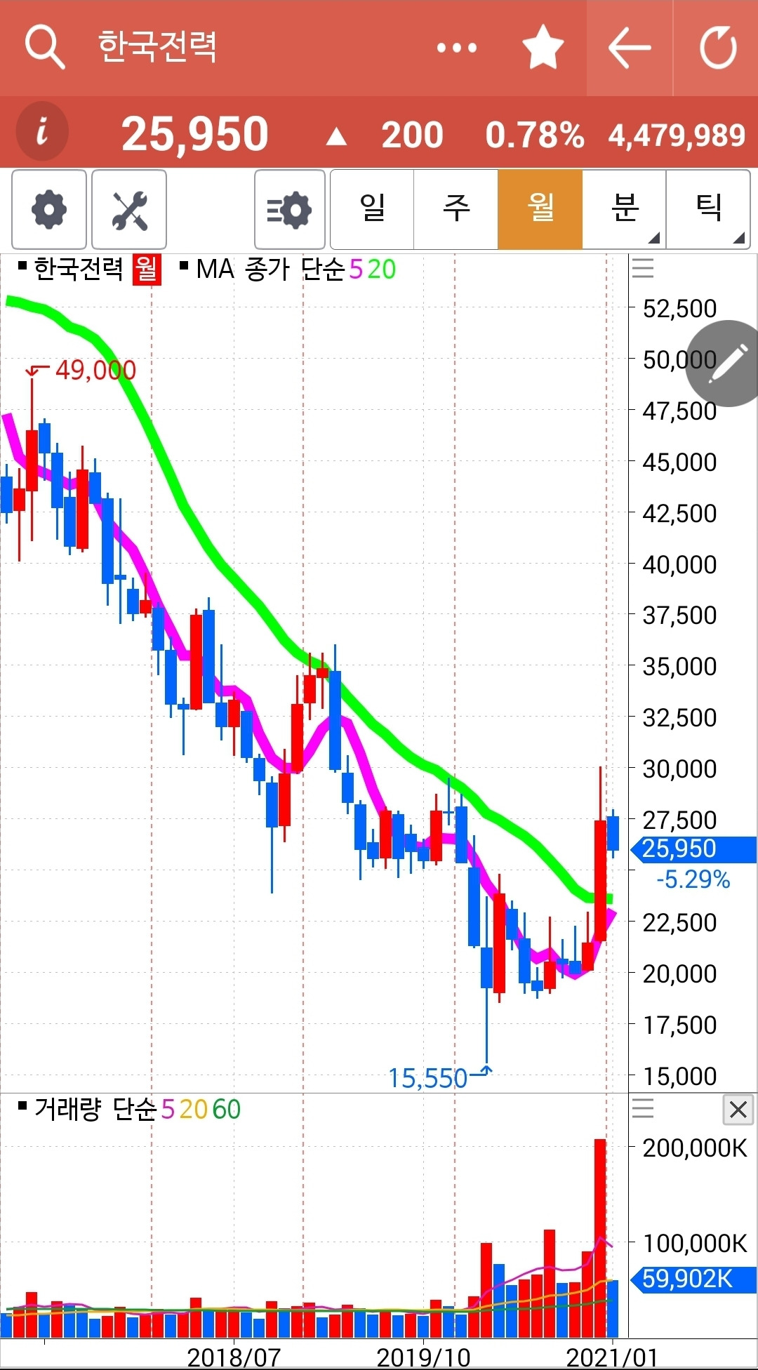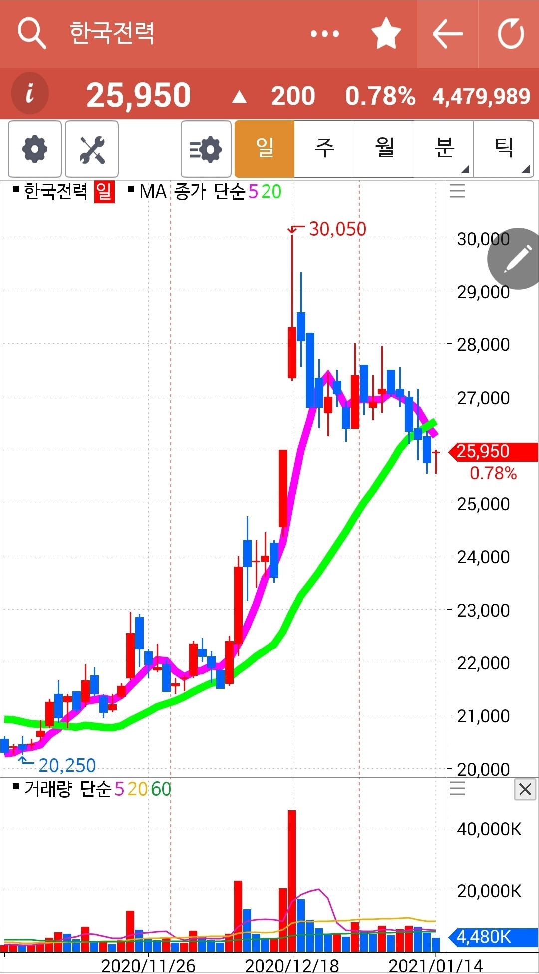 장이 끝나고 나서야 빨간 5일선이 연둣빛 20일선 아래로 내려온 걸 발견했다. 시간은 이미 5시를 넘었고. 그래도 다행히 매매할 수가 있었으니 '시간 외 단일가매매'가 있기 때문이다. 어쨌든 5일선이 20일선 아래로 내려간 한전을 탈락시켰다. 잘했다. 원칙을 지켰다. 난 아무것도 몰라요 5일선이 20일선 아래로 내려가면 매도할 뿐야요~