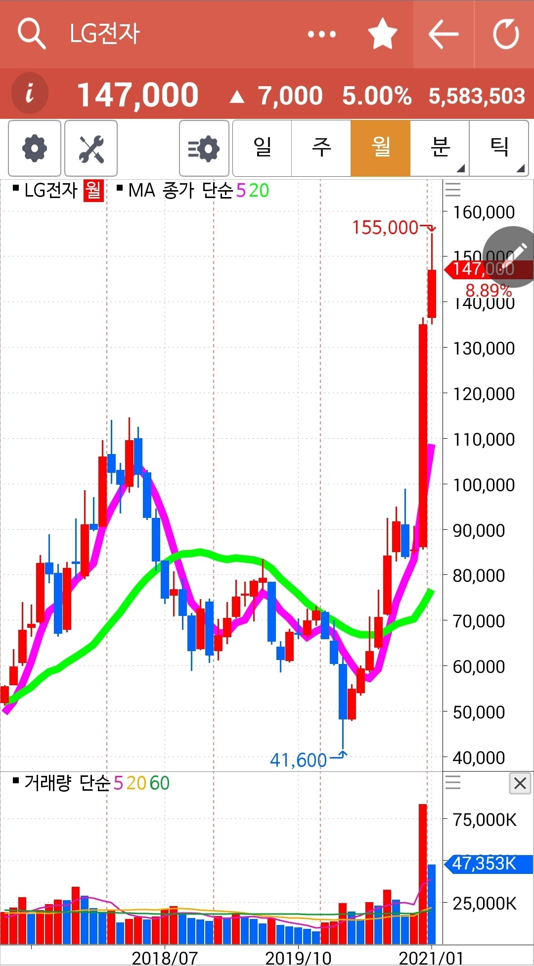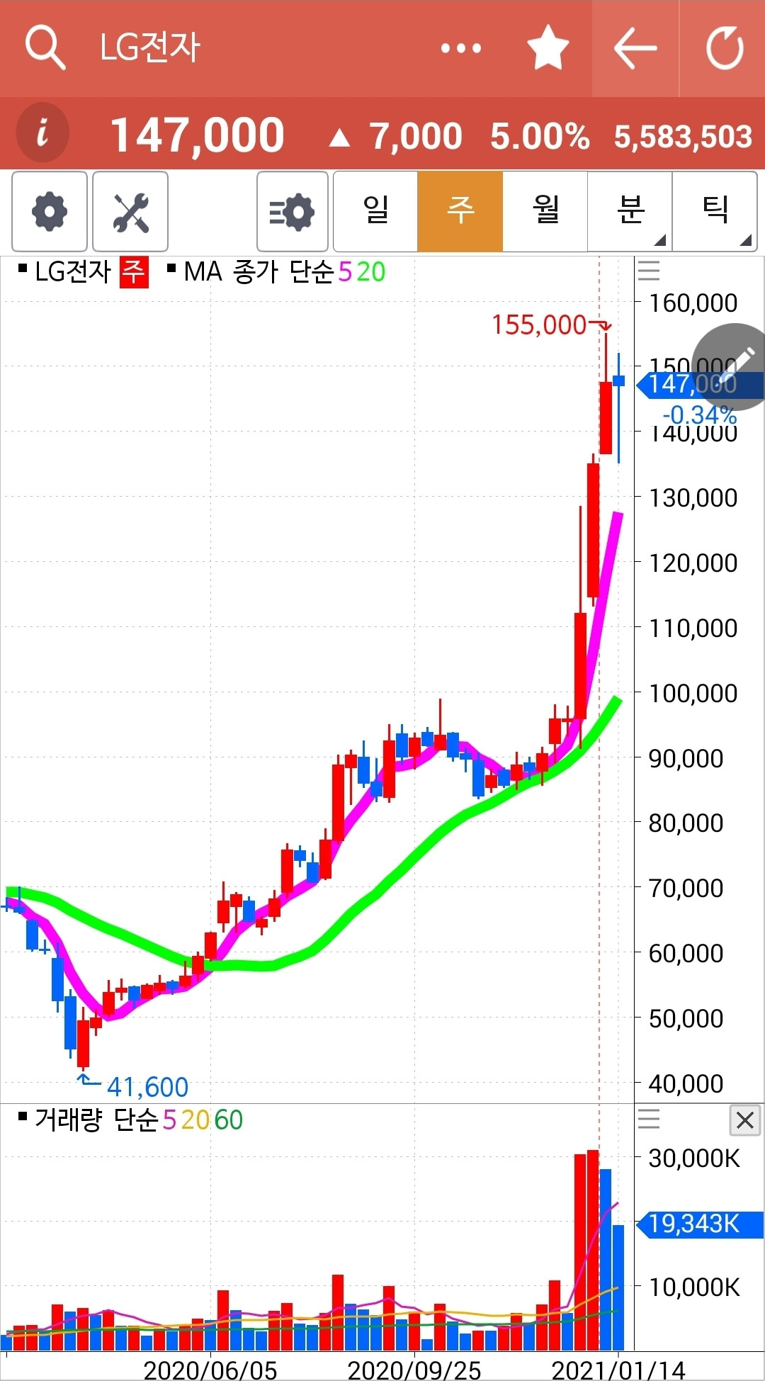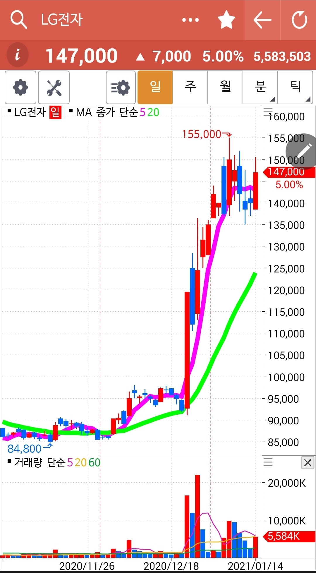 장이 끝나고 나서야 빨간 5일선이 연둣빛 20일선 아래로 내려온 걸 발견했다. 시간은 이미 5시를 넘었고. 그래도 다행히 매매할 수가 있었으니 '시간 외 단일가매매'가 있기 때문이다. 어쨌든 5일선이 20일선 아래로 내려간 한전을 탈락시켰다. 잘했다. 원칙을 지켰다. 난 아무것도 몰라요 5일선이 20일선 아래로 내려가면 매도할 뿐야요~