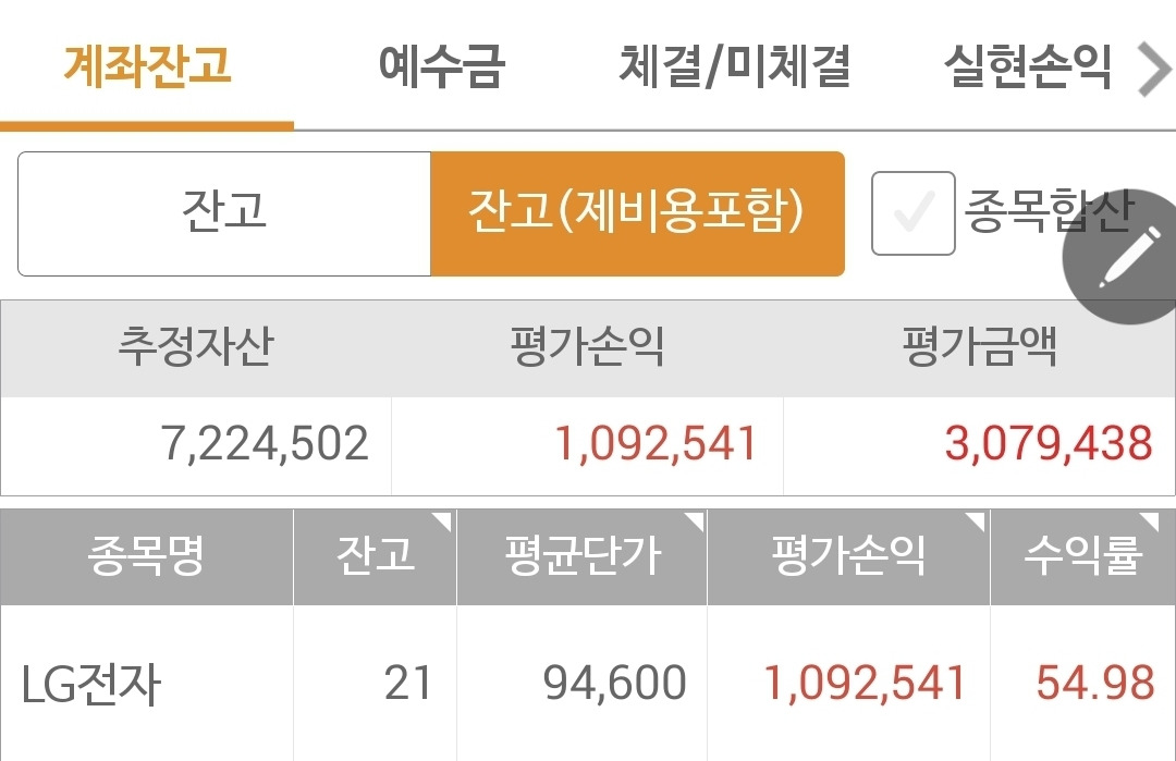 사진 1. 현물 주식. 총 500만 원 투자해서 722만 원으로 불렸다. 한전을 탈락시키고 LG전자만이 남아있다.