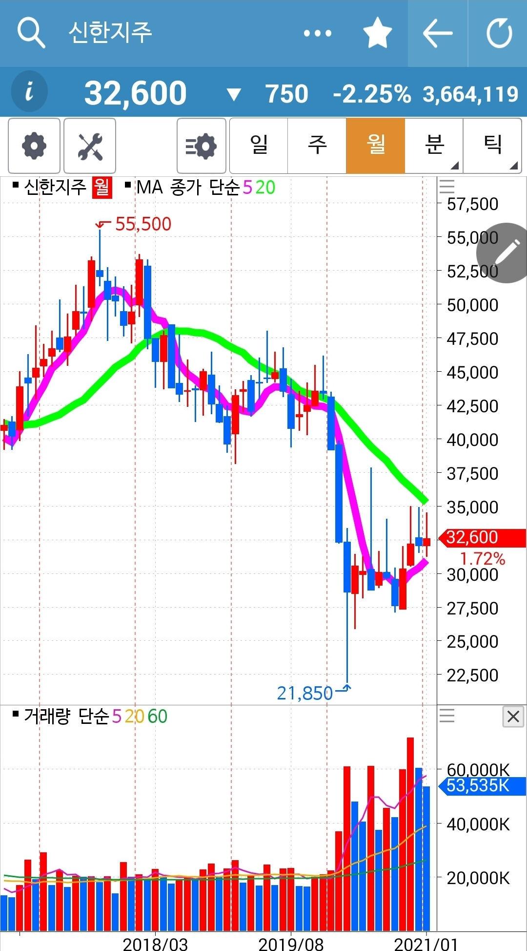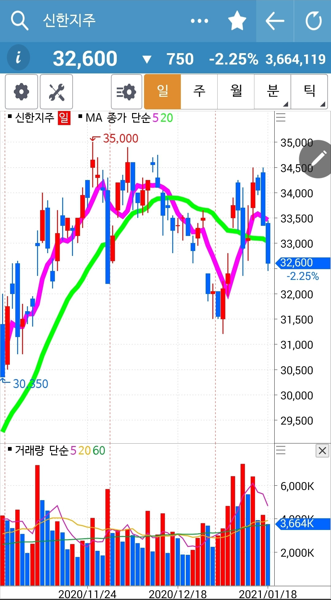 무시무시하게 긴 음봉이 두 개 자리 잡고 있다. 그래도 아직 5일선이 20일선 위에 있으므로 난 그냥 있는다. 둘이 교차하고 5일선이 아래로 가는 순간 난 정리하리라. 그래 힘내자. 파이팅!