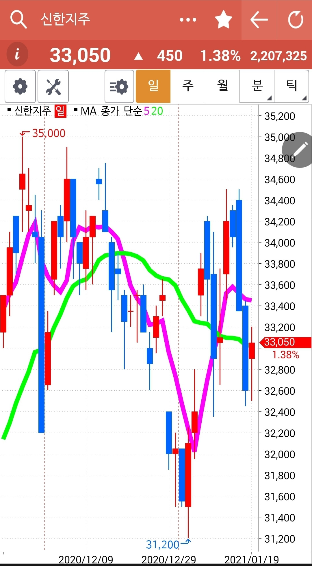 분홍빛 5일선이 20일선 아래로 내려왔다. 종가에 칼같이 매도!!! 장하다 파이팅!!!