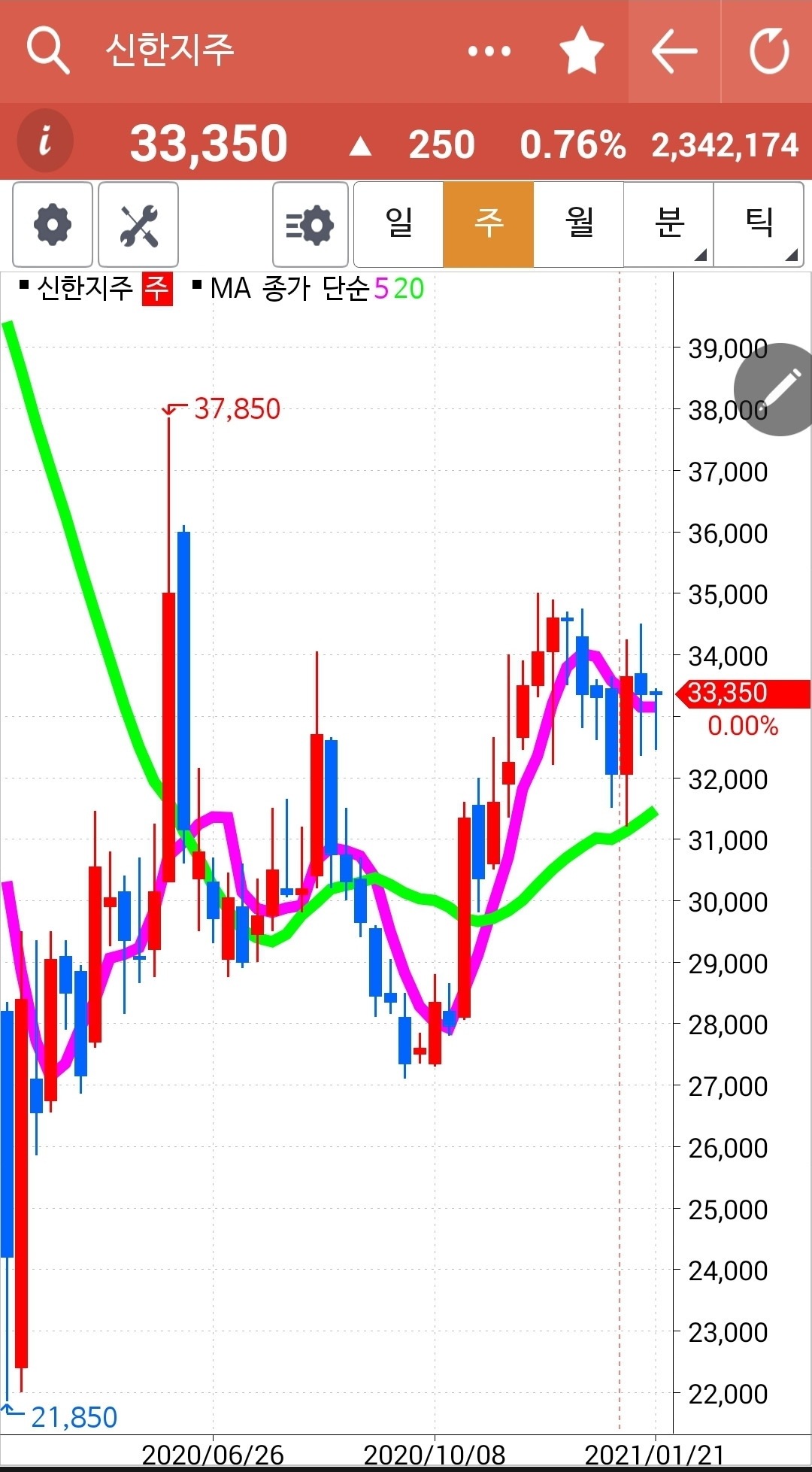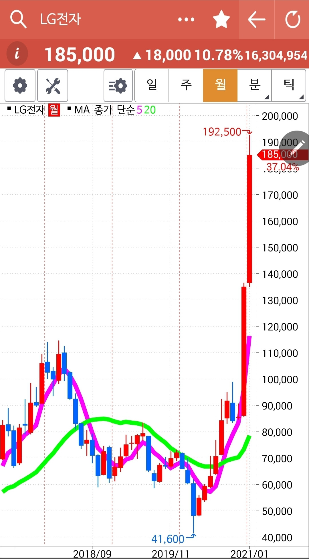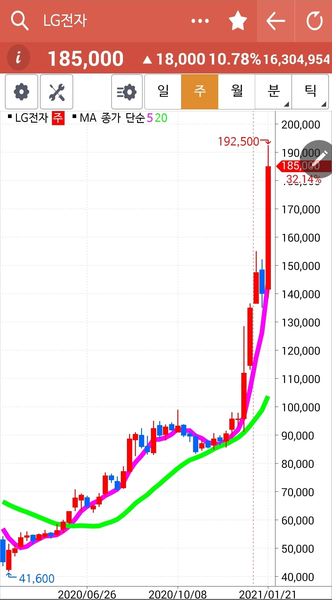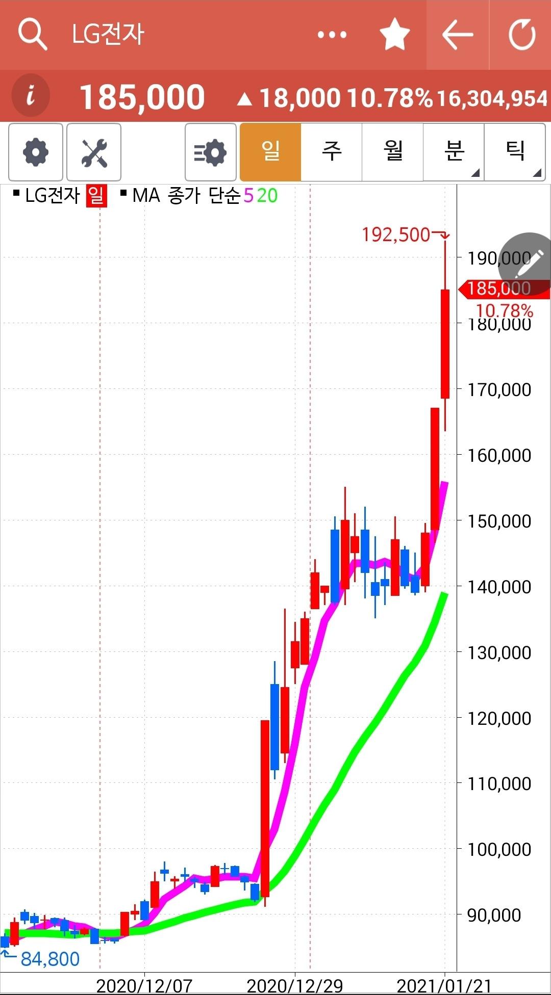 빵! 거대한 양봉이 나오기 시작할 때부터 알아봤어야 했다. 무조건 따라붙었어야 했다. 왜 다른 종목을 골라 헤매고 있을까. 이렇게 잘 올라가는 주식을 놓고. 너무 올랐으니 이제 내릴 때가 되지 않았을까 하는 미리 예측하는 버릇이야말로 나쁜 버릇이다. 예측이란 없다. 다만 팩트만이 필요하다. 5일선이 20일선을 뚫고 내려가면 매도하면 된다. 예측은 필요 없고 해서도 안된다. 아, 그래도 이제 들어가기엔 너무 늦어 보인다. 있는 거나 잘 챙기자. 파이팅!