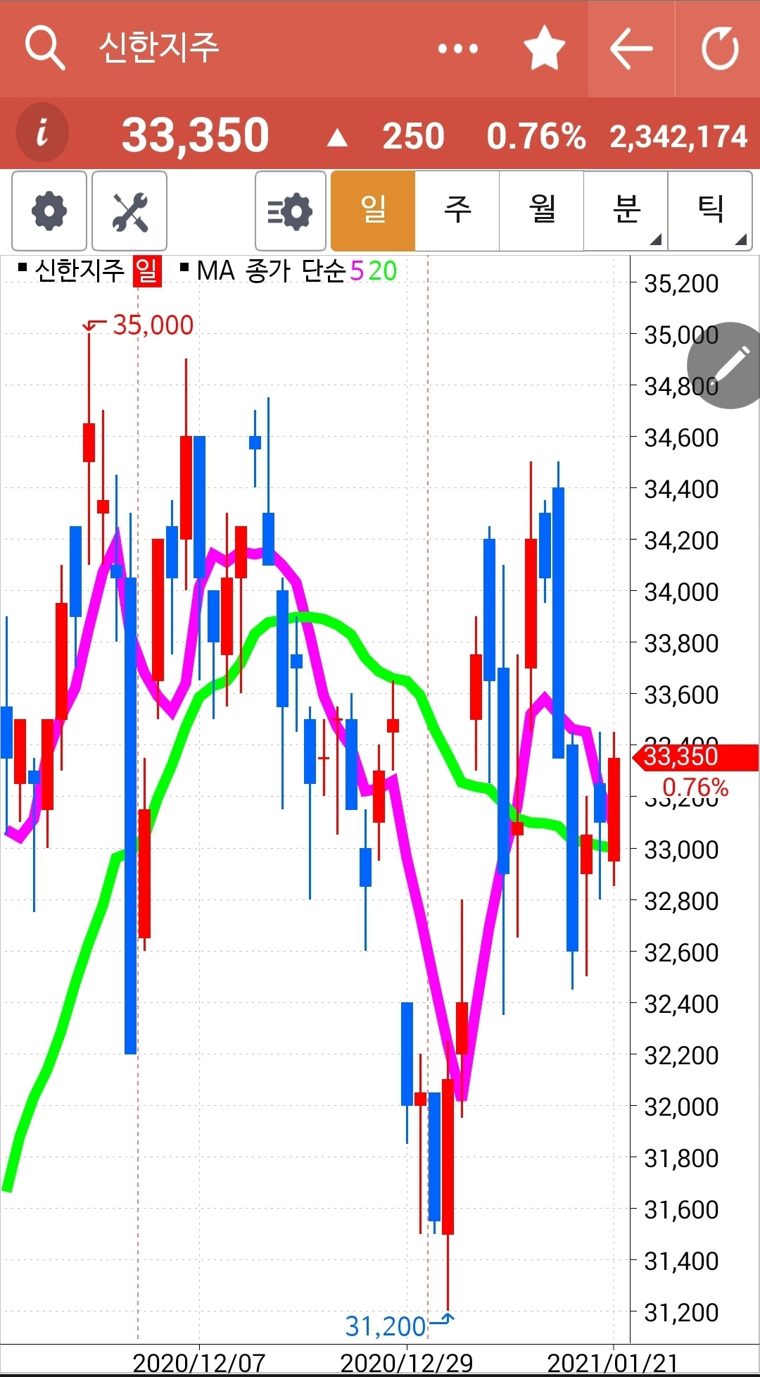 5일선이 20일선에 닿을 듯 말 듯 긴장하게 하더니 다행히 빨간 양봉이 나왔다. 그러나 내일 5일선과 20일선 꽝! 충돌이 일어날 가능성이 크게 생겼다. 긴장하며 보도록 하자. 난 아무것도 몰라요 5일선이 20일선 아래로 내려가면 매도할 뿐야요~ 그래. 그거 하나면 돼. 파이팅!!!