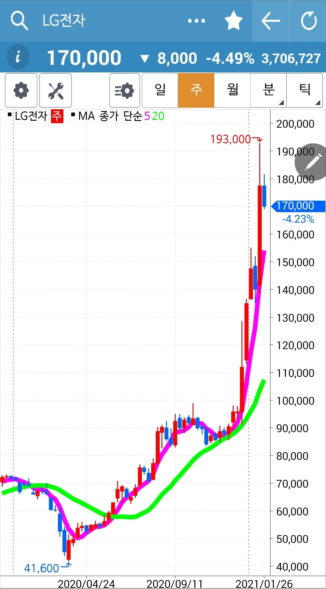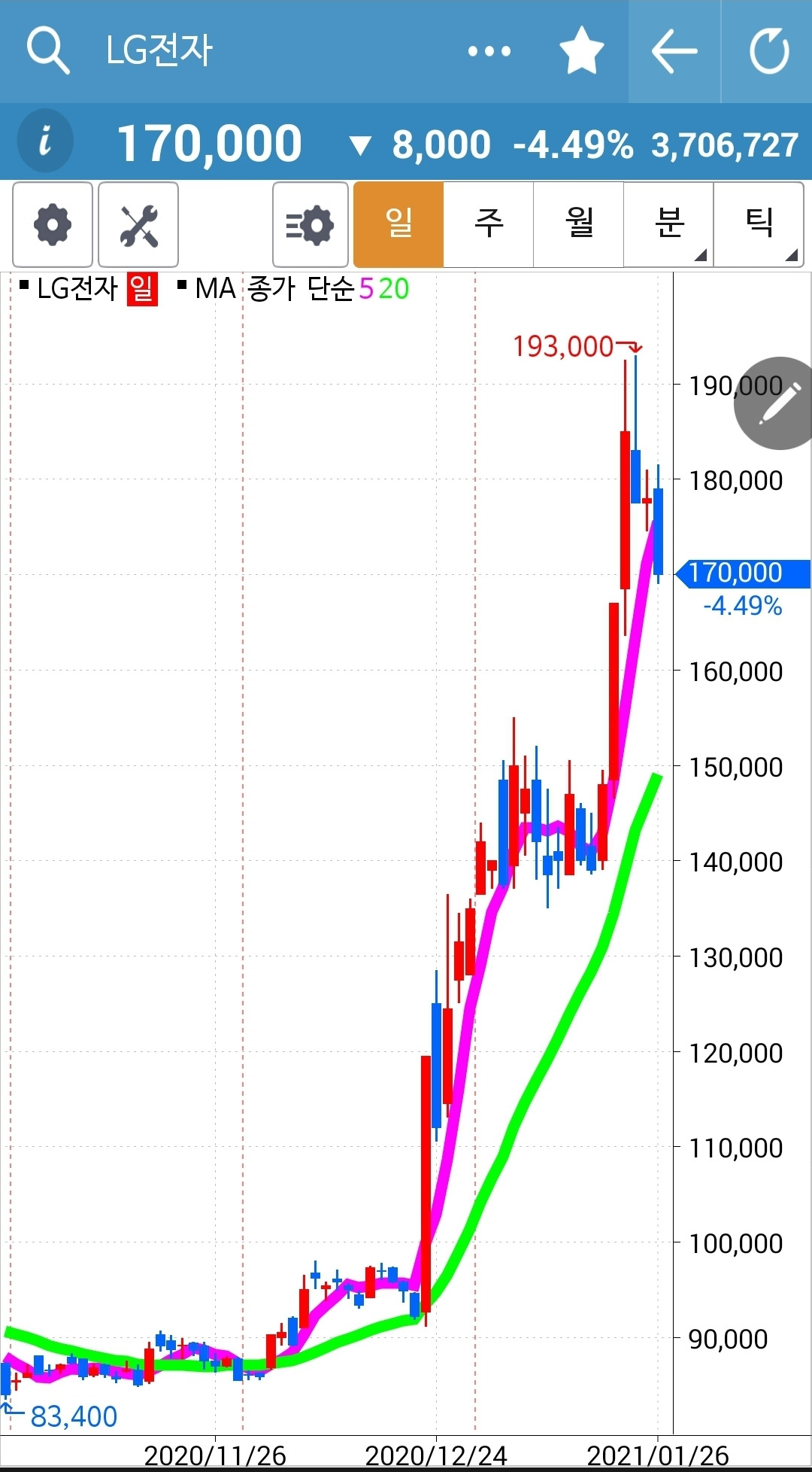 가파르게 올랐으니 숨을 고를 밖에. 구비구비 자연스러운 곡선이 되어야 오래오래 갈 테니까. 이 정도 조정에 괜히 떨 필요 없다. 어쨌든 5일선이 20일선 위에 있으니 내가 할 행동은 없다. 와이? 난 아무것도 몰라요 5일선이 20일선 아래로 뚫고 내려가면 매도할 뿐야요~ 니까. 아직 안 내려갔으므로 내가 할 일은 없다. 그냥 그래프만 뚫어져라 지켜보면 된다. 하루 종일 절대 아니고 종가 단일가 들어가기 몇 분 전에만 확인하면 된다. 행여 5일선이 20일선을 뚫고 내려가나 만 지켜보면 되는 것이다. 그래. 파이팅!