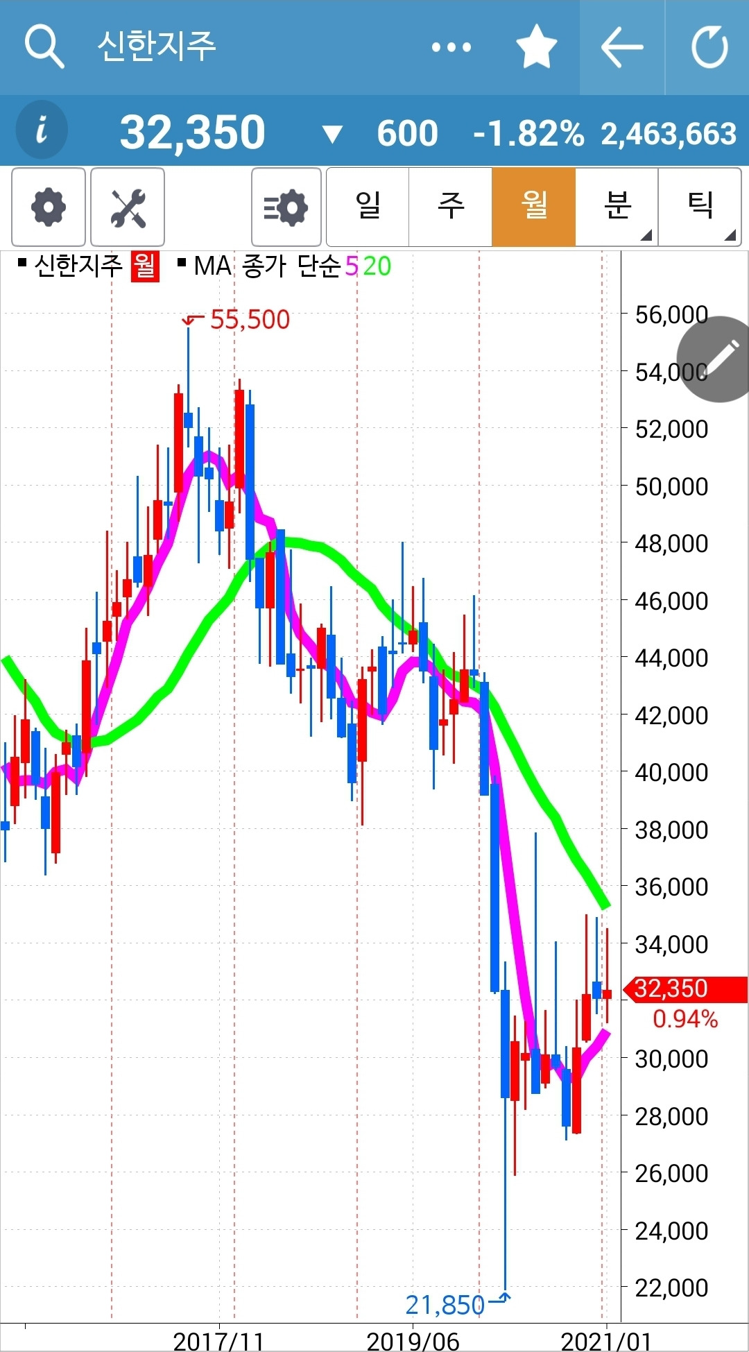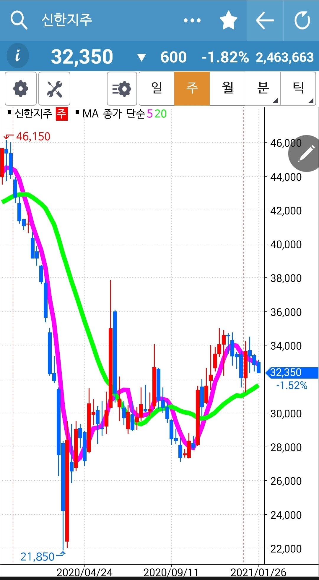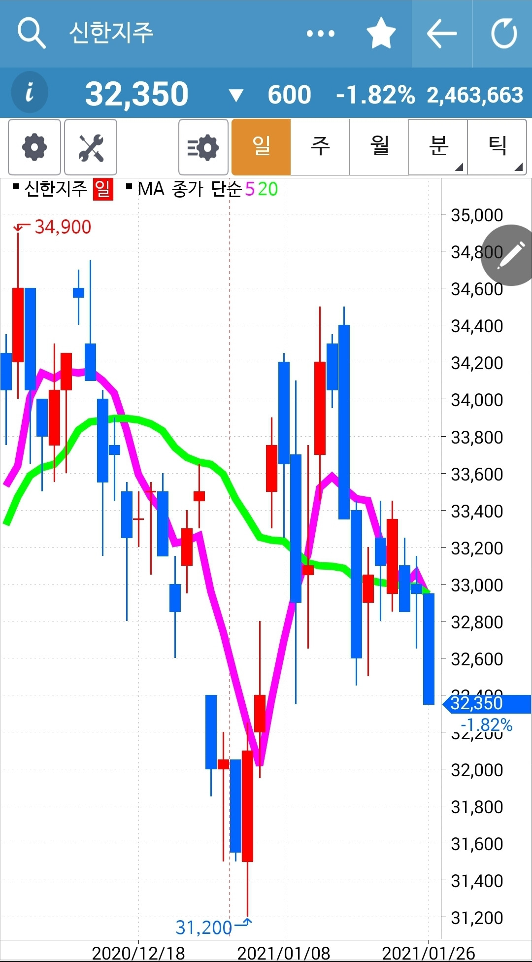 일봉을 보면 붙은 것도 같고 아직 안 붙은 것도 같고 이리저리 확대해봐도 마찬가지다. 그래. 이럴 땐 하루 기다려보자. 확실히 5일선이 아래로 내려오면 그때 매도하리라. 붙은 듯 안 붙은 듯 애매하여 하루 생명을 연장받는 신한지주 복 있을 지어다. 푸하하하