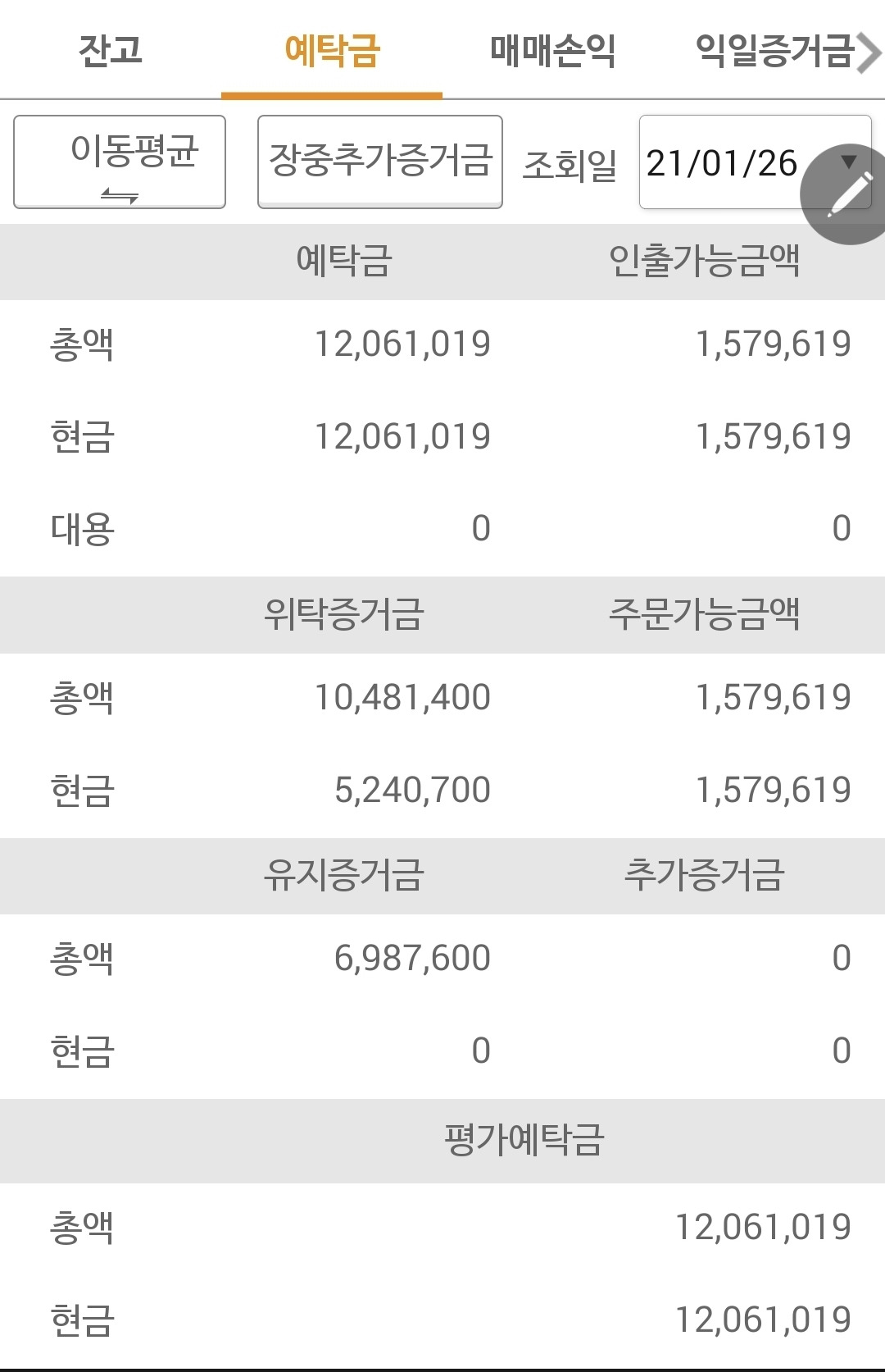 사진 3. 선물 주식 예탁금. 1,600만 원대였던 나의 잔고가 1,200만 원대로 줄었다. 들어가지 말아야 할 곳에서 들어가 망설 망설이다 초래한 결과이다. 그래도 믿는 구석 하나. 아직 5일선이 20일선 아래로 안 갔잖아. 그러나 그 또한 내일이면 무너질 듯싶다. 그래. 그때 나오면 된다. 오늘은 5일선과 20일선이 붙은 것도 같고 안 붙은 것도 같으니까.