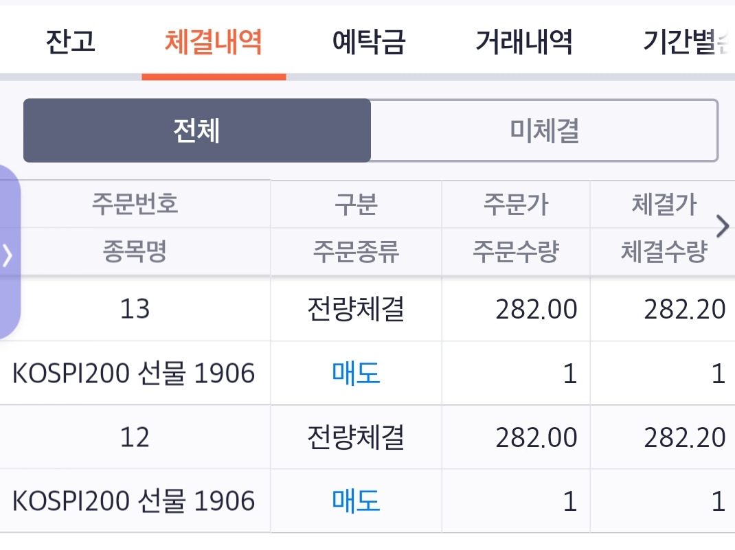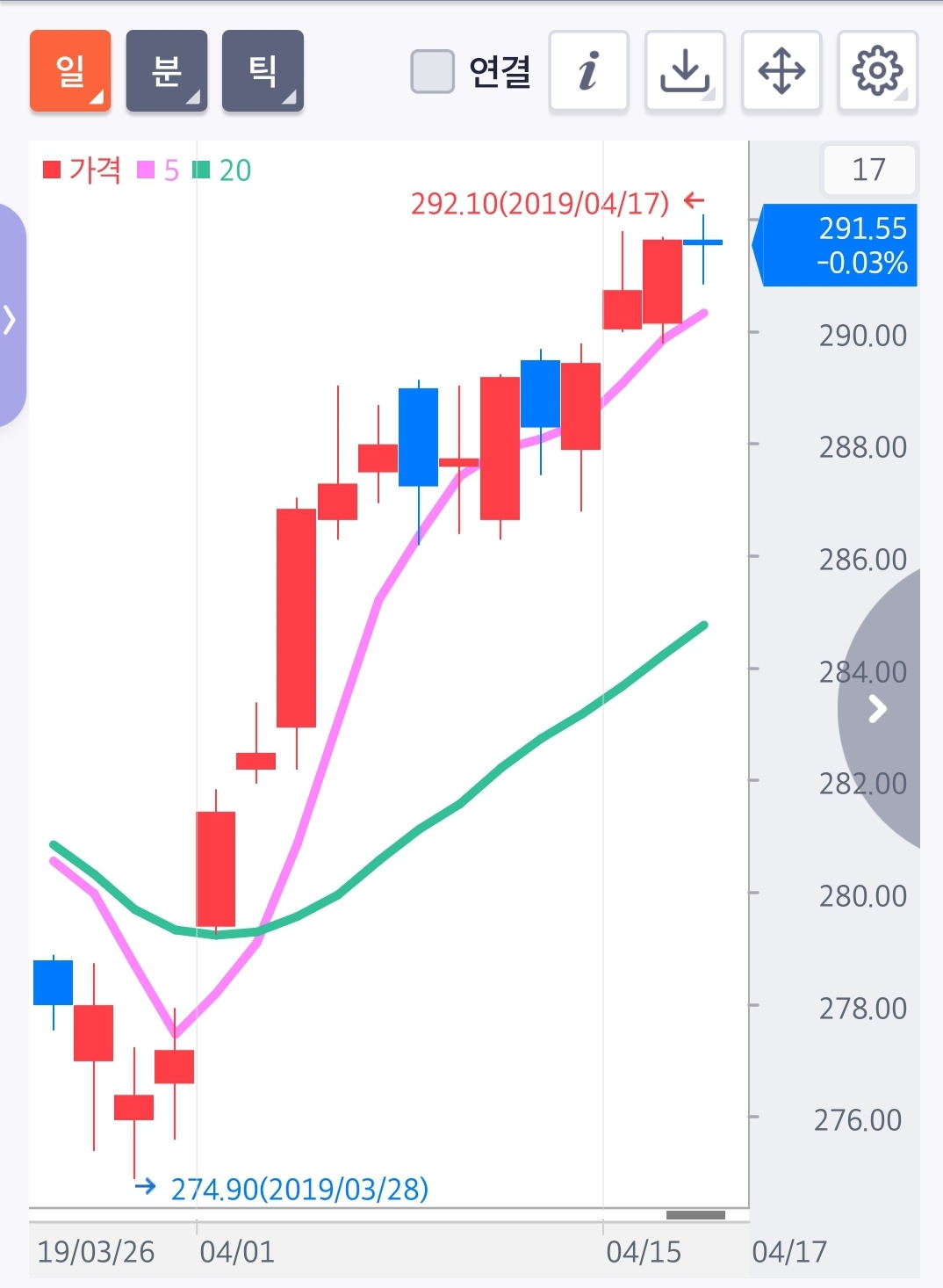 선물은 결제일이 하루라 내가 4월 4일 매매한 것은 4월 5일로 기록된다. 어쨌든 큰 수익을 보고도 모두 돌려준 것뿐만 아니라 손실을 보았다. 286.65 - 282 = 4.65 포인트의 손실. 우아 크다. 금액으로 계산해보면 한 계약이 1포인트일 때 25만 원이니까 4.65 x 25만 원 = 1,162,500 원의 손실을 보았다. 와우 정말 크게 손실 보았다. 이 정도 이상을 벌었었는데 말이다. 일단 이익 나면 챙기기를 조만간 심각하게 고민해봐야겠다. 그래서 나의 원칙으로 만들어야 한다. 그건 좀 나중에 해야겠다. 어쨌든 이번 매매는 손실을 기록했다. 이제는 매도 포지션으로 고우 고우다. 난 감정이 없는 여자. 그냥 포카 페이스로 원칙을 지켜낼 뿐. 좋다 나쁘다를 생각하지 말자. 아까워도 그런 거 느끼지 말자. 원칙을 지켜내면 그걸로 짝짝짝! 잘했다 칭찬해주자. 파이팅!!!