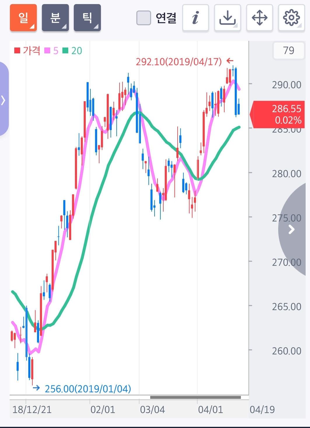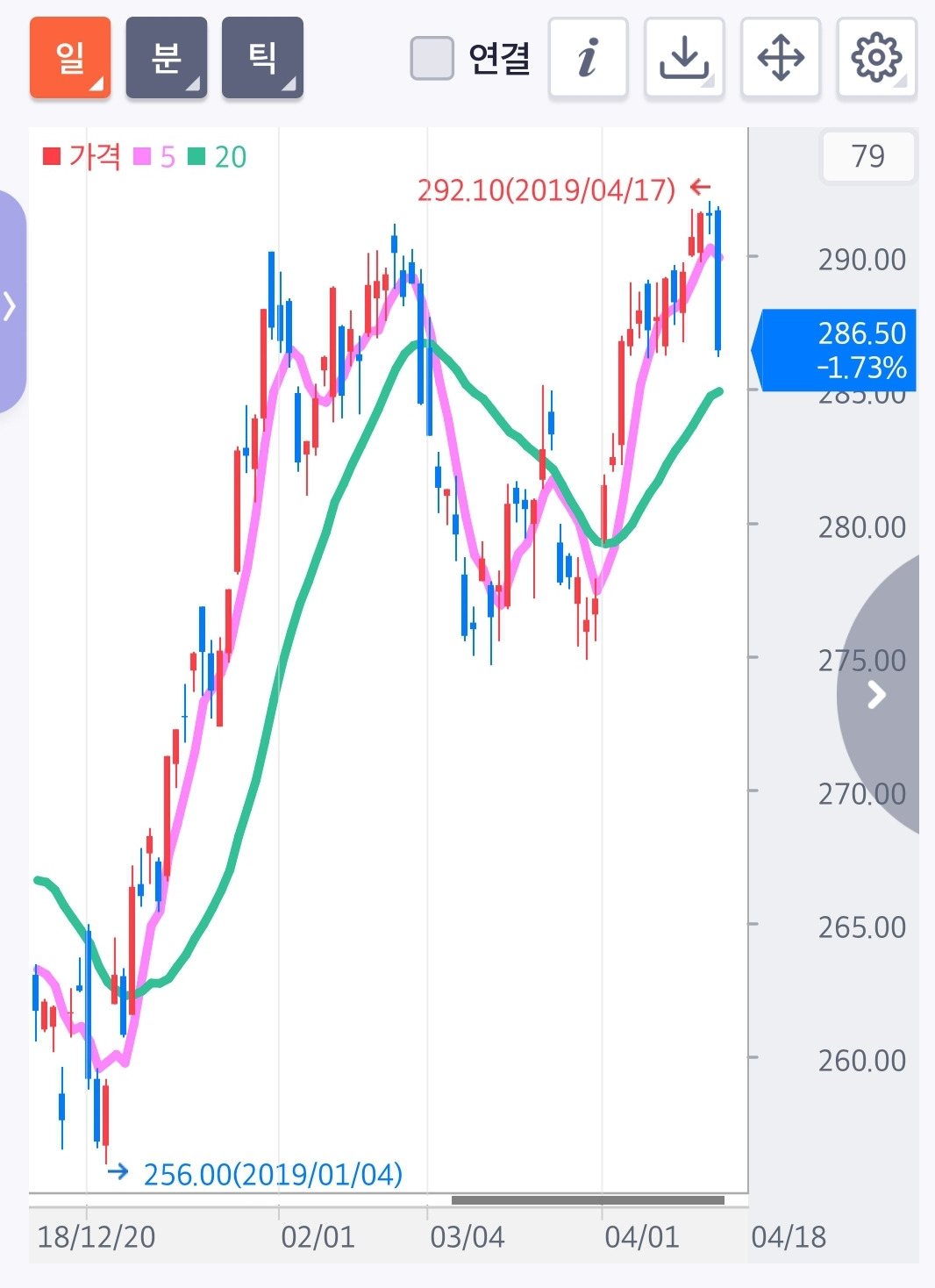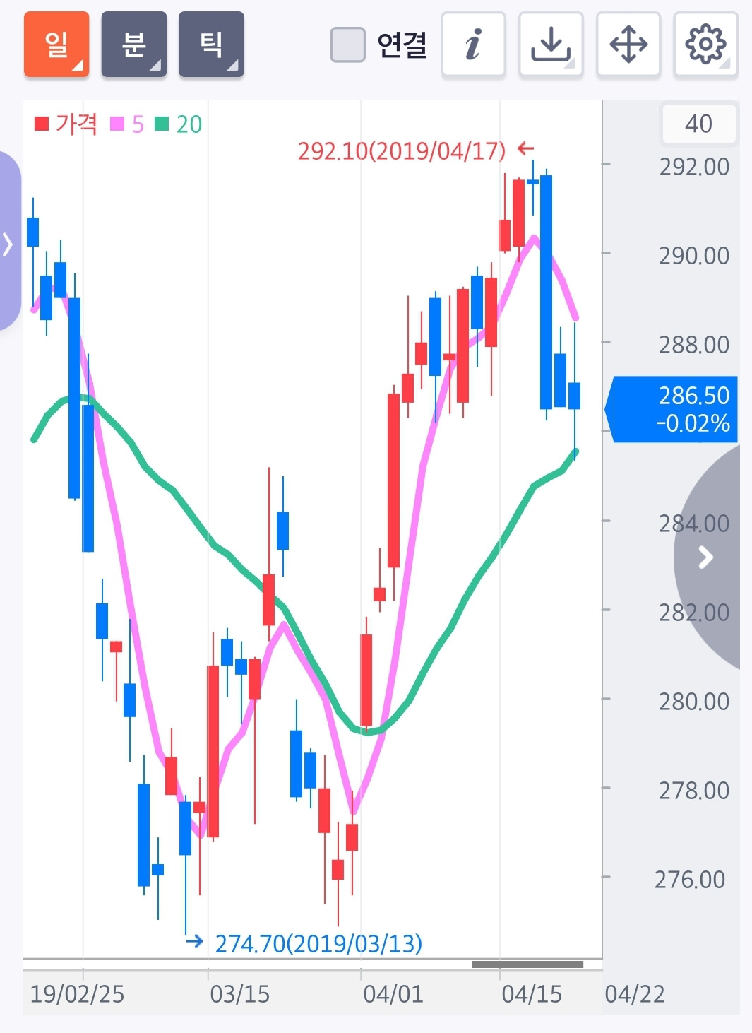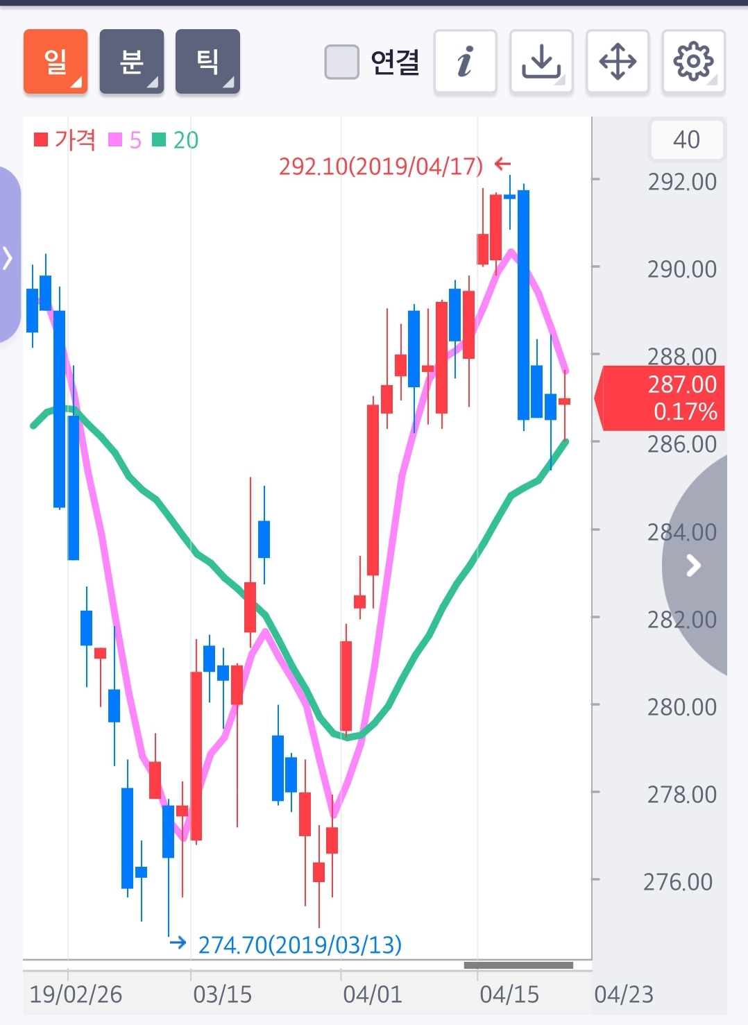 4월4일286.65에 매수했고 오늘 4월 26일 시초가에 청산 매도 282에 했다.