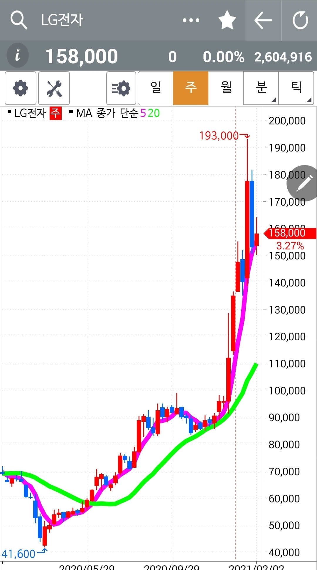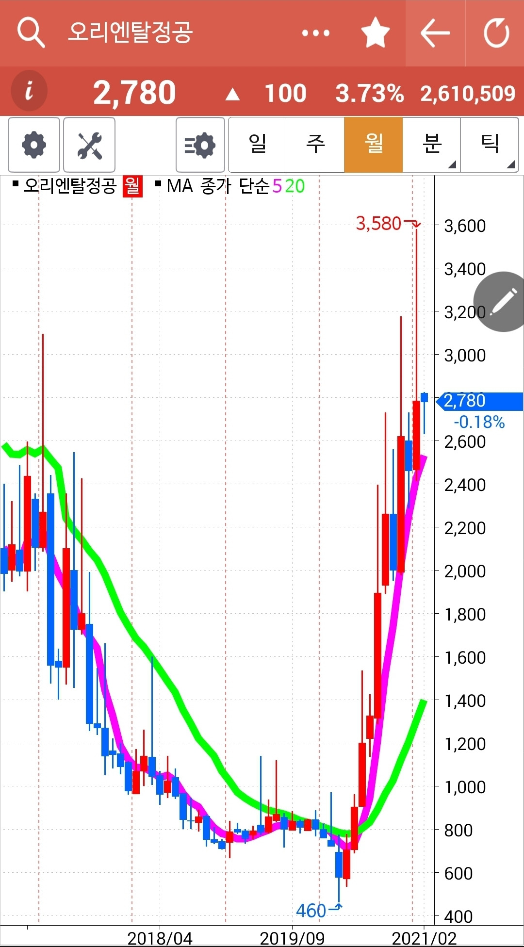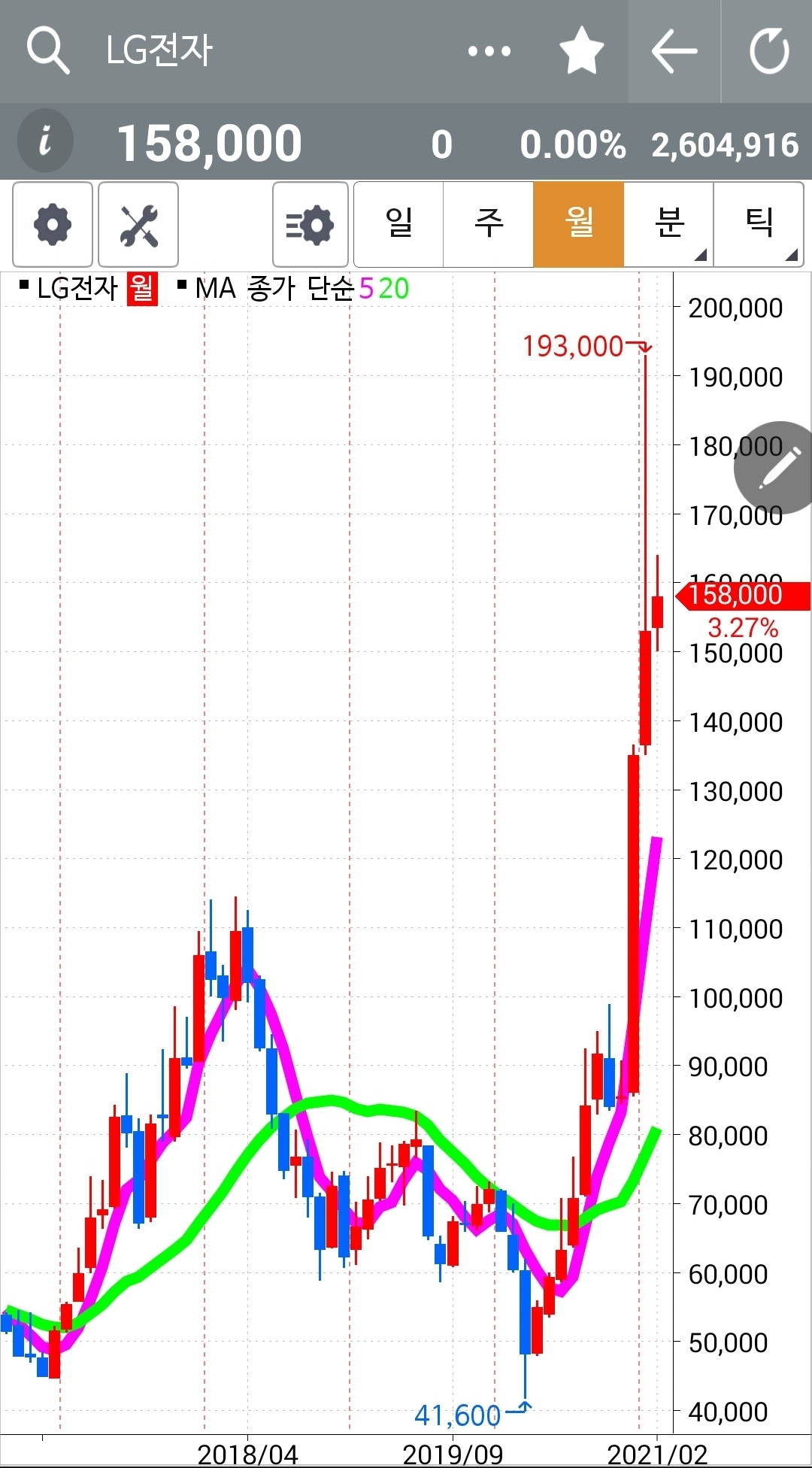 캬~ 딱 20일선에서 양봉으로 튀어 오른다. 그러나 전일 고점을 훌쩍 뛰어넘는 큰 양봉은 아니기 때문에 그대로 올라갈지 그거는 모르겠다. 아무리 조금일지라도 이것 역시 5일선이 20일선 아래로 내려오면 탈출하리라. 난 원칙만 아는 여자. 원칙만 할 줄 아는 여자. 5일선이 20일선 아래로 내려가면 매도할 줄만 아는 여자~