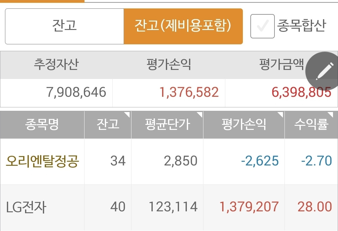 사진 1. 현물 주식. 달랑 하나 가지고 있는 LG전자가 움직이지 않으니 나의 잔고도 움직이지 않는다. 오리엔탈정공은 너무 코딱지만큼이라 계산할 것도 없다.