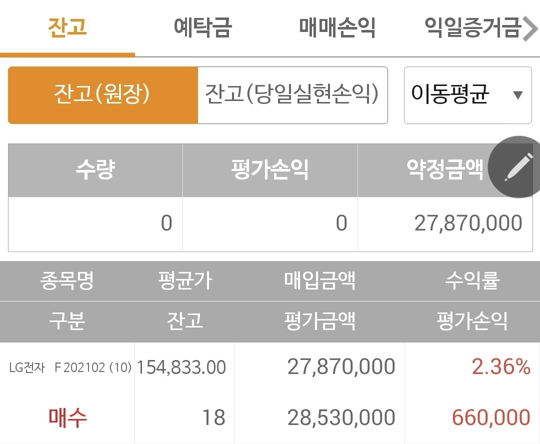 사진 2. 선물 주식. LG전자 하나로만 빵빵 채워져 있다. 움직이지 않으니 수익도 고대로다.