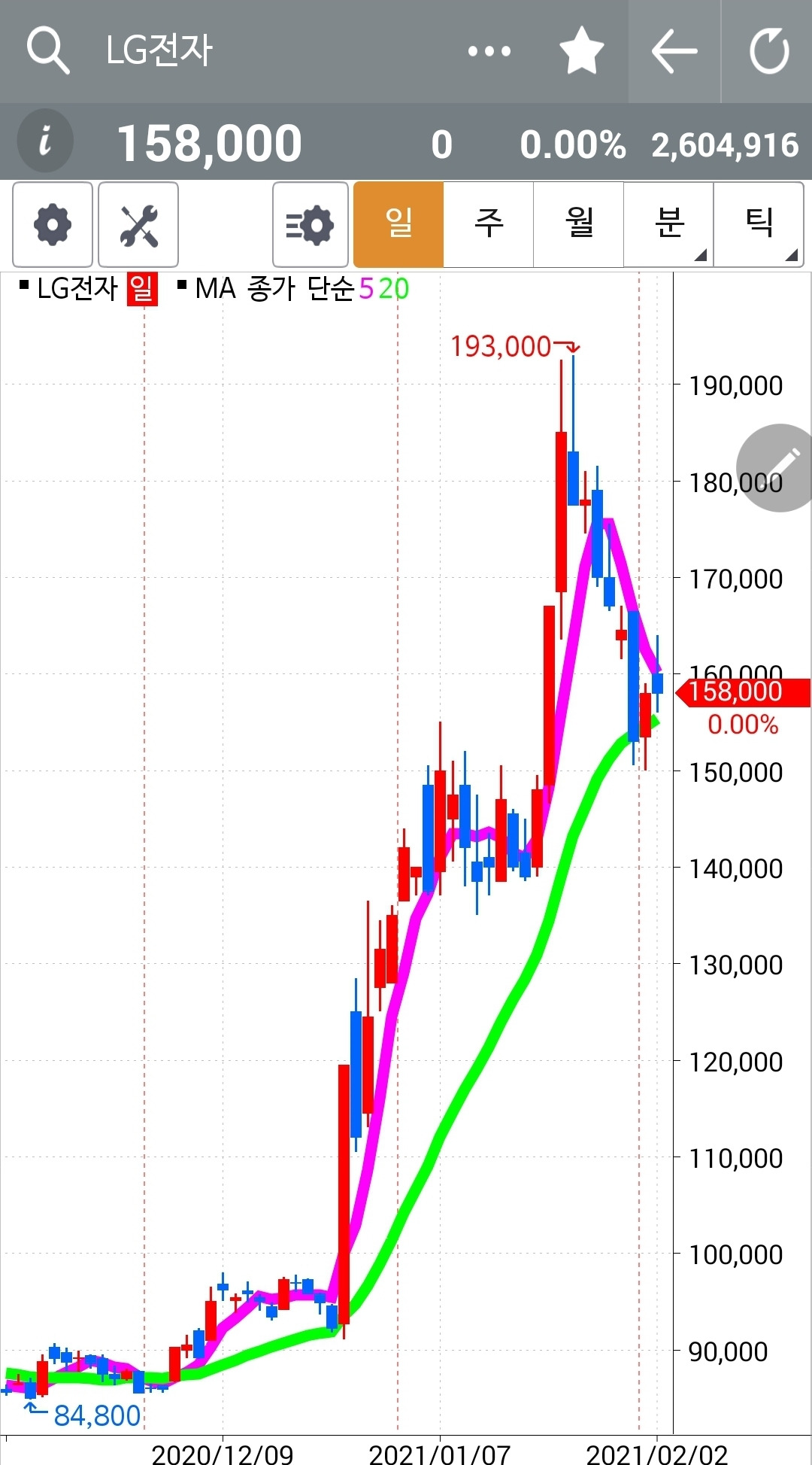 내일 많이 오르지 않으면 5일선이 20일선 뚫고 내려갈 수 있다. 20일선을 뚫고 내려간다면 아무리 가슴이 아파도 난 기계 아무것도 몰라요 5일선이 20일선 아래로 가면 매도할 뿐야요~ 노래 부르며 무조건 탈출해야 한다. 그래. 내일 두 눈을 부릅뜨고 지켜보리라. 파이팅!