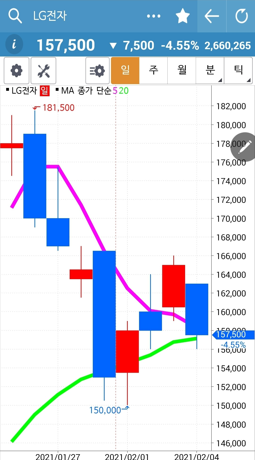 5일선이 20일선 아래로 내려가면 나와야 하는데 20일선에 딱 닿은 듯한 모습이다. 얼른 확대해서 본다. 아직 5일선이 20일선을 뚫고 내려가지는 않았다. 다행이다. 매수 유지다.
