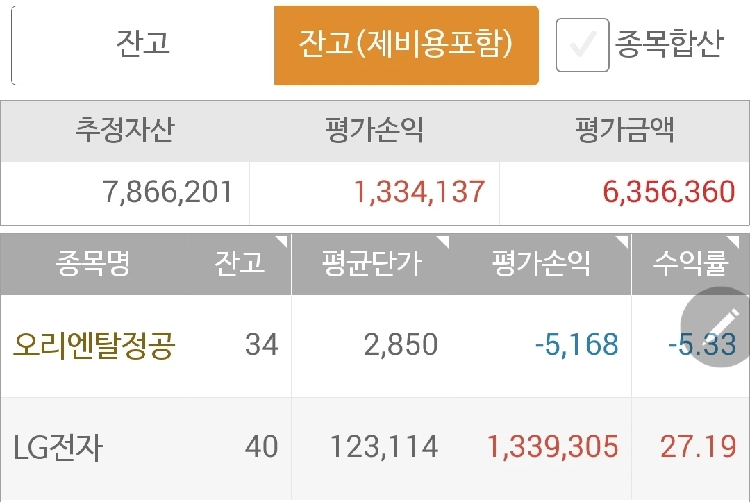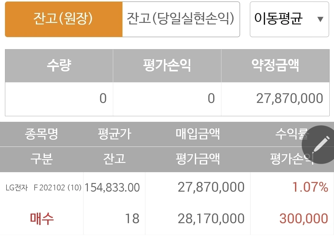 사진 1. 현물 주식. 내 계좌 가득 차 있는 LG전자가 내려서 수익 약간 감소.