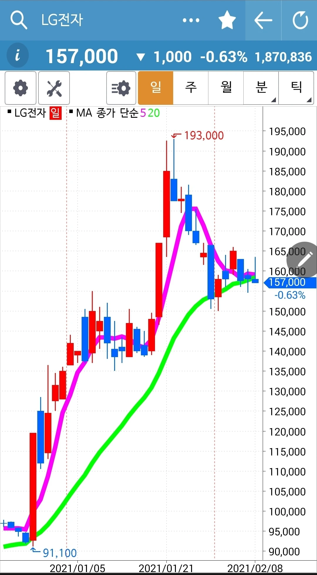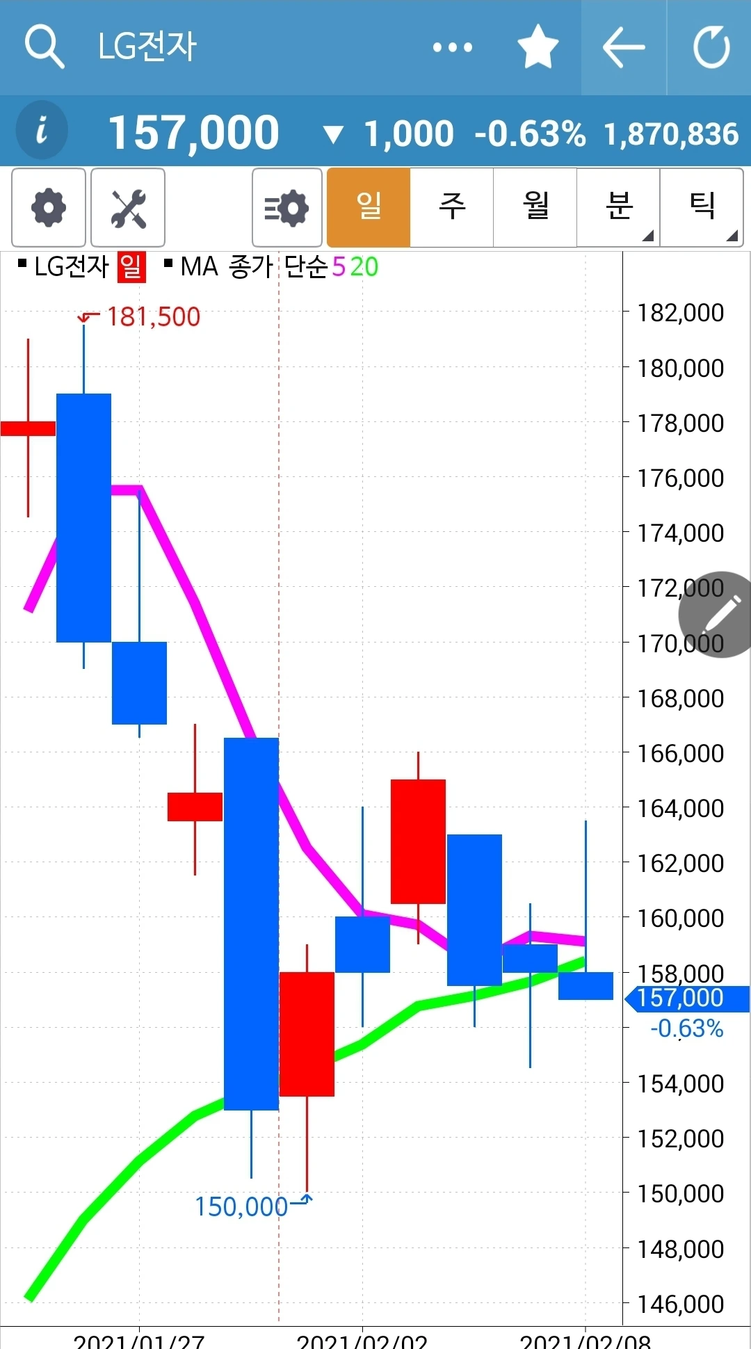 요것도 붙어있다. 그러나 너무 조금 있으니까 그냥 차트 구경만 하는 것이다. 자, 오늘 LG전자의 5일선이 20일선과 그야말로 붙을 똥 말똥이다. 두 눈 부릅뜨고 지켜봐야 한다. 많이 오르지 못하면 5일선은 20일선을 뚫고 아래로 내려올 것이다. 잘 지켜보고 꽝! 충돌이 일어나는 순간! 이 아니라 종가에 나는 행동할 것이다. 파이팅! 다시 한번 나의 원칙을 외치고. 난 아무것도 몰라요 5일선이 20일선 아래로 내려오면 매도할 뿐야요~