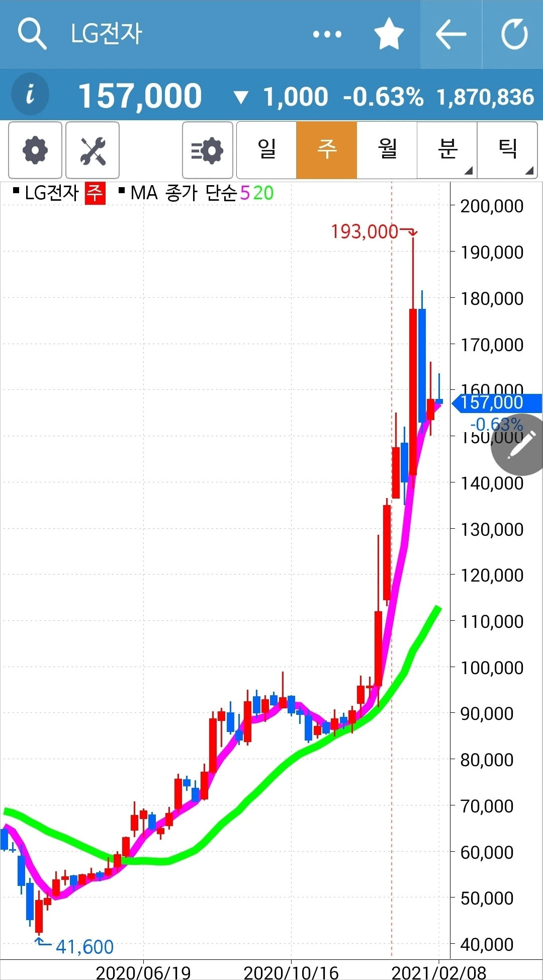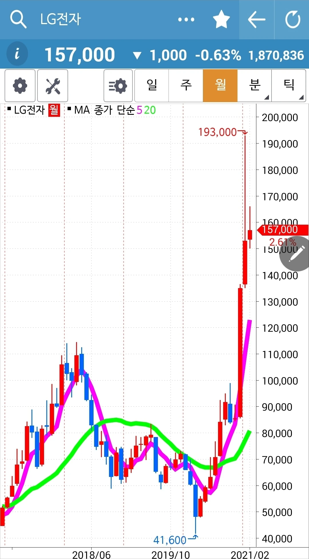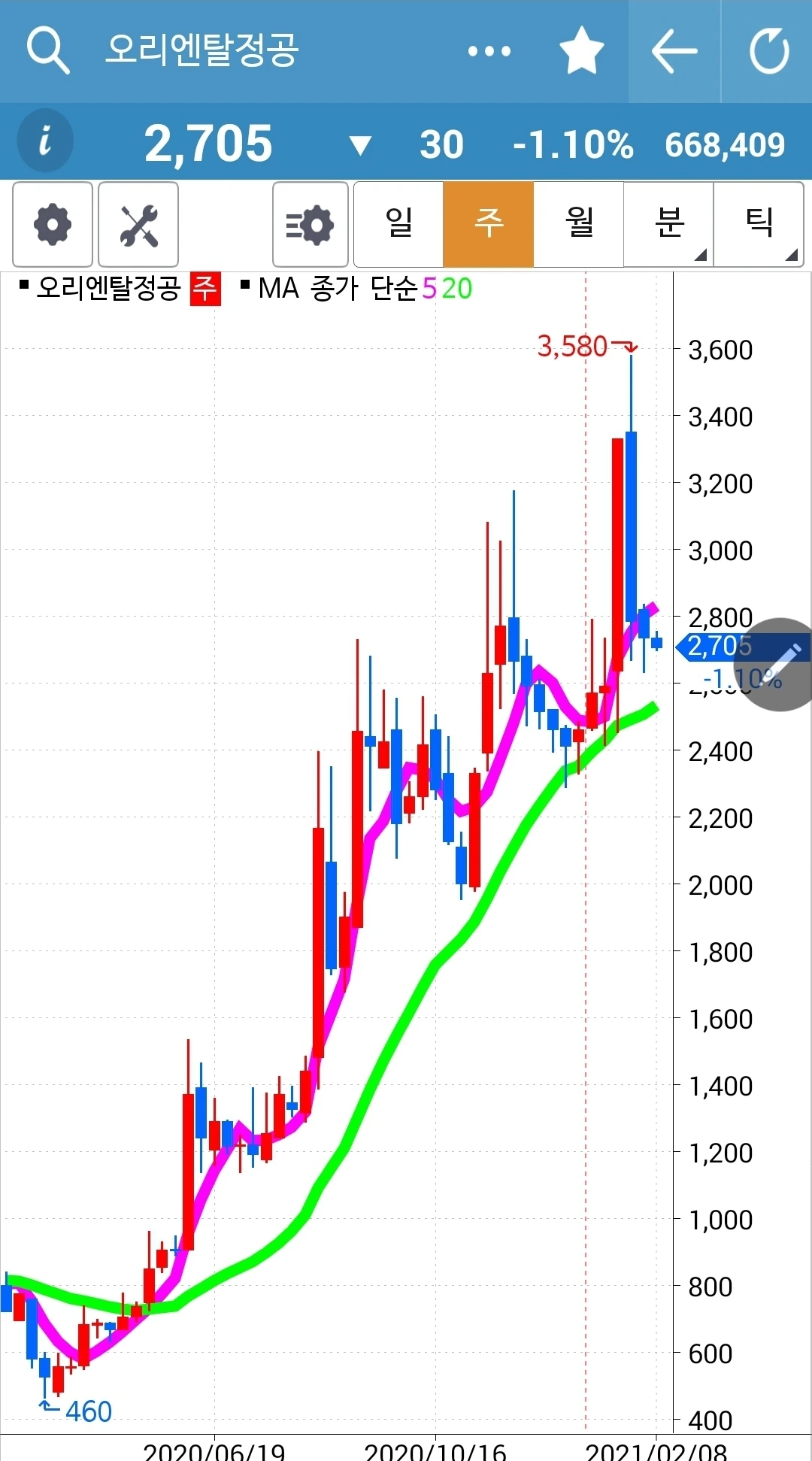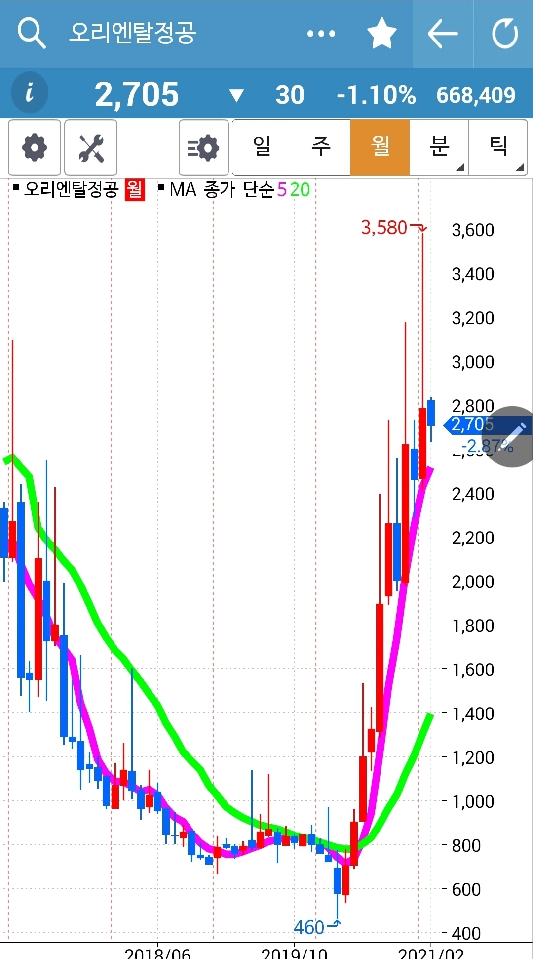 주봉 월봉 쭉쭉빵빵이지만 너무 가파르다. 조정은 필요할 듯하다.
