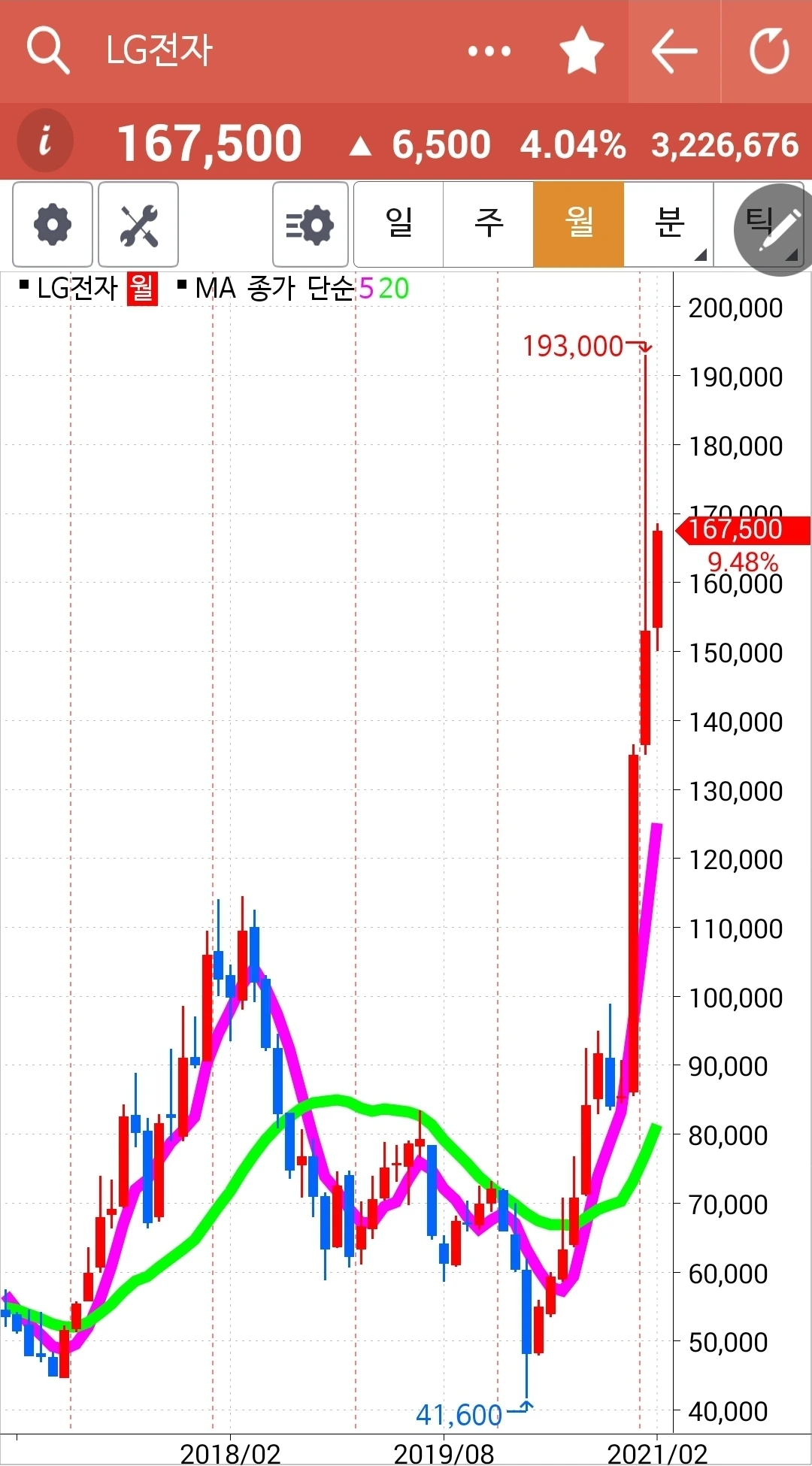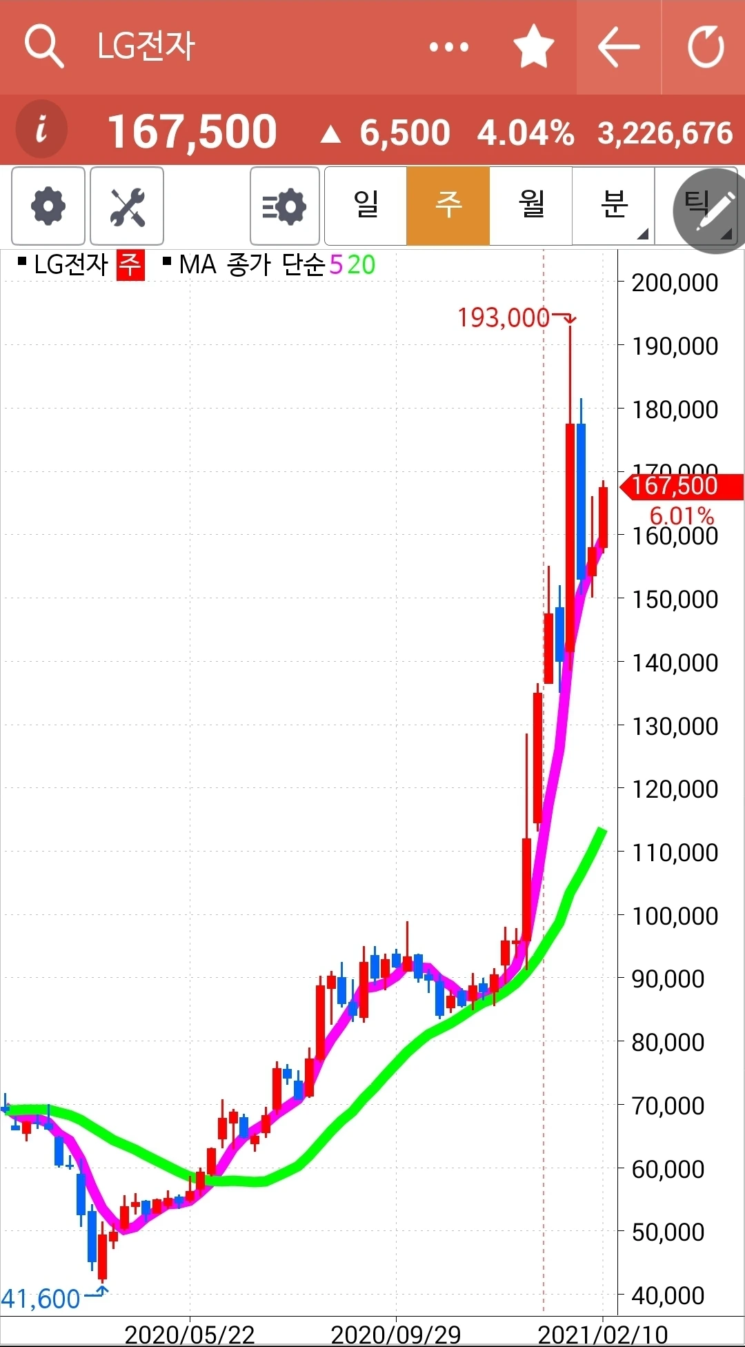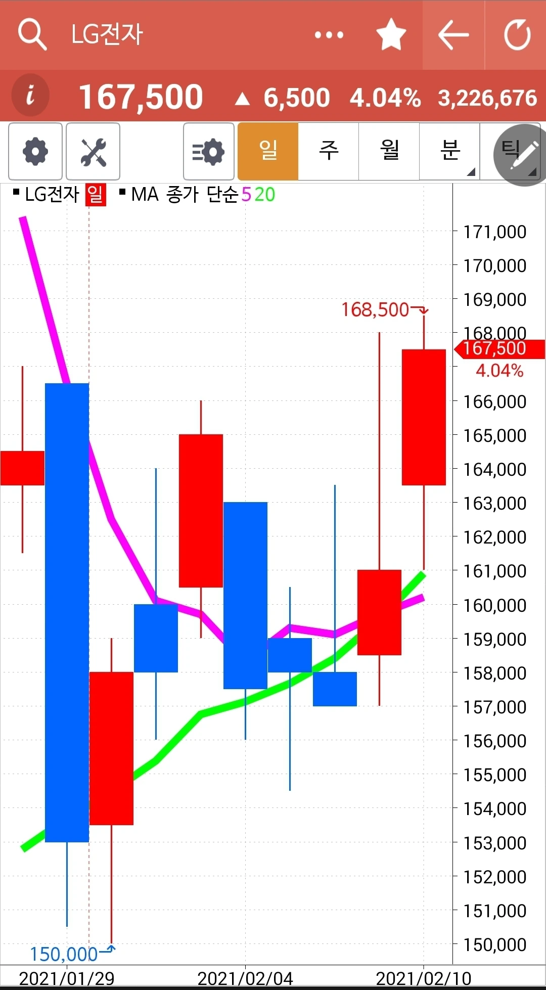 푸하하하 LG전자 또 빵! 그야말로 빵! 빵빵! 빵빵빵!이다. 음하하하. 어찌 웃음이 아니 나올 수 있을까. 내 계좌에 LG전자만 가득한 상황에서 이렇게 빵! 올라주었으니 말이다. 그런데 5일선이 20일선과 딱 붙은 듯 살짝 20일선 아래 있는 듯도 싶다. 그러나 전일 고점을 넘겼고 방향이 모두 위로 향하고 있고 그리고 붙은 듯 안 붙은 듯 너무 조금 삐죽 내려온 듯싶기에 살짝 원칙을 어기기로 한다. 조금이라도 5일선이 20일선 아래로 내려가면 무조건 매도지만 살짝 변형하기로 했다. 왜냐하면 20일선 아래로 살짝 내려간 5일선이 방향은 위로 향하고 있기 때문에. 곤두박질치는 모습이 아니고 올라가는 모습인데 덜컥 내려올 수는 없지 아니한가 말이다. 설 끝나고 새로 시작하는 장에서 5일선이 20일선 아래로 확실하게 내려가면 그때 뛰쳐나오기로 한다. 갈등의 원인은 하나. 5일선이 위를 향하고 있고 20일 선도 위를 향하고 있다는 것. 그래. 하루만 참아보자. 파이팅!
