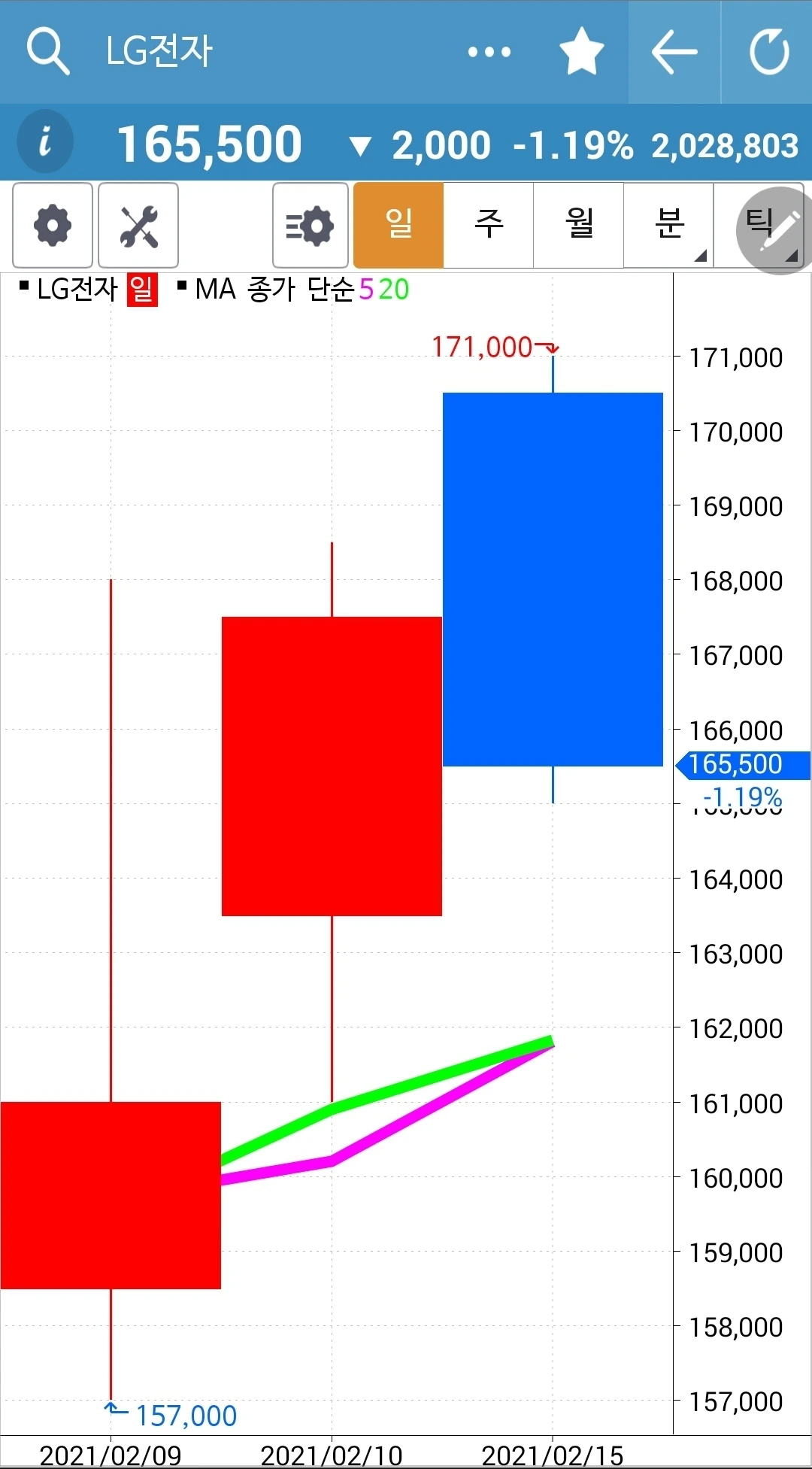 난 또 사고를 쳤다. 사고를 친 게 분명하다. 선물 주식 만기일이 항상 둘째 주 목요일인데 목요일은 설 연휴이므로 셋째 주 목요일인 이번 주 목요일이 만기인 줄 알았다. 그런데 오늘 장을 보니 선물 주식 계좌에 잔고가 하나도 없이 텅텅 비어 있는 것이다. 헉. 지난 수요일이 만기였던 거야? 하이코. 이러고도 주식을 한다고. 너무하지 않은가. 어쨌든 모두 현금화가 되어있다. 지난주 설 전 매매일에 5일선이 20일선 아래로 내려가는 듯했지만 거의 꼭 붙어있고 또 방향이 모두 위를 향하고 있어 정리를 안 하고 넘어왔는데 아니나 다를까 LG전자는 빵! 오르며 5일선이 다시 확실하게 20일선 위로 올라서고 있다. 그럼 그렇지! 몰빵! 그것도 팔자가에 급히 현금화되어있는 계좌에 들어갈 수 있는 한 몽땅 사넣는다. 그리고.... 한참 후에 보니 긴 음봉을 그리며 마이너스를 기록하고 있다. 하이고. 그뿐인가. 확실히 올라가던 핑크빛 5일선은 다시 내려간 듯 아닌 듯 아슬아슬 20일선과 꼭 붙어 있다. 아래인 듯도 하고 아닌 듯도 하고. 그래도 일단 위를 향하고 있으니 둘 다 위를 향할 땐 보유키로 했으니 그대로 패스. 가지고 왔다. 그런데 아무래도 사고를 친 것 같다. 여하튼 확실하게 5일선이 20일선을 빵! 뚫고 내려오는 즉시 난 뛰어내릴 각오는 되어있으니까 괜찮다. 파이팅!!!