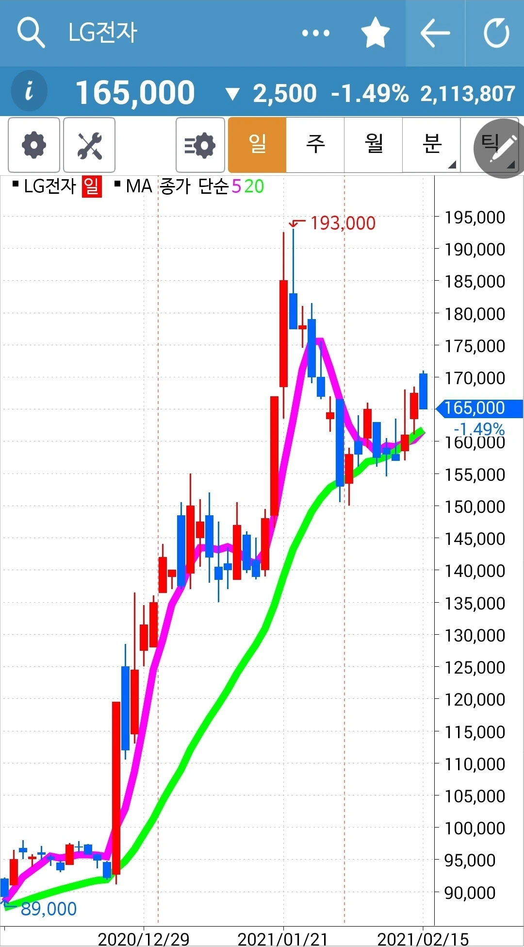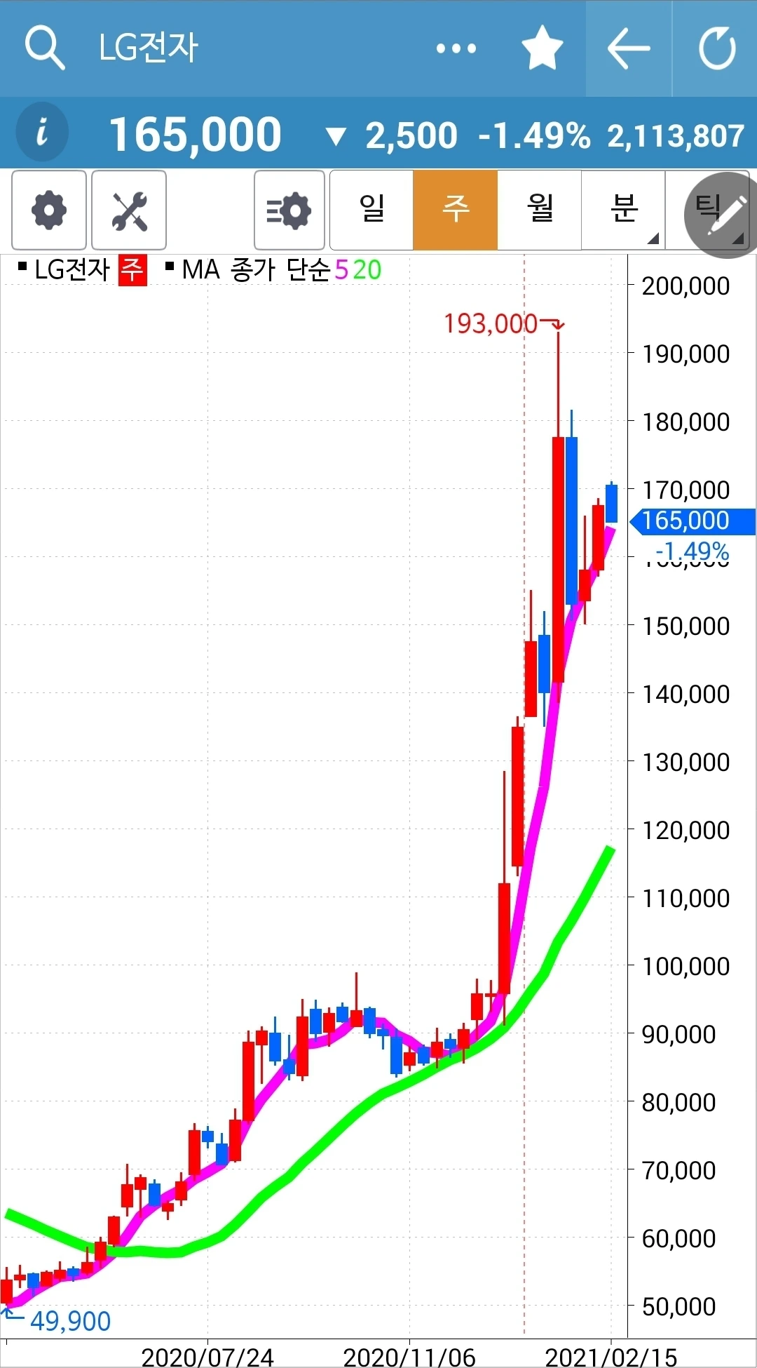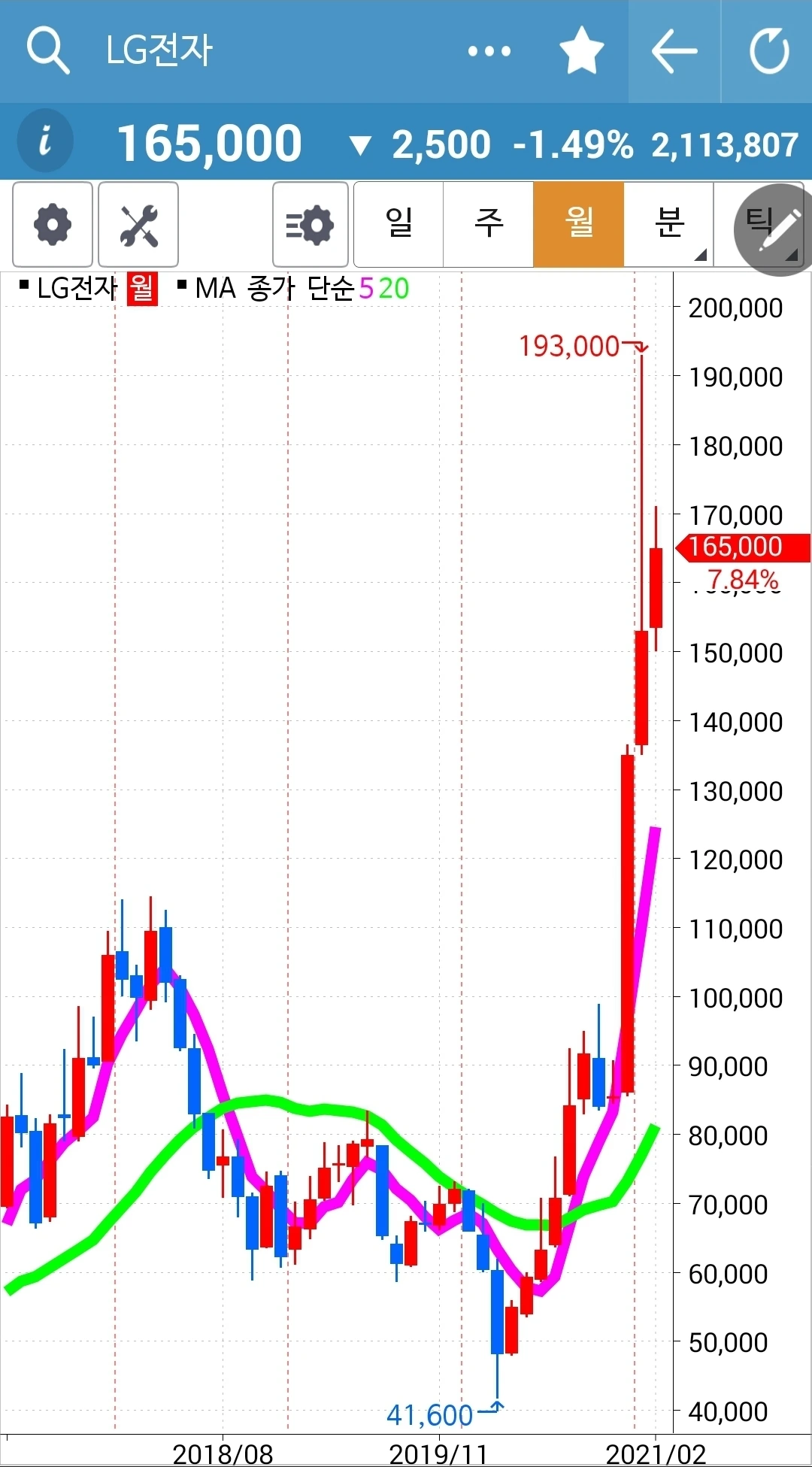 주봉 월봉 쭉쭉빵빵이다. 자연스러우려면 굴곡이 있어야겠지만 하하 그래도 어쨌든 우상향. 쭉쭉 뻗어가거라. 파이팅!