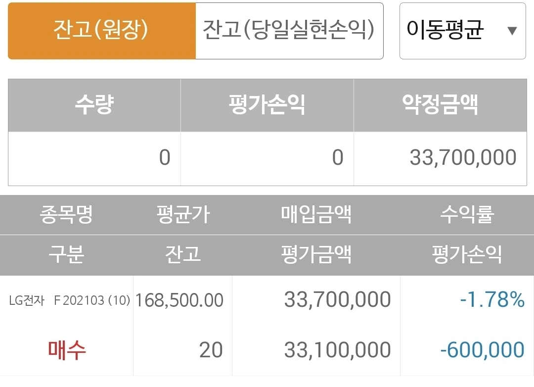 사진 2. 선물주식. 난 왜 적당히를 모를까? 그냥 무조건 돈 되는 대로 총 가능 수량을 몽딸 질러버리니 말이다. 호랑이 굴에 빠져도 정신만 똑바로 차리면 된다고 했어. 나의 무기는 5일선이 20일선 아래로 내려가면 탈출한다는 것. 그래. 그거 하나면 살아남을 수 있어. 5일선이 20일선 아래로 빵! 확실하게 내려가는 순간 뛰어내리리라. 난 그건 할 수 있다. 파이팅.