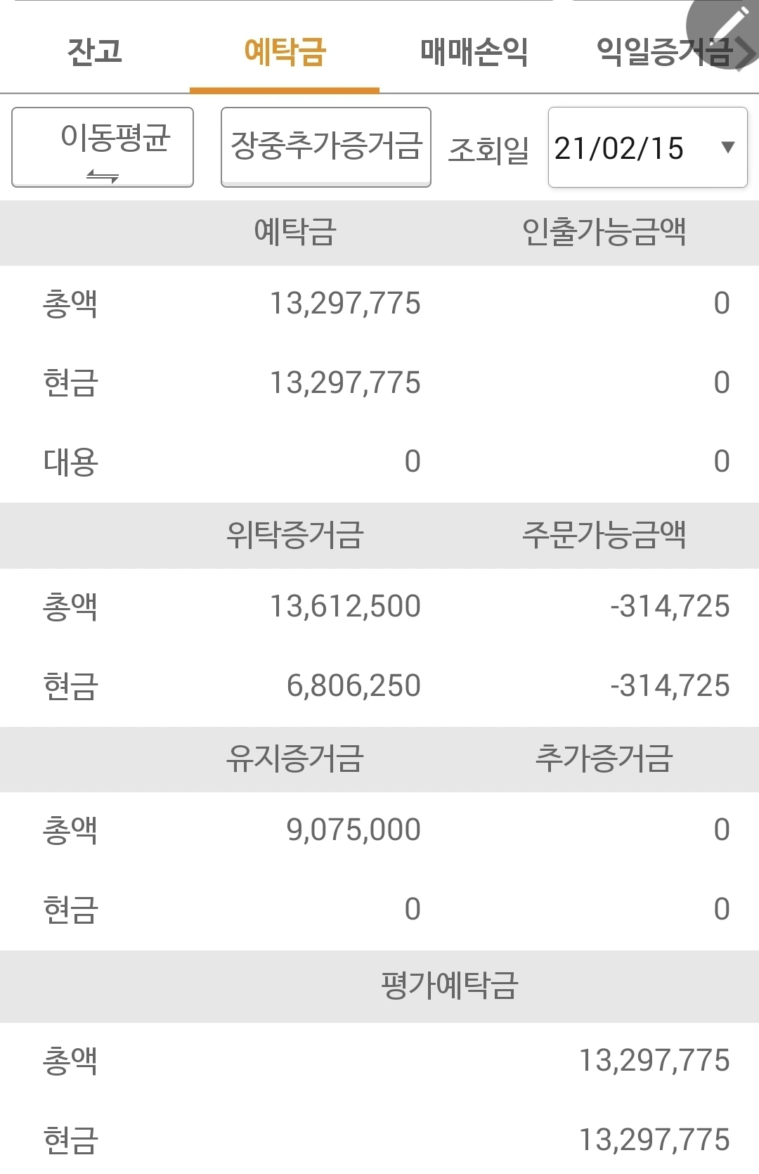 사진 3. 선물주식 예탁금. 1,329만 원이다. 순식간에 60여만 원의 손실을 냈으니 잘한 건 아니다. 사고 친 게 맞는 것 같다. 그래도 할 수 없다. 난 아무것도 몰라요. 5일선이 20일선 아래로 가면 매도할 뿐야요~ 그래. 이거 하나만 믿고 밀어붙이리. 파이팅!