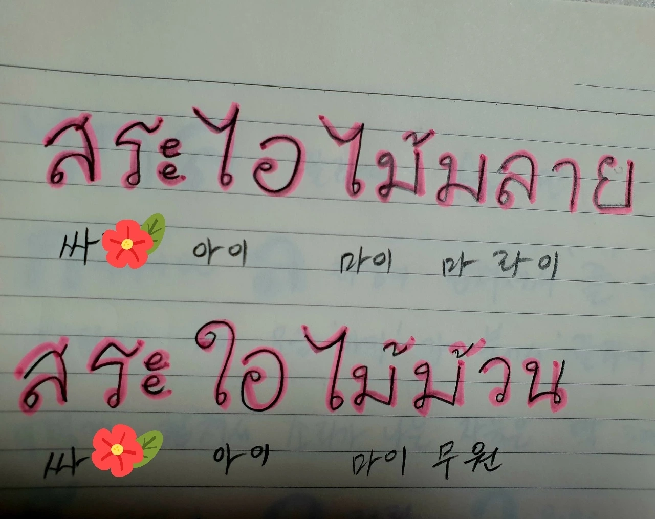 캬, 요건 조금 어렵다. 싸 아이 마이 마라이. 모음 아이인데 요건 발음은 짧게 하는 단모음이다. 그러나 모음 '아오' 에서처럼 성조를 결정할 땐 생음엔딩이 되어 미드톤 즉 평성이 된다. 꼭지 부분이 브이자 모양인 것은 싸 아이 마이 마라이. 그리고 꼭지 부분이 둥글둥글 둥근 것은 싸 아이 마이 무원. 캬~ 어렵다. 요걸 어떻게 외우노? 어쨌든 이렇게 생긴 것은 모음 아이로 아이 발음이 나고 단모음이라 짧게 발음하지만 모음 아오처럼 성조 결정 때는 장모음처럼 생각해서 생음엔딩이 된다는 것을 기억하자.