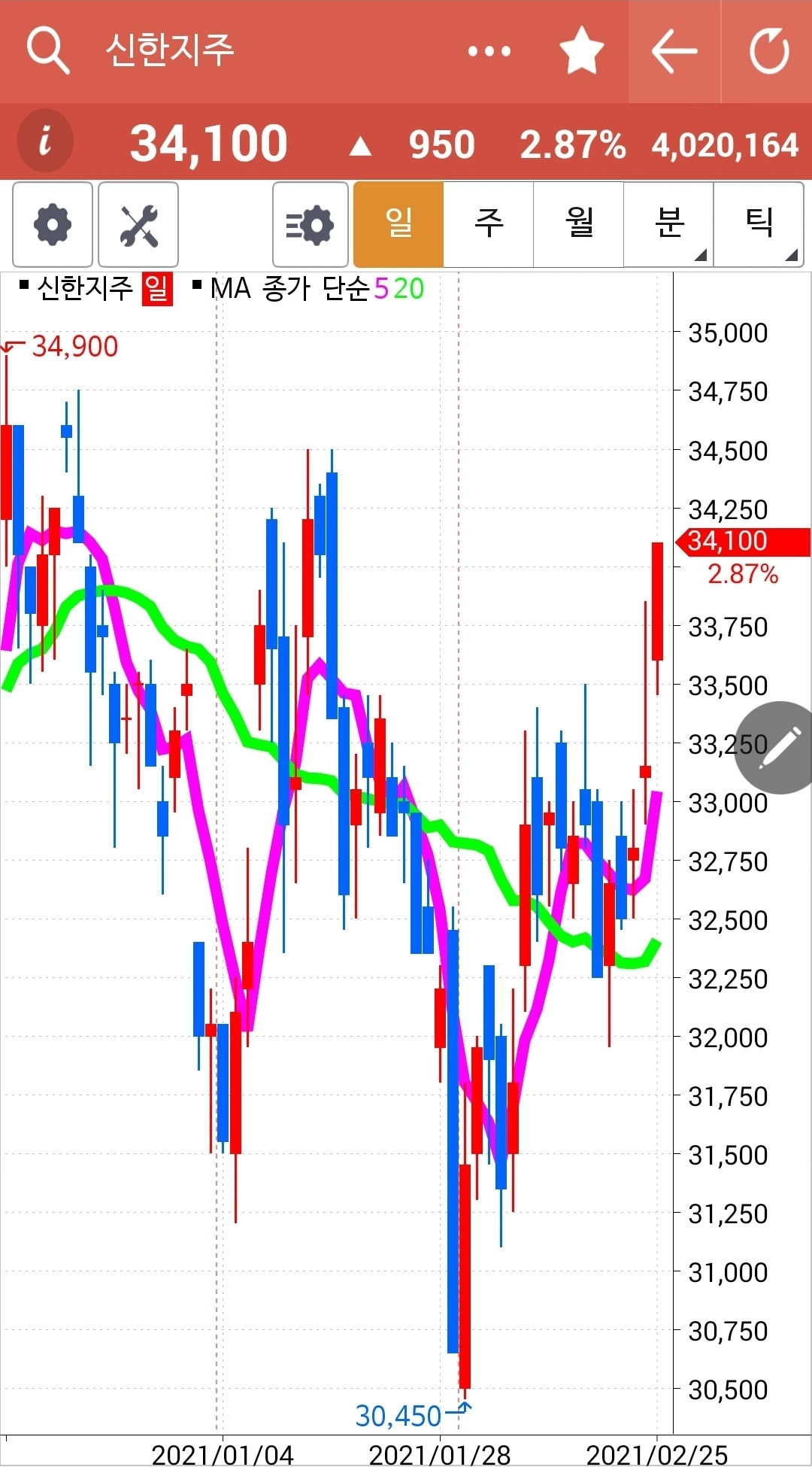 신한지주. 5일 선도 20일 선도 위를 향하고 있고 주가도 계속 전일 고점을 돌파하고 있으니 나의 손가락을 끌 밖에. 고우 고우!