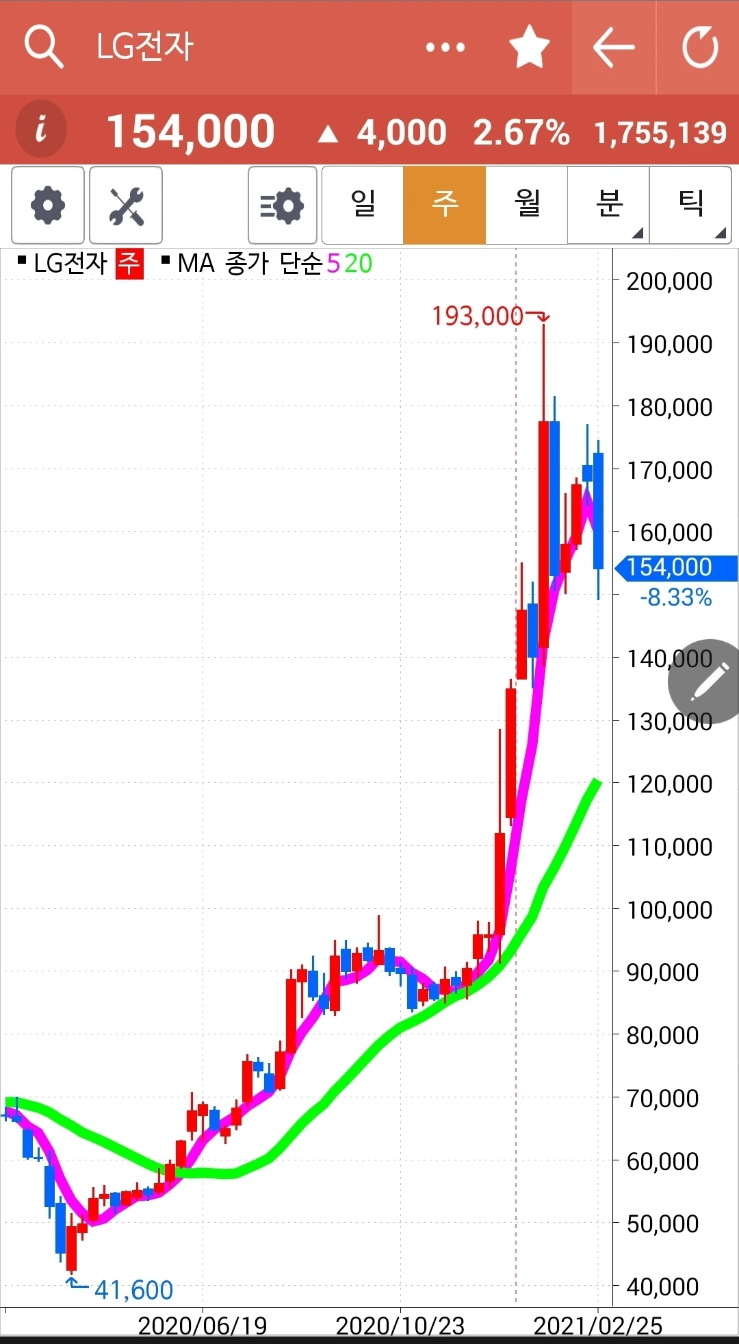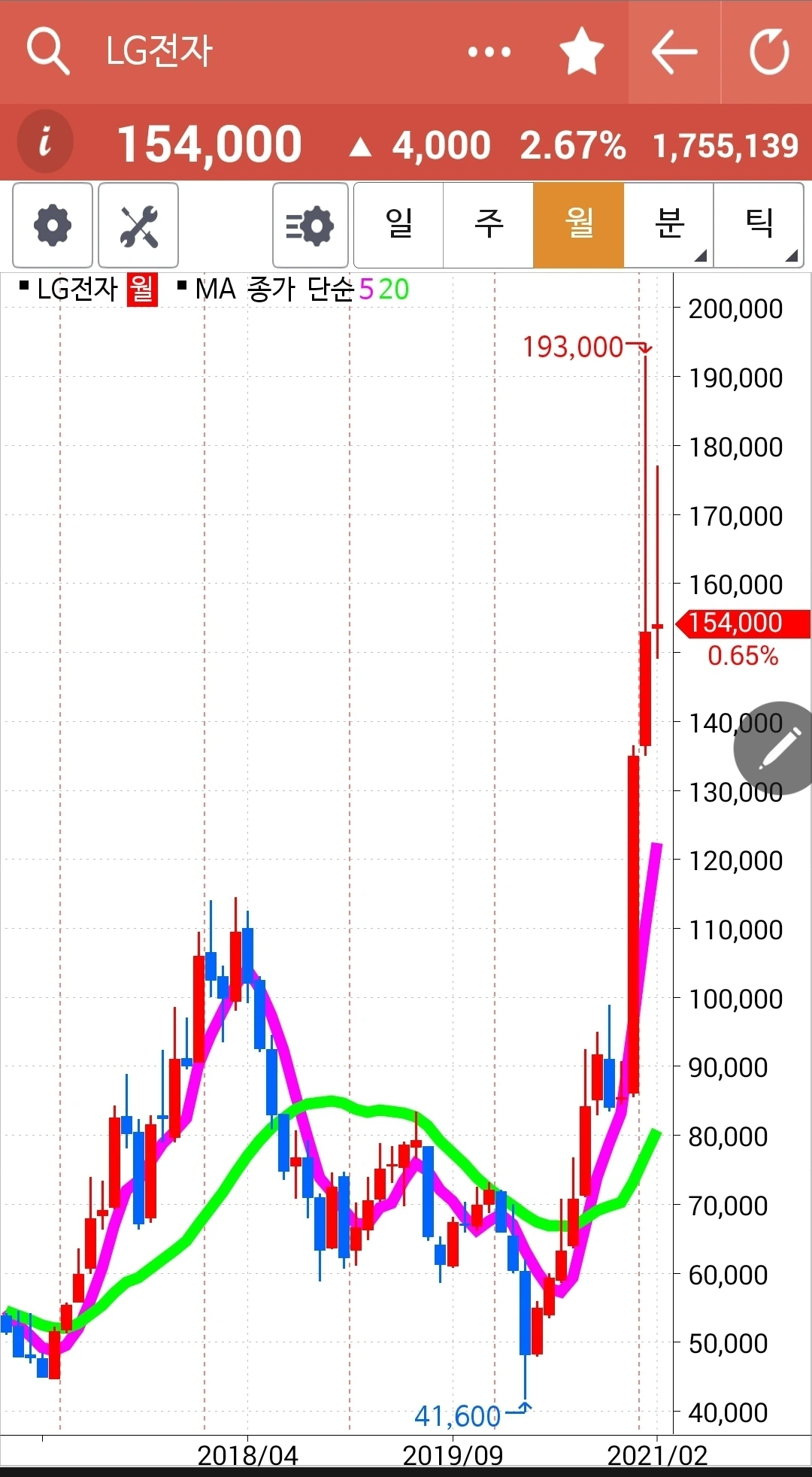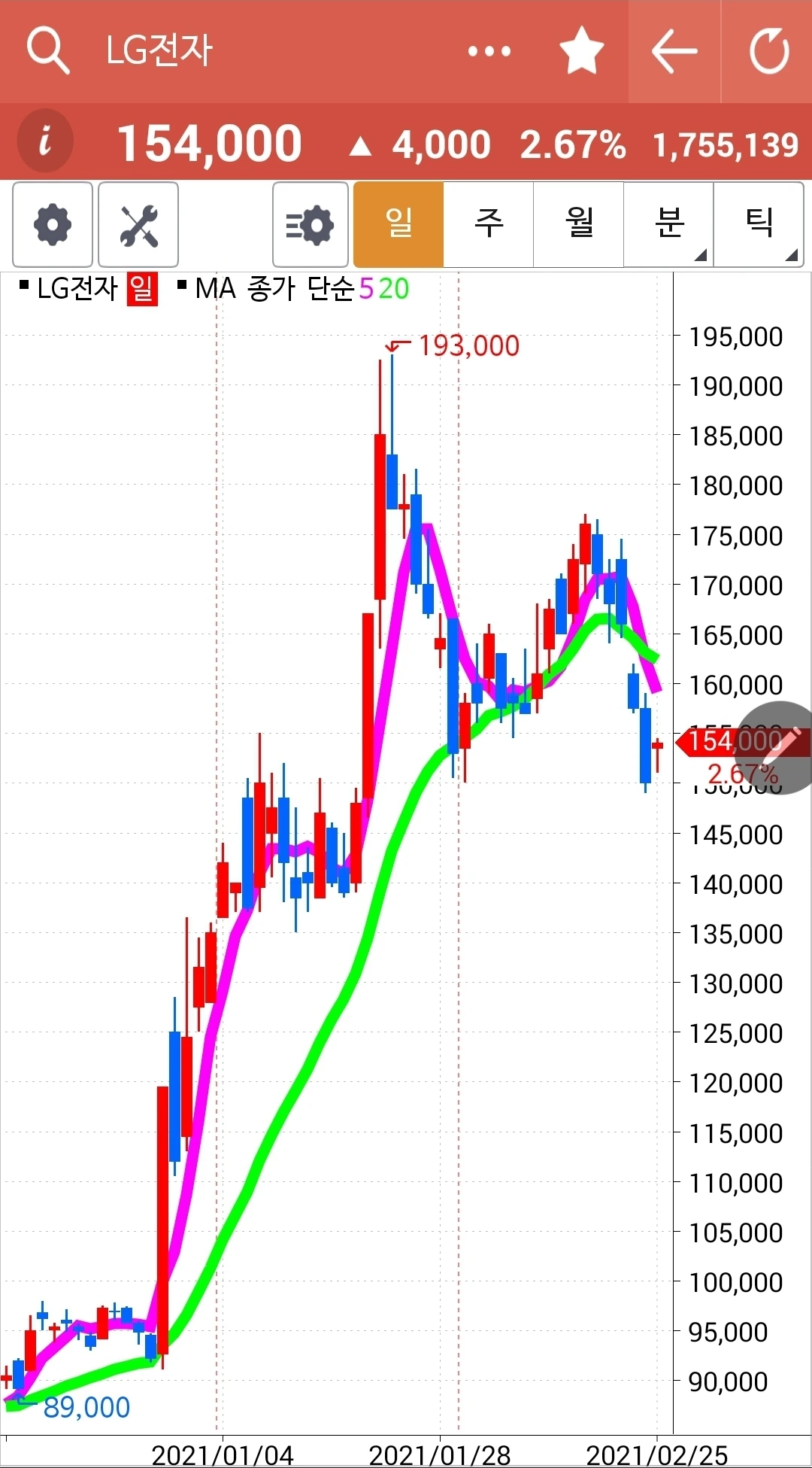 아무리 나를 약 올리며 어제 내가 매도한 가격보다 4,000원이나 오른다 한 들 차트를 보시랏. 5일선이 아주 살짝도 아니고 확실하게 20일선 밑으로 쭈욱 내려왔다. 난 이미 훈련이 잘 되어있어 이런 걸 보유하고 있을 수는 절대 없다. 흥. 나를 유혹하려면 서둘러 5일선을 다시 20일선 위로 올려놓거레이. 그럼 차가워진 나의 마음을 슬쩍 돌려줄 수도 있으니. 엣 헴