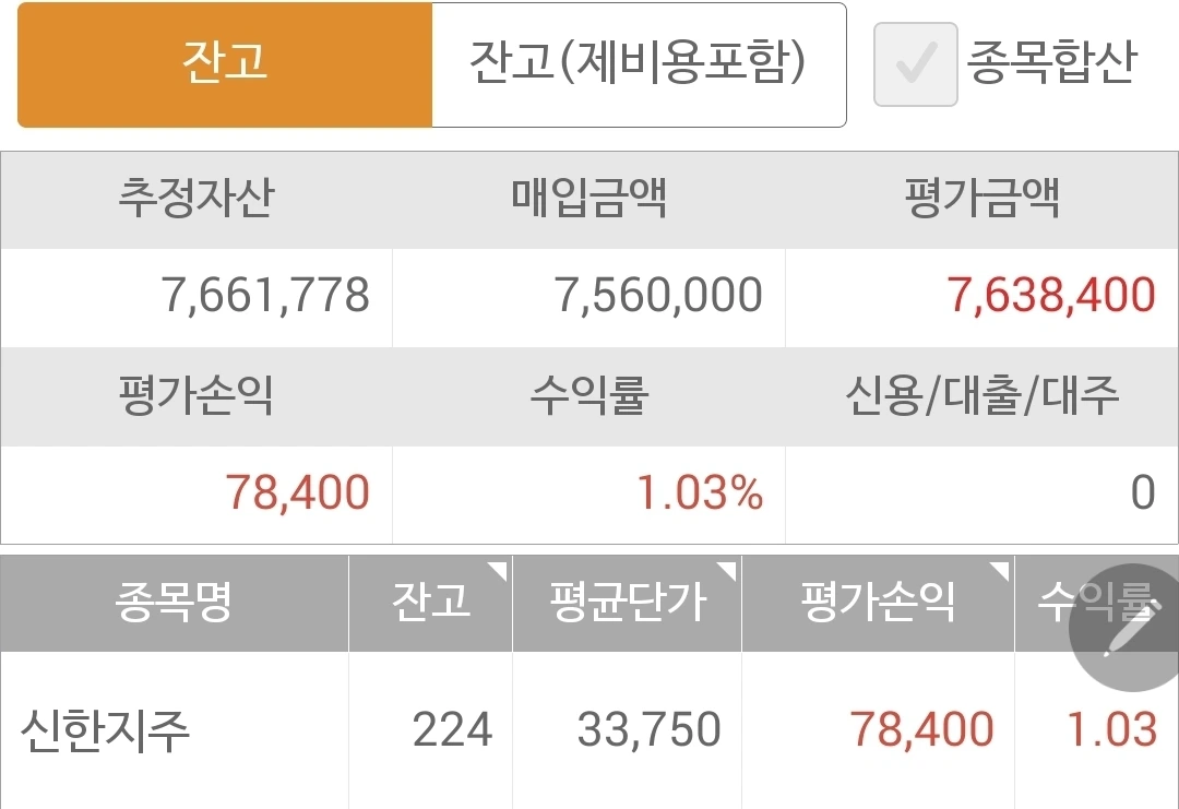 사진 1. 현물 주식. 신한지주로 빵빵하게 사 넣은 모습.