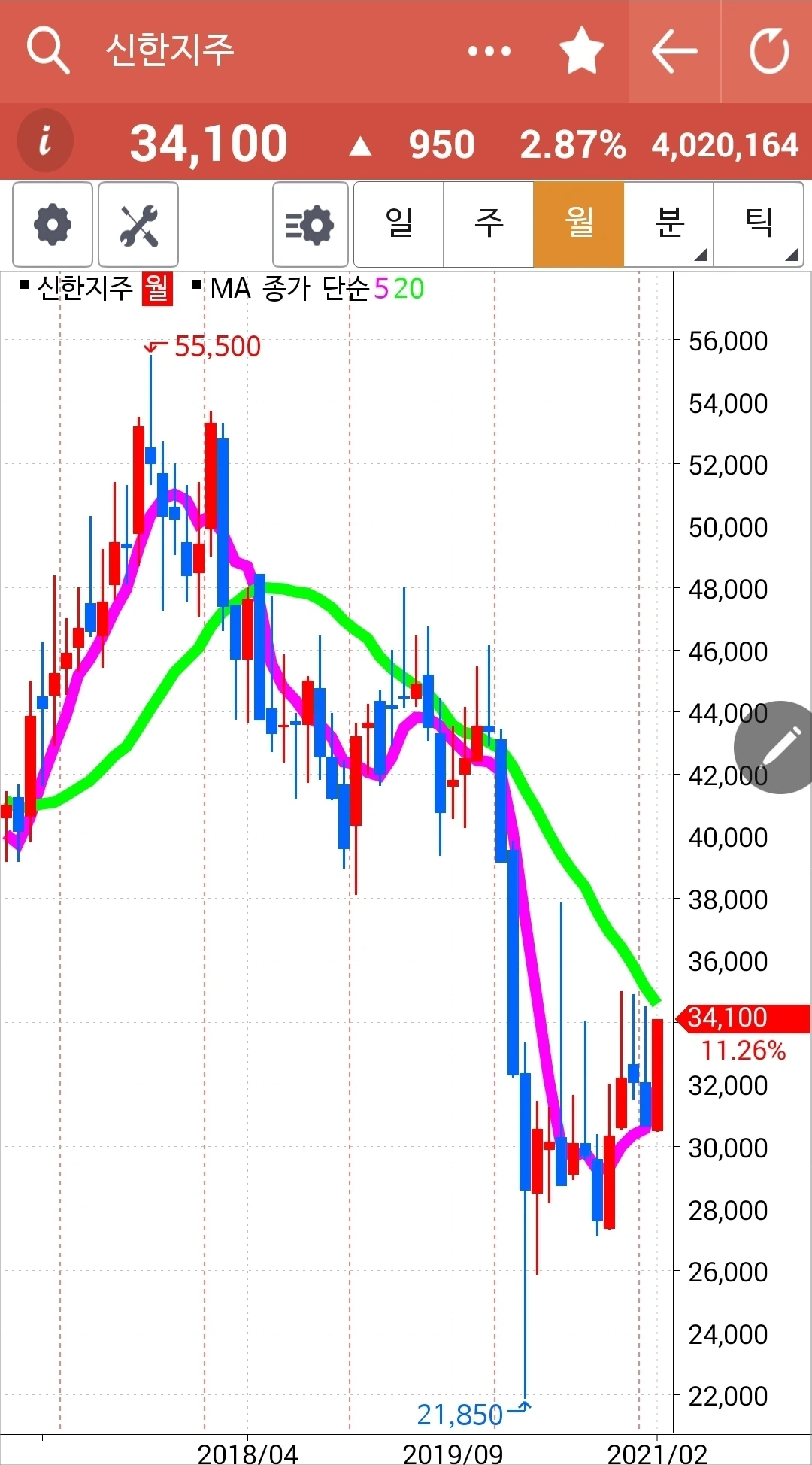 하핫. 난 그걸 세대교체라 말하고 싶다. 푸하하하 그냥 교체에는 세대라는 단어가 어울리는 것 같으니까. 일단 5일선이 20일선 밑으로 간 LG전자는 내게서 탈락했다. 그러나 보라는 듯이 쭉쭉빵빵 올라갔다. 마치 흥! 나를 탈락시켜? 두고 봐! 약 올리듯이. 그래도 할 수 없다. 5일선이 20일선 아래로 내려간 걸 가지고 있을 순 없다. 난 그걸 훈련 중이니까. 바로 요거. '난 아무것도 몰라요 5일선이 20일선 밑으로 내려가면 매도할 뿐야요~' 주야 장청 이 노래를 불러놓고 실행을 아니할 수는 없는 거니까. 그렇다면? 종합지수가 빵빵 올라가는데 탈락시킨 채 아무것도 없이 먼산만 바라본다? 노노노! 그건 또 있을 수 없는 일! 그렇지! 5일선이 20일선 위에 있는 걸 고르면 된다! 그래서 후보에 오른 게 몇 개 되지만 나의 손을 이끈 건 신한지주. 그래 거기 또 몰빵이다.