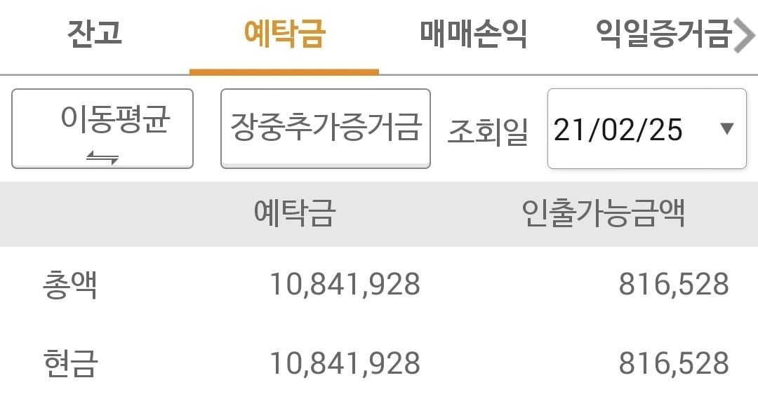 사진 3. 선물 주식 예탁금. 1084만 원이다. 나의 최고 수익 1600만 원이 여전히 눈에 아른아른. 다시 그 수익을 쟁취하려 달려가즈아~ 푸하하하