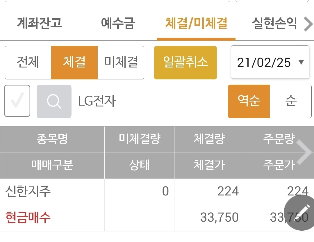 사진 2. 현물 주식 매매현황. 신한지주를 33,750원에 돈 되는 대로 몽땅 사놓은 모습.