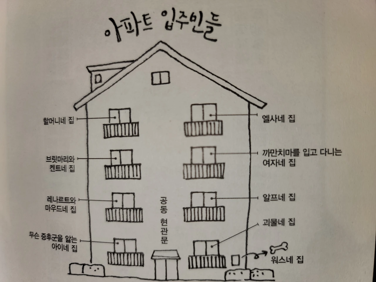 맨 앞 장에 나와있는 엘사네 아파트 입주민 표. 알프? 어디 살더라? 책을 읽다 낯선 이름이 나오면 맨 앞장으로 휘리릭 넘겨 이 입주민 표를 참고하게 된다. 오호 2층이었구나. -이렇게.