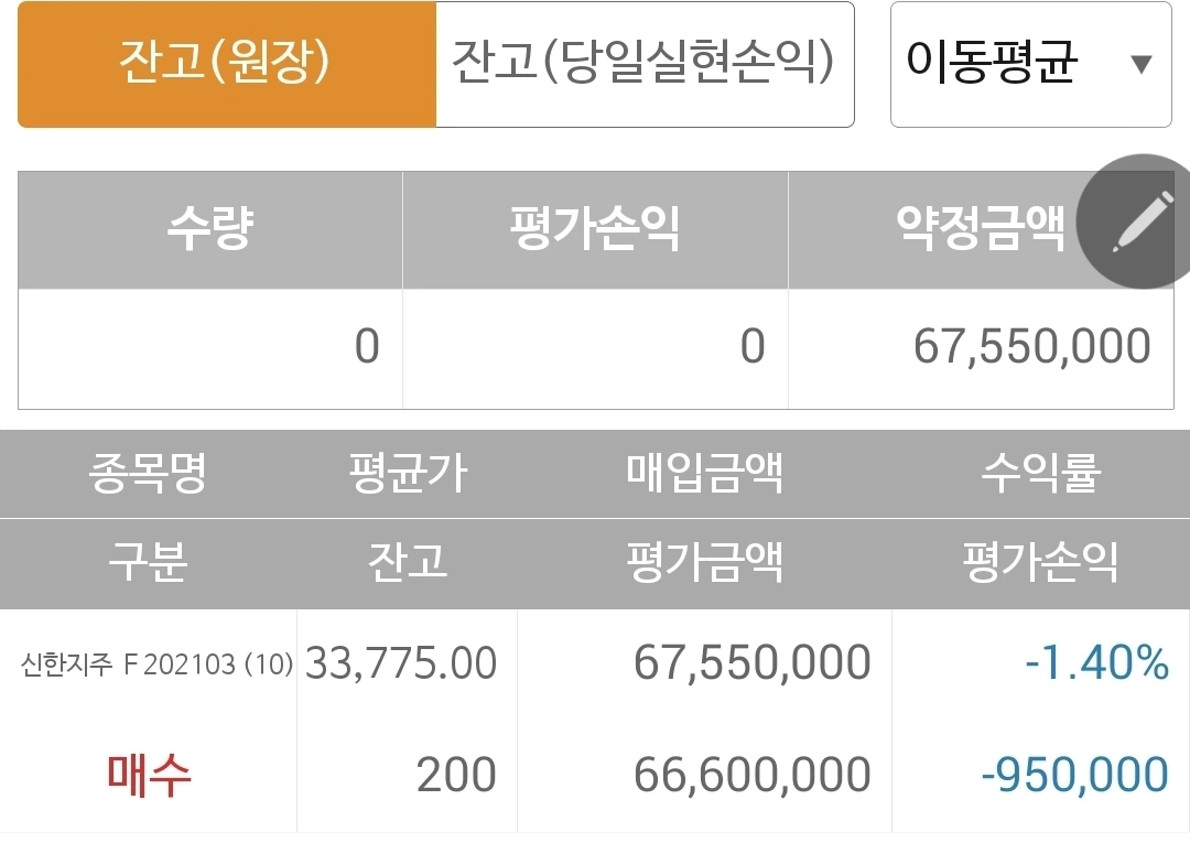 사진 2. 선물 주식. 이곳 역시 신한지주로 빵빵하게 채워놓았다. 분산투자를 해야 하지 않을까? 그러나 나의 손가락은 그저 한 개만 골라내 집중 공략하고 있다. 참 멋진 모습일 때 올라탔으나 그 후 긴 음봉 작은 음봉을 보여주며 영 매력적이지 않다. 그래도 할 수 없다. 난 5일선이 20일선을 꽝! 뚫으며 내려올 때만 매도할 수 있으니까.