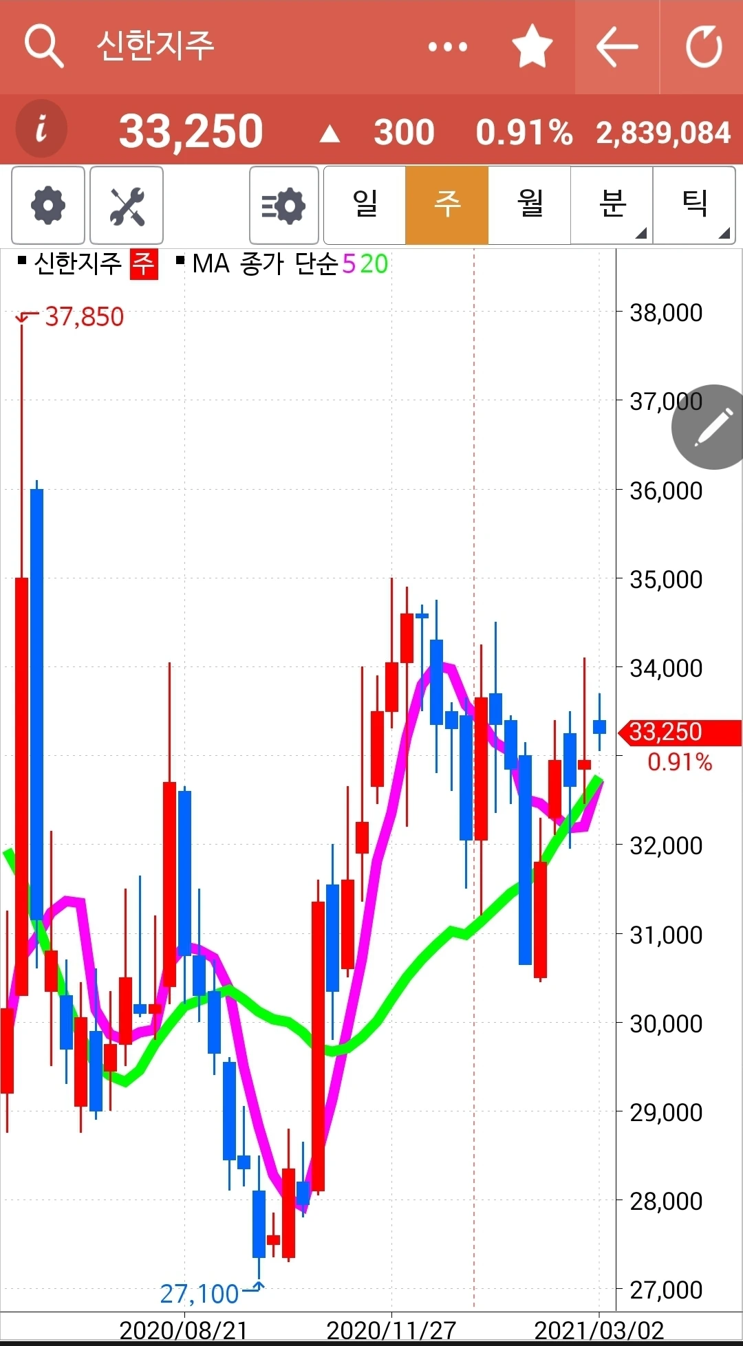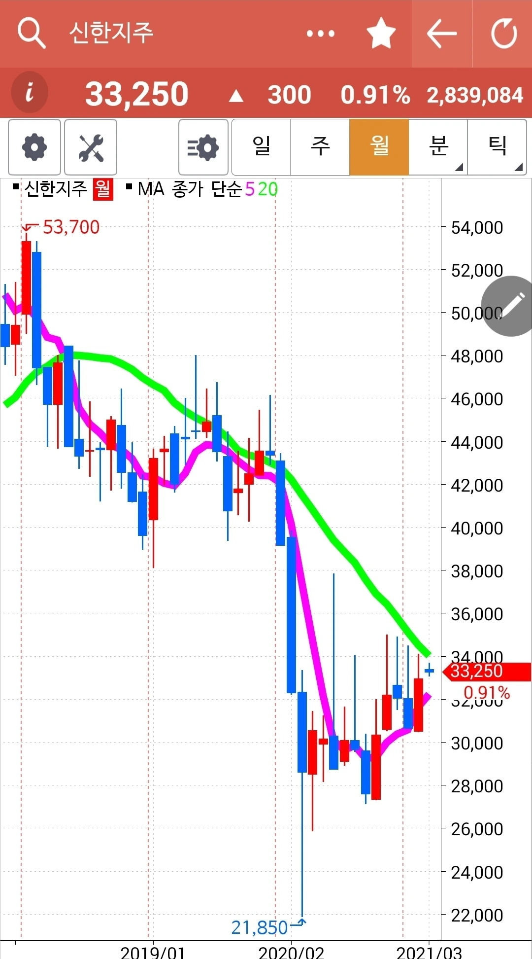 새로 낯을 익히고 있는 신한지주. 어떡하다 요 거이 내 손에 들어왔을까? 관심종목을 쭈욱 훑던 중 빵빵 차고 올라가는 모습에 폭 빠져 정신없이 사넣었는데 내가 사는 걸 마치자마자 보란 듯이 곤두박질치고 있으니 하이고 정말 하이고 오오오다. 그래도 어쩌랴. 난 원칙을 지키는 중이고 나의 원칙에 위배되는 건 아니니까 그저 매수 유지를 하고 있을 뿐이다. 주봉에서 5 주선이 20 주선을 뚫고 올라갈 듯하므로 희망을 갖고 월봉에서 5개월선이 20개월선을 향해 올라가 뚫을 듯도 싶으니 또한 희망을 가져보자. 그래도 월봉에서 아직 20개월선이 아래를 향하고 있으니 그렇게 쭉쭉빵빵 올라가진 못할 수도 있다. 그러나 낙폭과대란 또 큰 호재 아닐까. 이렇게 월봉이 완전히 돌아서지 않은 종목이 어떻게 진행하는지 앞으로 잘 지켜보도록 하자. 그러나 그 모든 것은 지켜볼 뿐 언제고 5일선이 20일선을 뚫고 내려오면 매도하는 거다. 오케이. 그것만 할 줄 알면 된다. 파이팅!