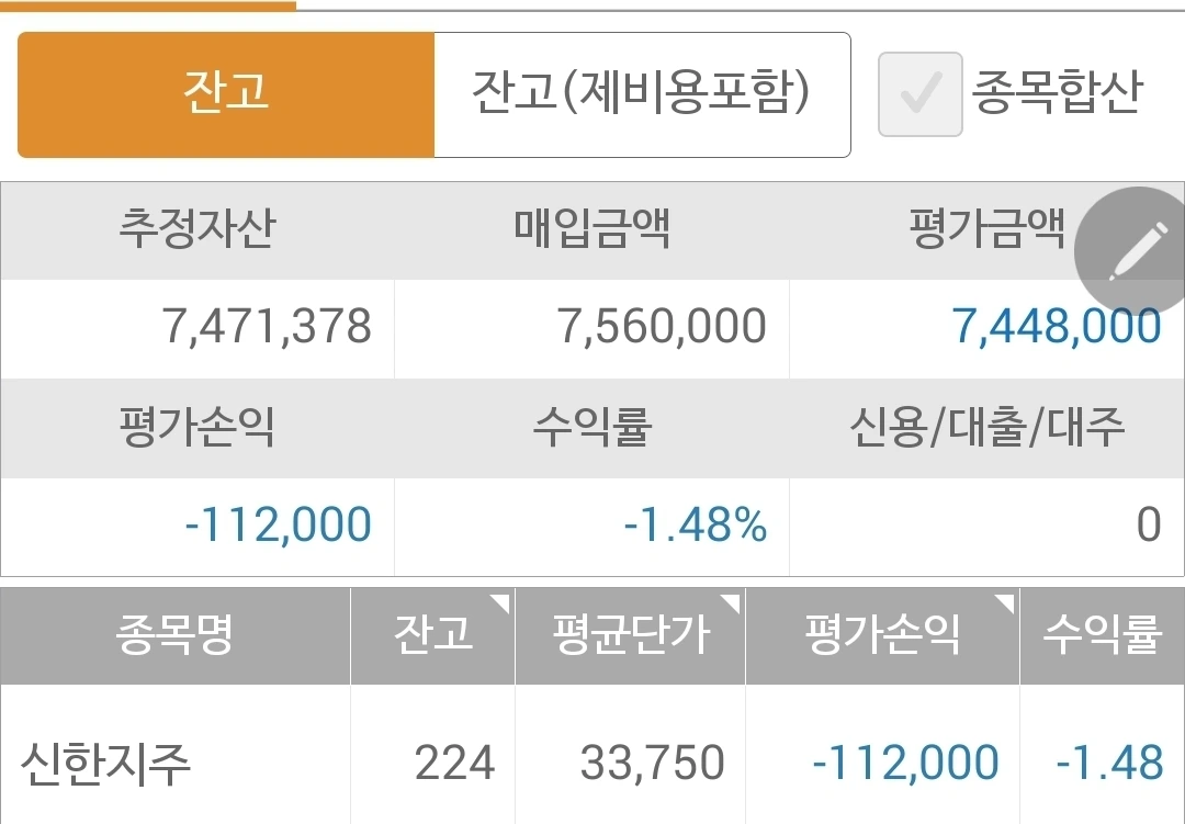 사진 1. 현물 주식. 신한지주로 빵빵하게 채워져 있는 계좌. 740만 원이다. 500 투자금액이니 그래도 수익이다.