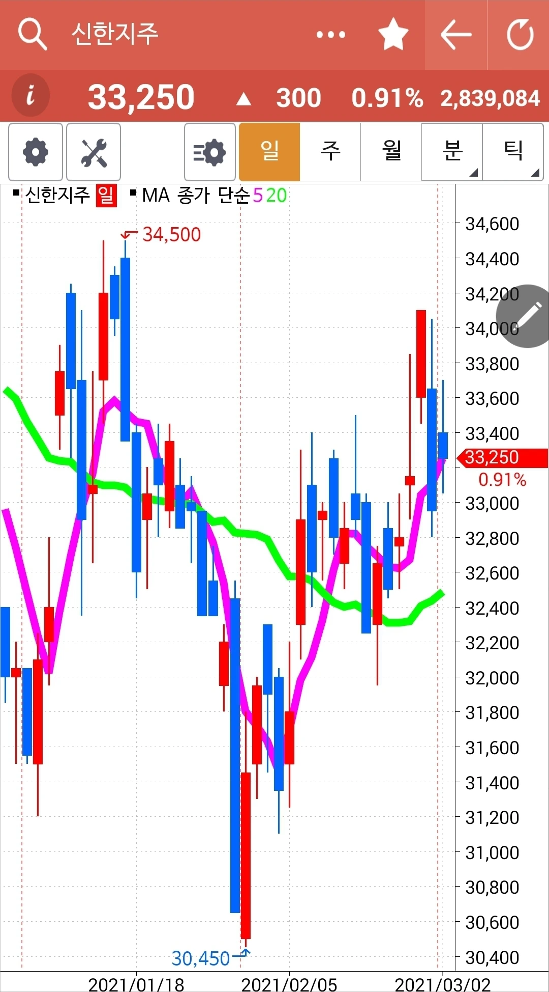 하하 신한지주조금 푸하하하 신한지주가 조금 올랐을 뿐이다라는 말이다. 제목에 더는 안 들어가기에 띄어쓰기도 않고 줄줄이 붙여서 신한지주 조금이라고 썼다. 어쨌든 올랐으니 5일선이 20일선을 돌파하고 내려간 것은 아니고 그러므로 나는 해야 할 일이 하나도 없다. 와이? 난 오로지 요것 하나만 알고 있으니까. 바로 요거. '난 아무것도 몰라요 5일선이 20일선 아래로 내려가면 매도할 뿐야요~' 푸하하하